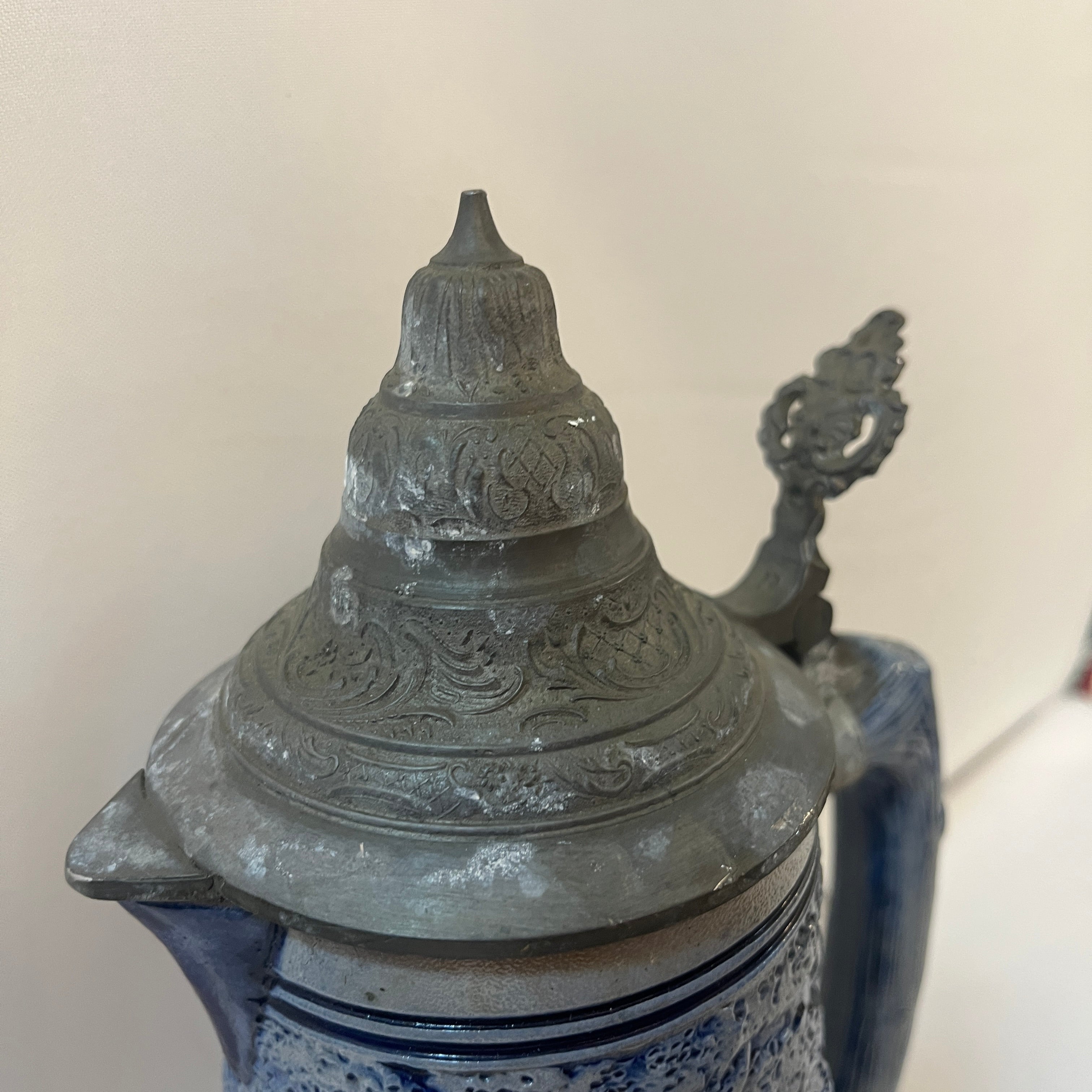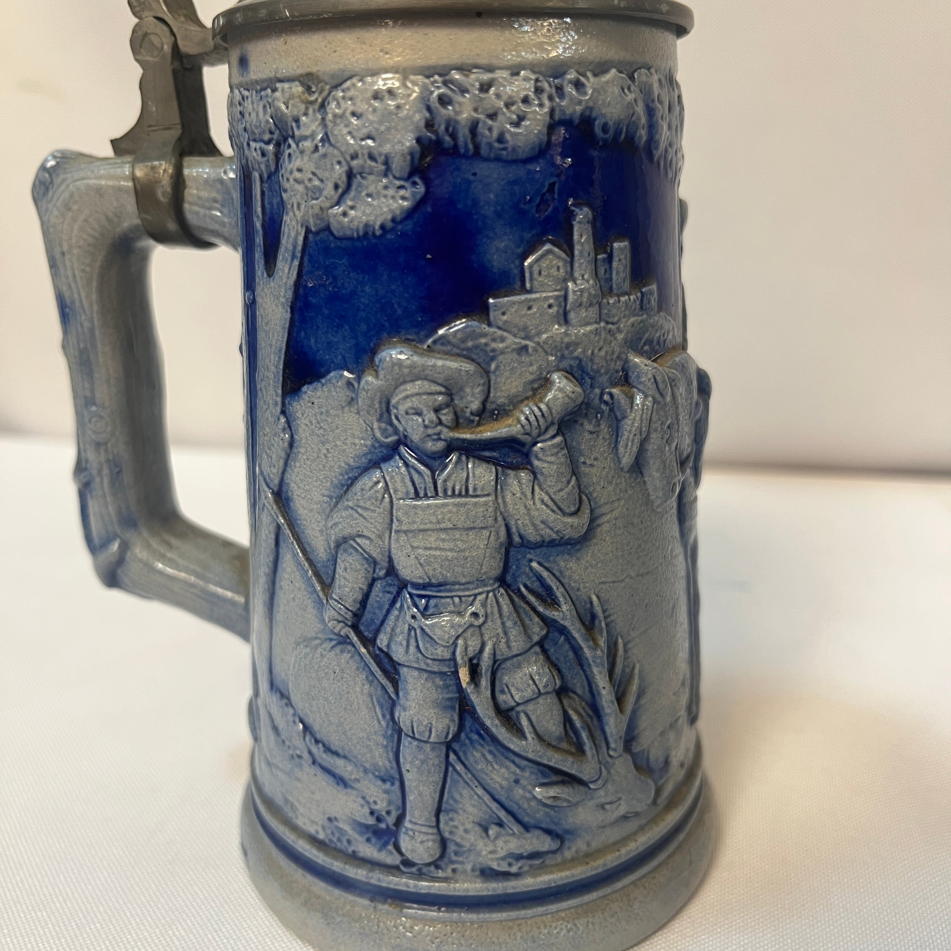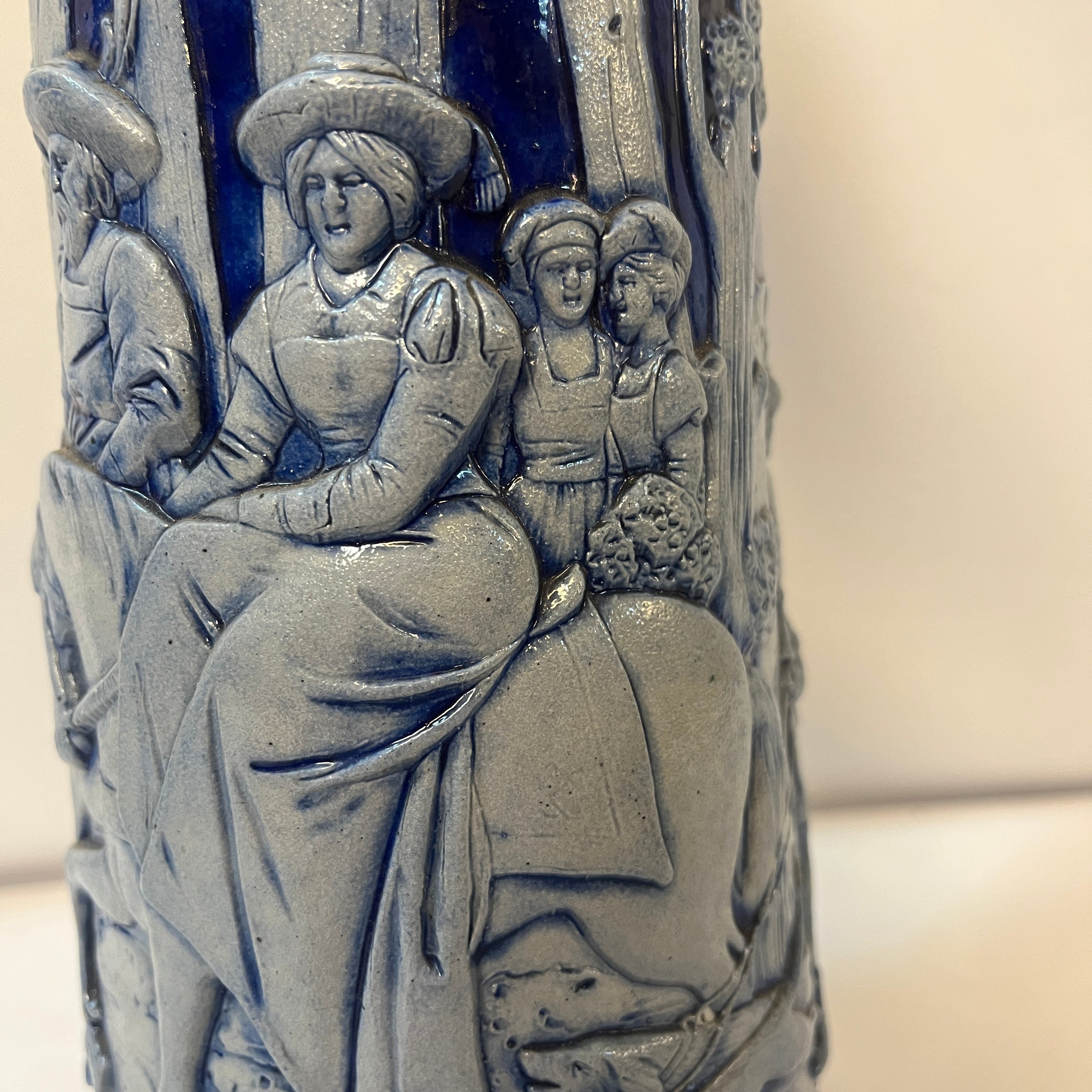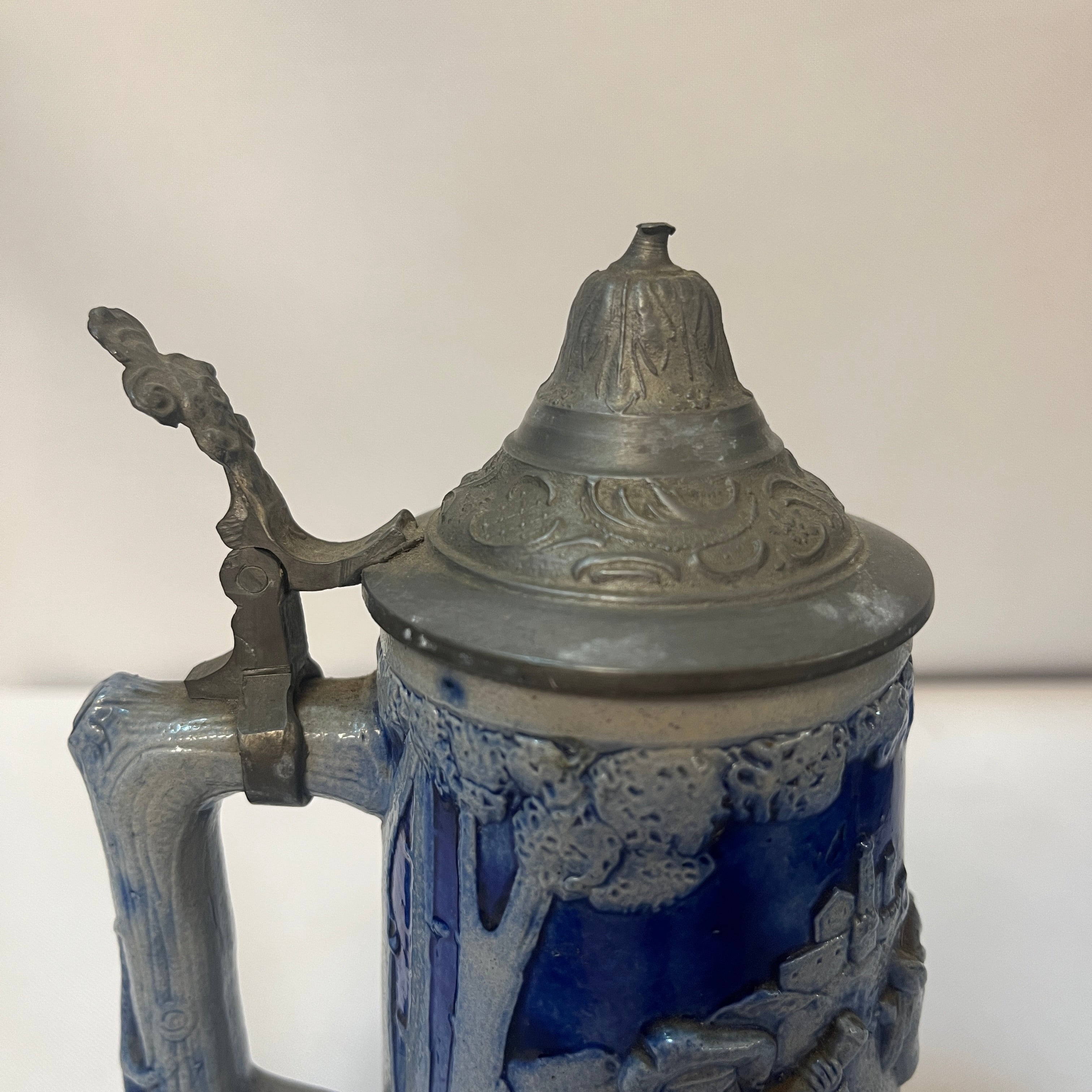 Tradicional conjunto alemán de jarras de cerveza, compuesto por una imponente jarra de gran formato con capacidad de 2 litros, acompañada por cinco jarras individuales más pequeñas de 250 ml. Las piezas están elaboradas en cerámica de gres, con un elegante acabado en azul cobalto que resalta los detalles decorativos, los cuerpos presentan escenas de la vida cotidiana modeladas en alto relieve. Cada jarra incorpora tapa abatible de peltre ornamentado.