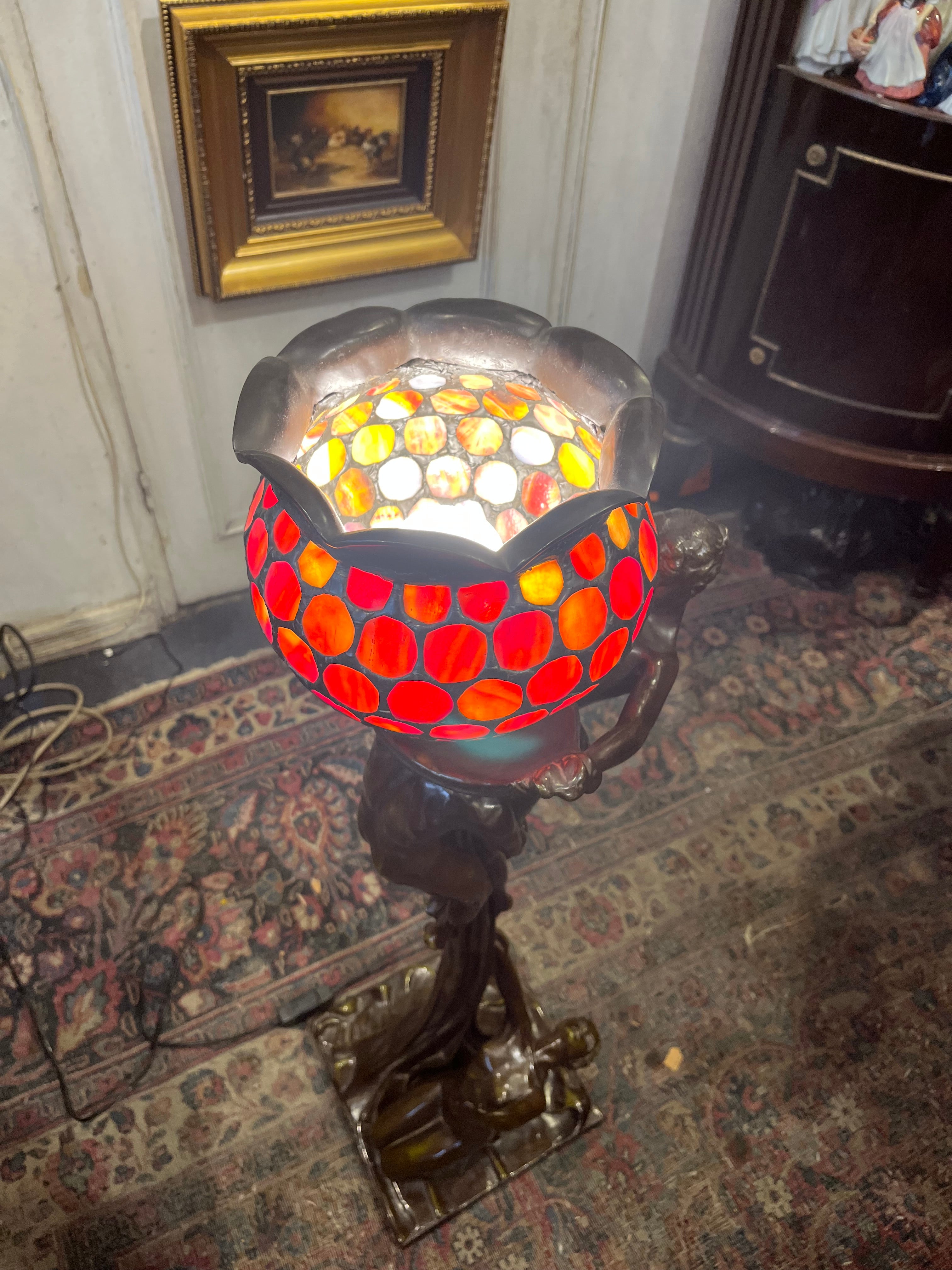 Beautiful European Art Nouveau lamp, made of bronze. The piece features a bronze-framed shade and small round red glass mosaics.
