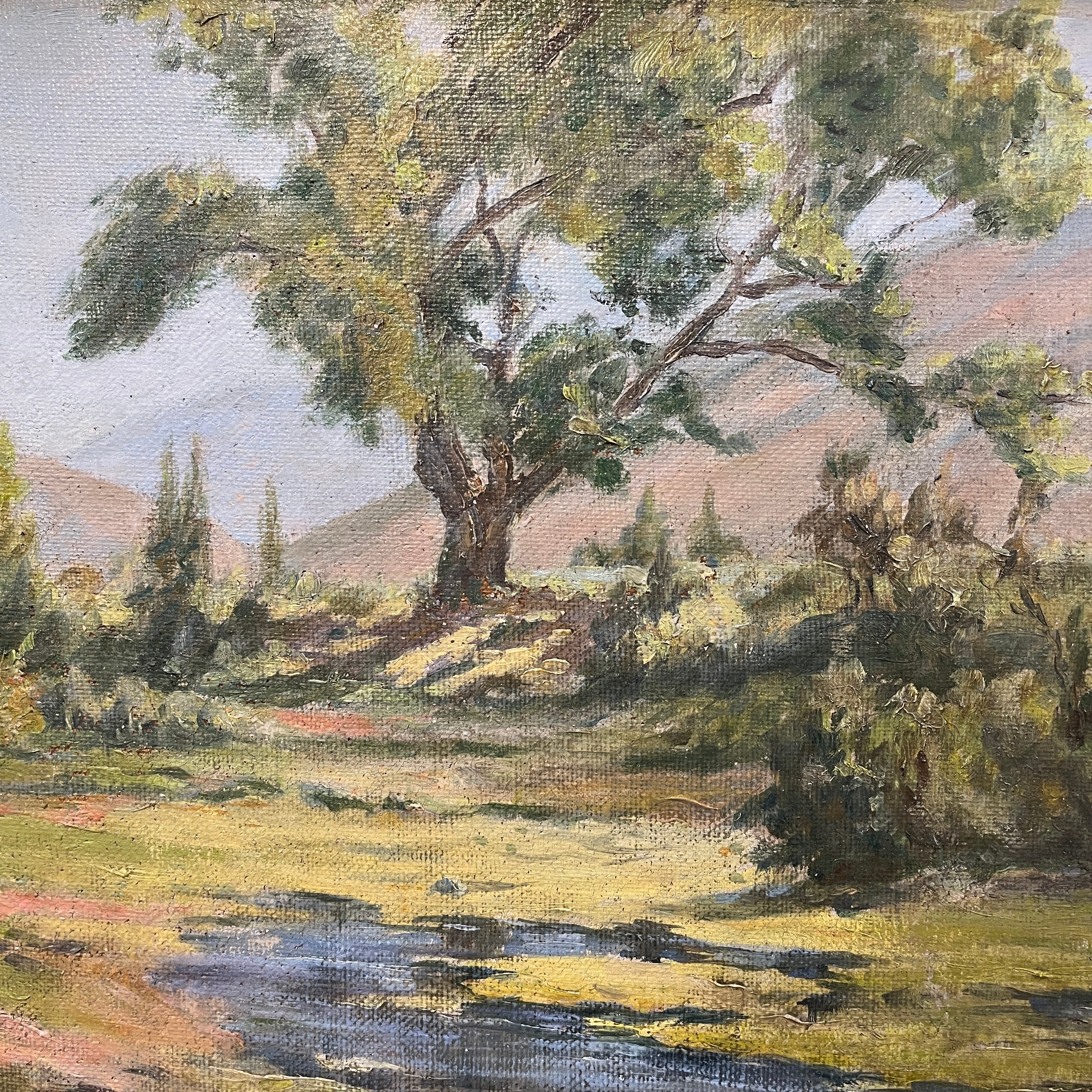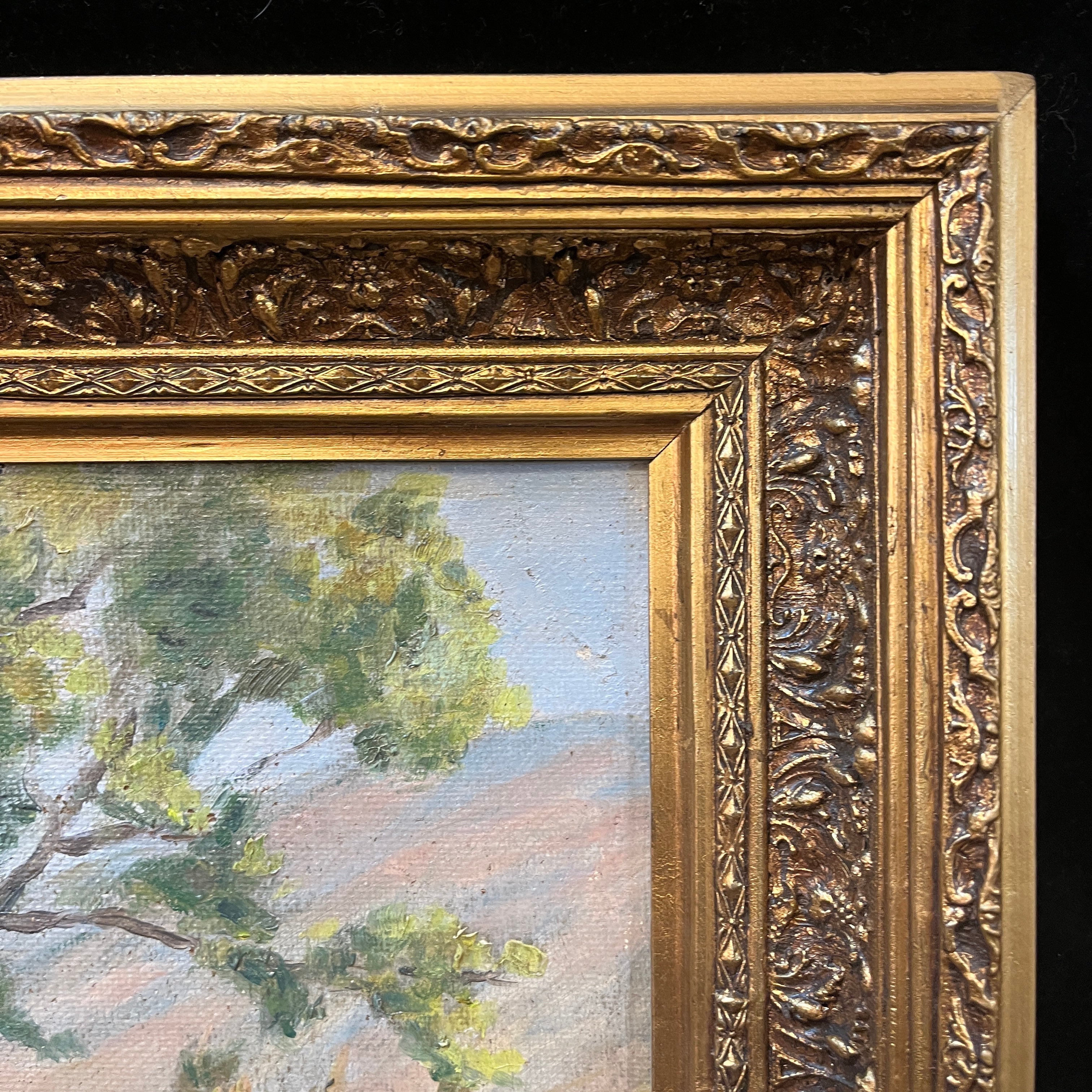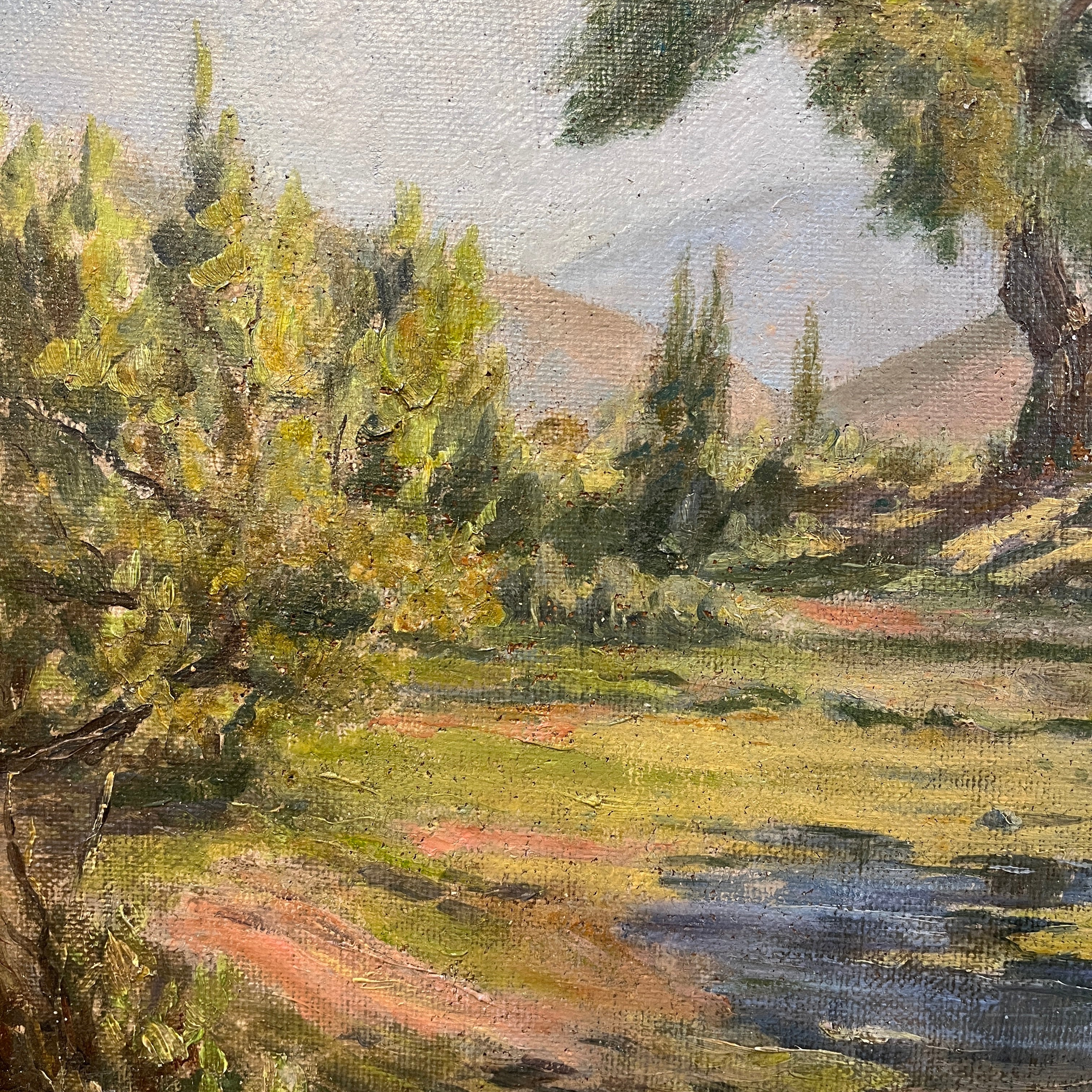 Hermoso óleo sobre tela del artista chileno Luis Lazzaro, representando un terreno bajo y con presencia de agua en el campo chileno conocido popularmente como "vega" o "veguita". La obra cuenta con un marco de madera y yeso pintado de dorado.
