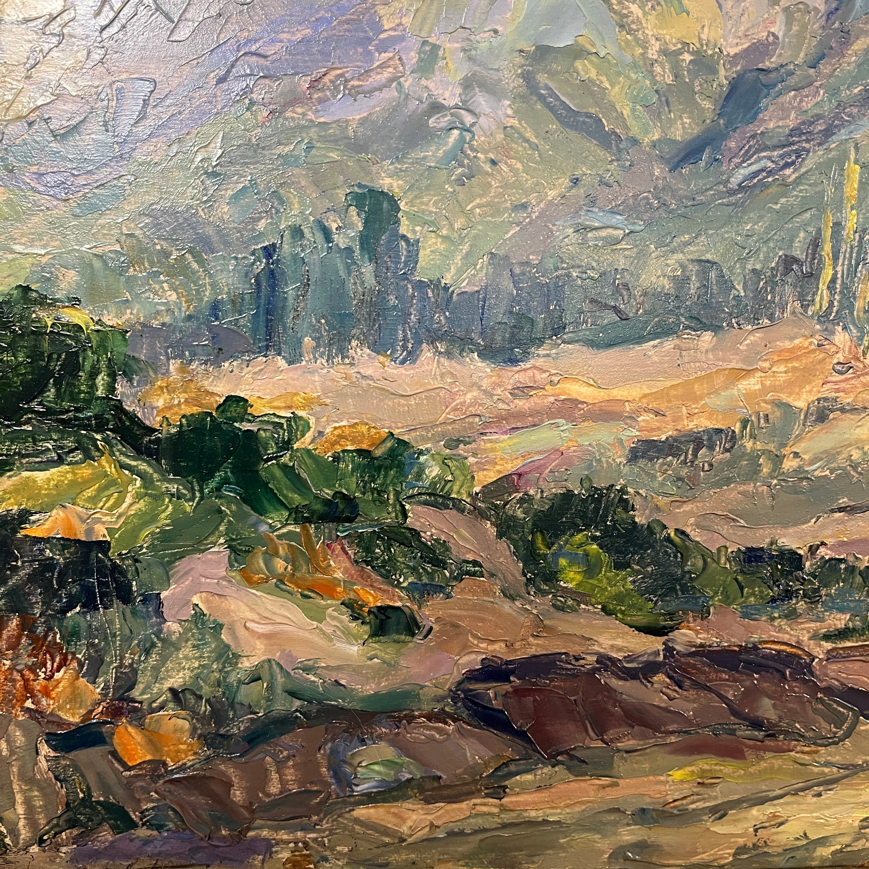 Atractiva pintura del reconocido pintor chileno Luís Strozzi. Podemos apreciar un paisaje montañoso, con un luminoso cielo celeste, verde vegetación y cálidos tonos en las montañas. También resaltan diversas capas de esta escena con una marcada pincelada que logra entregar una belleza única del mundo rural
