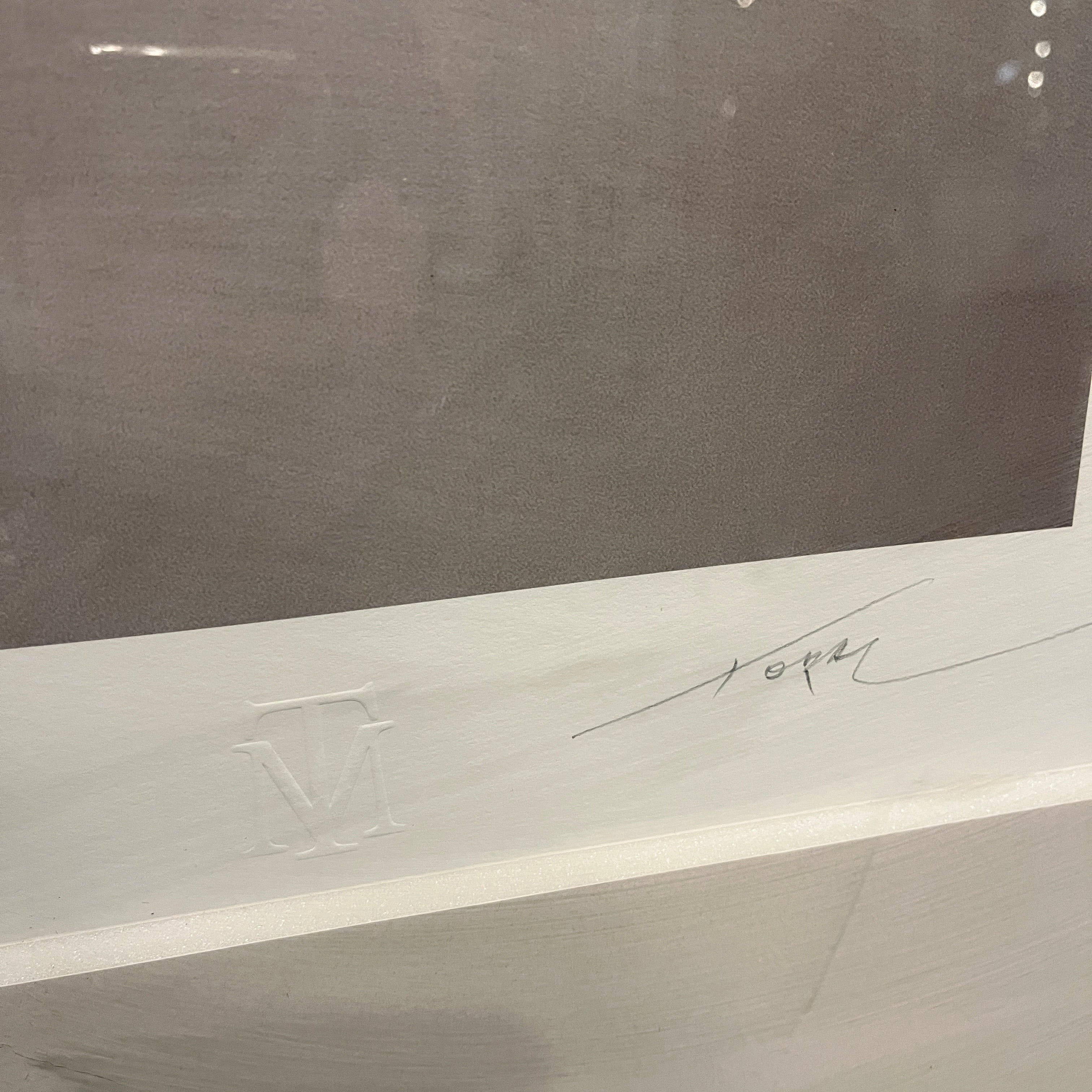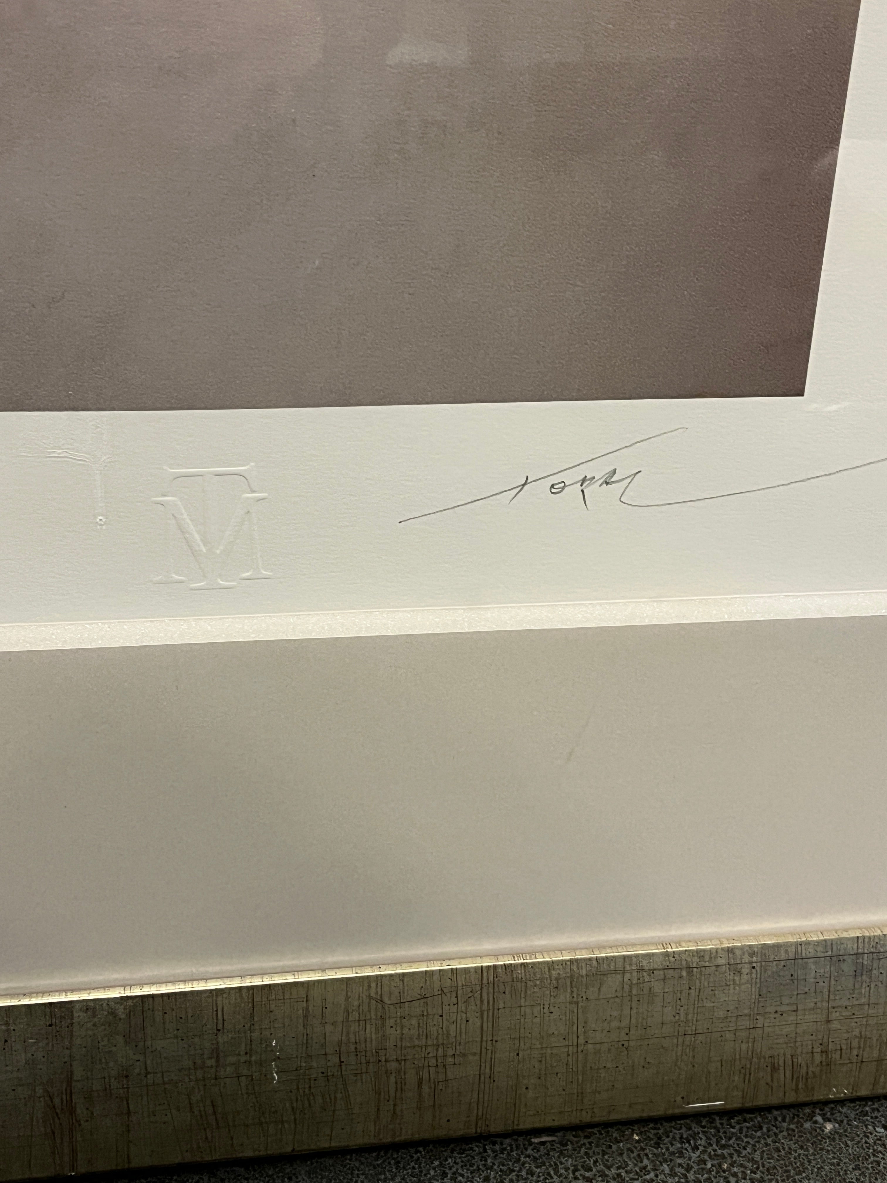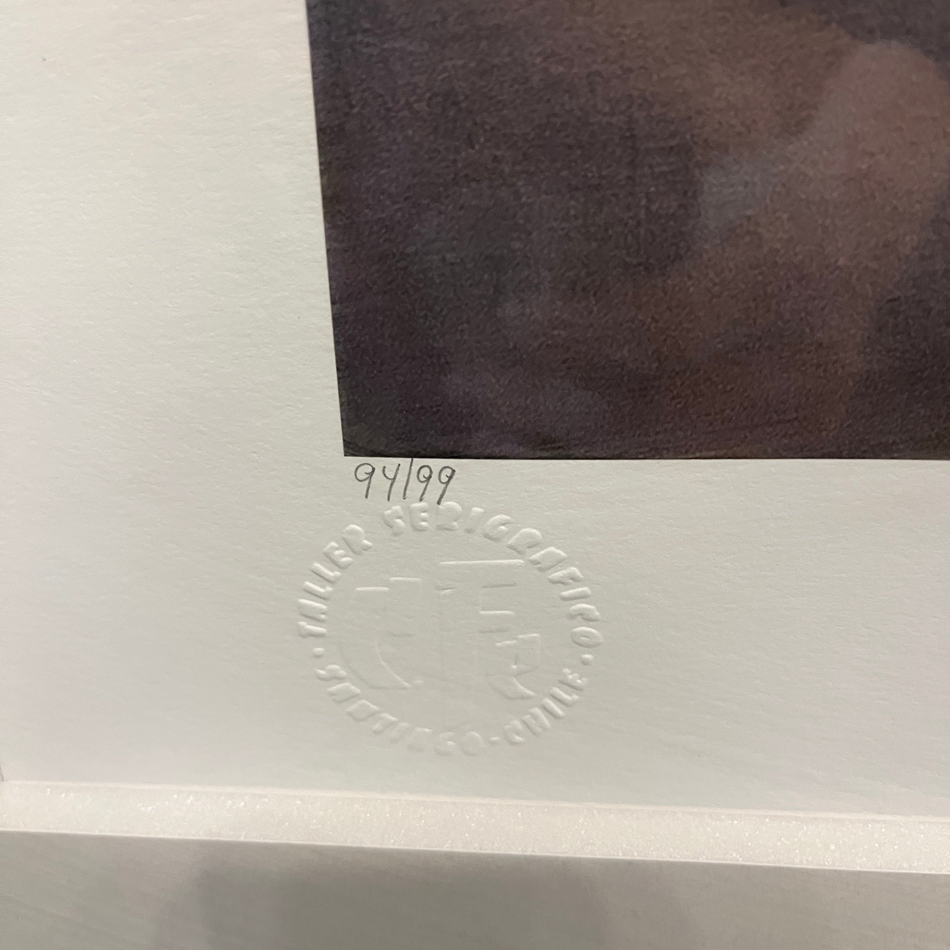 Grabado digital en técnica Giclée sobre papel de algodón, del reconocido artista nacional Mario Toral titulada ‘En el Espacio’. Firmada a mano y numerado. Ejemplar 94/99. La obra, con las reconocibles temáticas y formas del artista, muestra abstracciones de la figura humana entremezcladas con elementos geométricos, de color amarillo y dorado, suspendidos en un espacio gris. La obra tiene un marco de madera de color plateado.