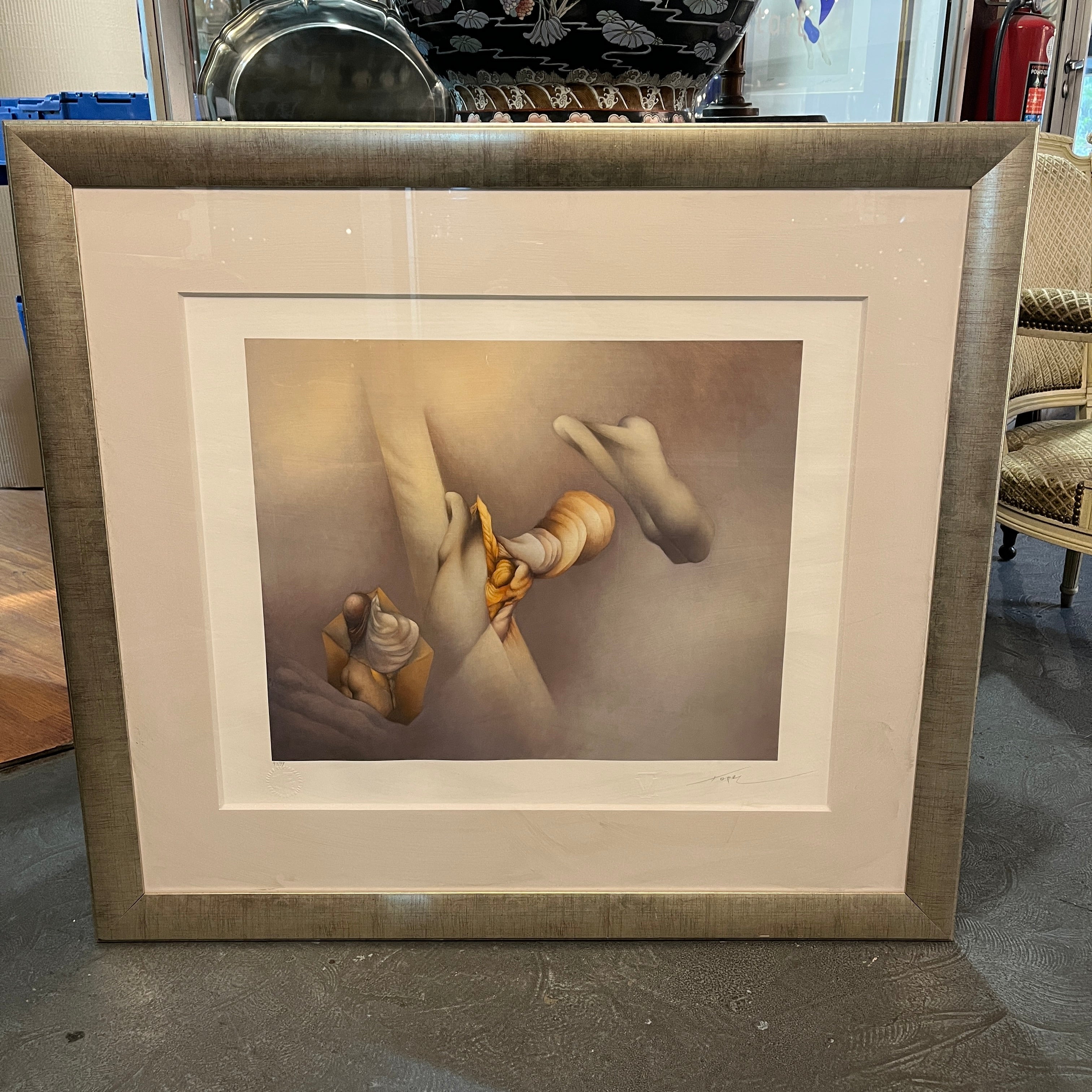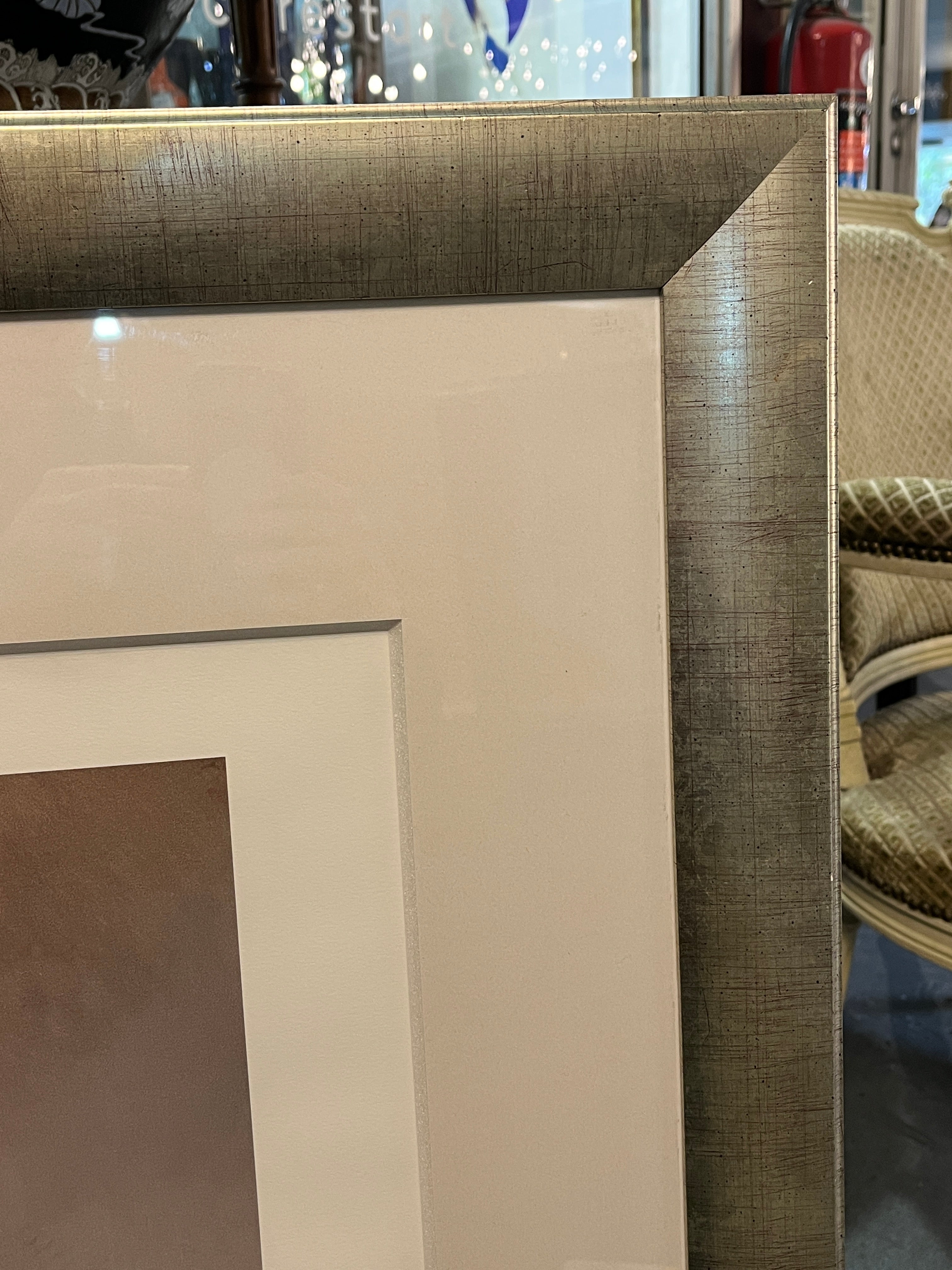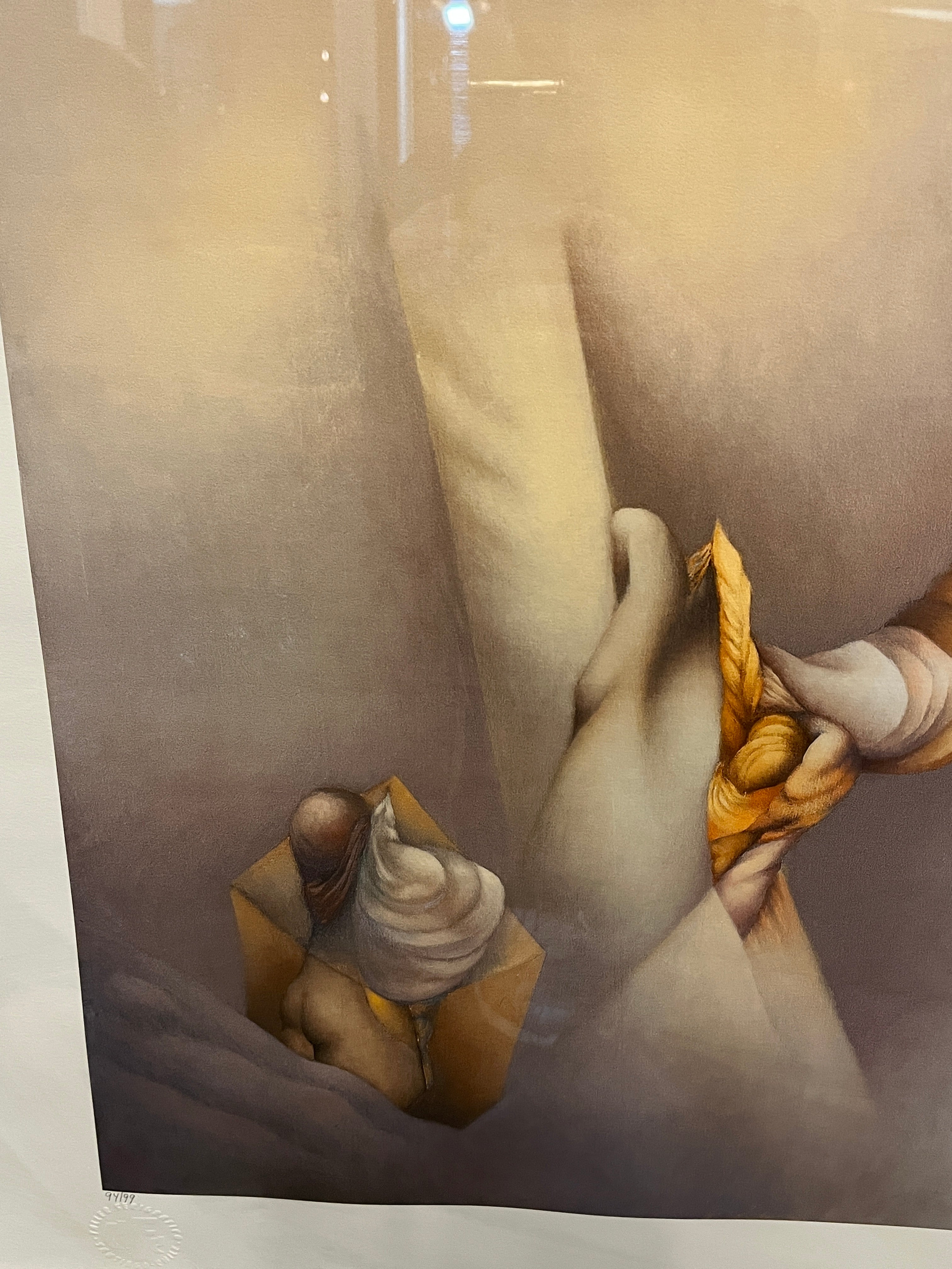 Grabado digital en técnica Giclée sobre papel de algodón, del reconocido artista nacional Mario Toral titulada ‘En el Espacio’. Firmada a mano y numerado. Ejemplar 94/99. La obra, con las reconocibles temáticas y formas del artista, muestra abstracciones de la figura humana entremezcladas con elementos geométricos, de color amarillo y dorado, suspendidos en un espacio gris. La obra tiene un marco de madera de color plateado.
