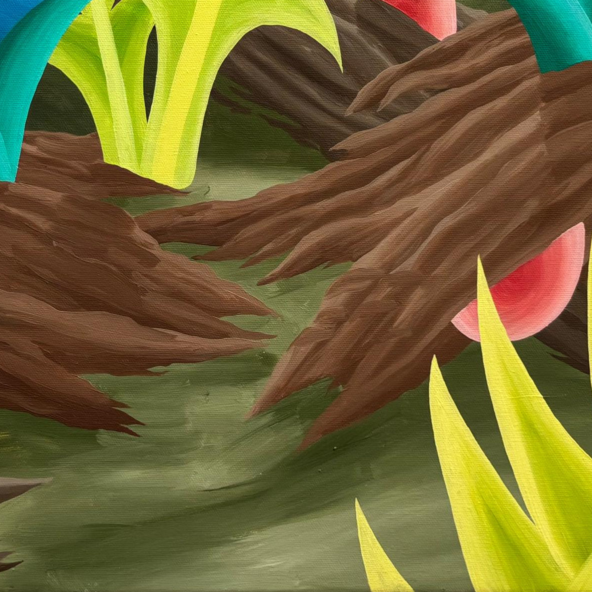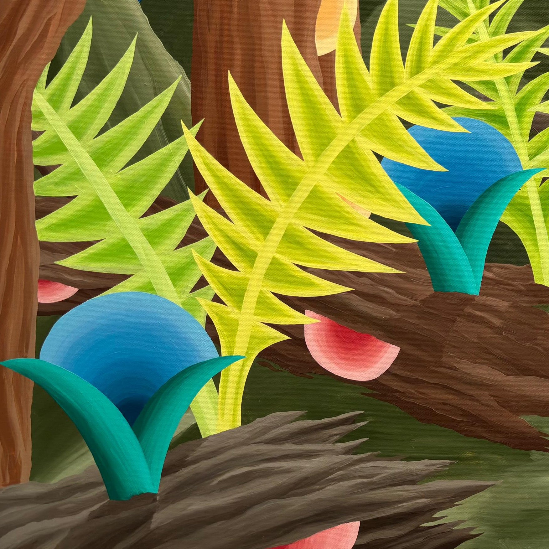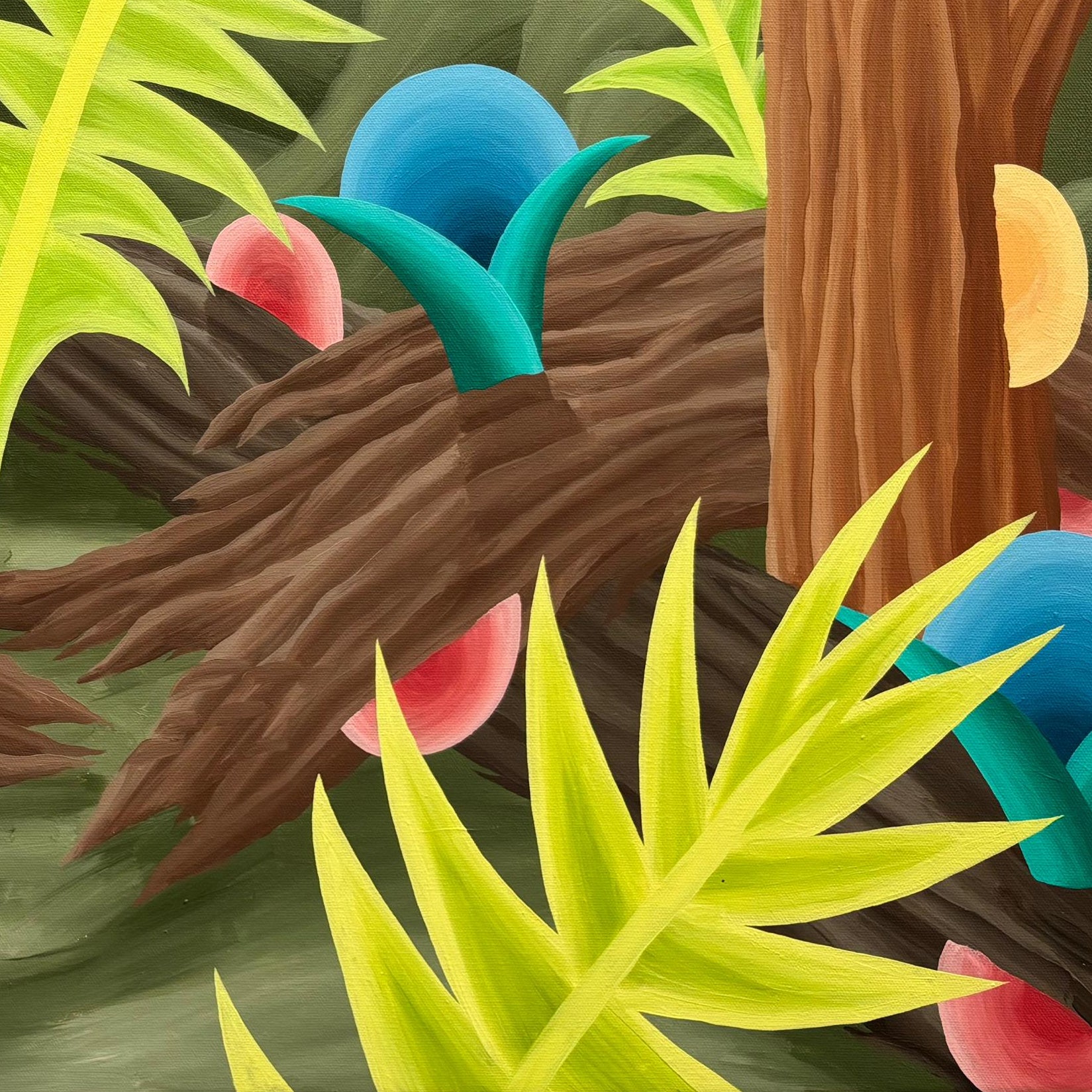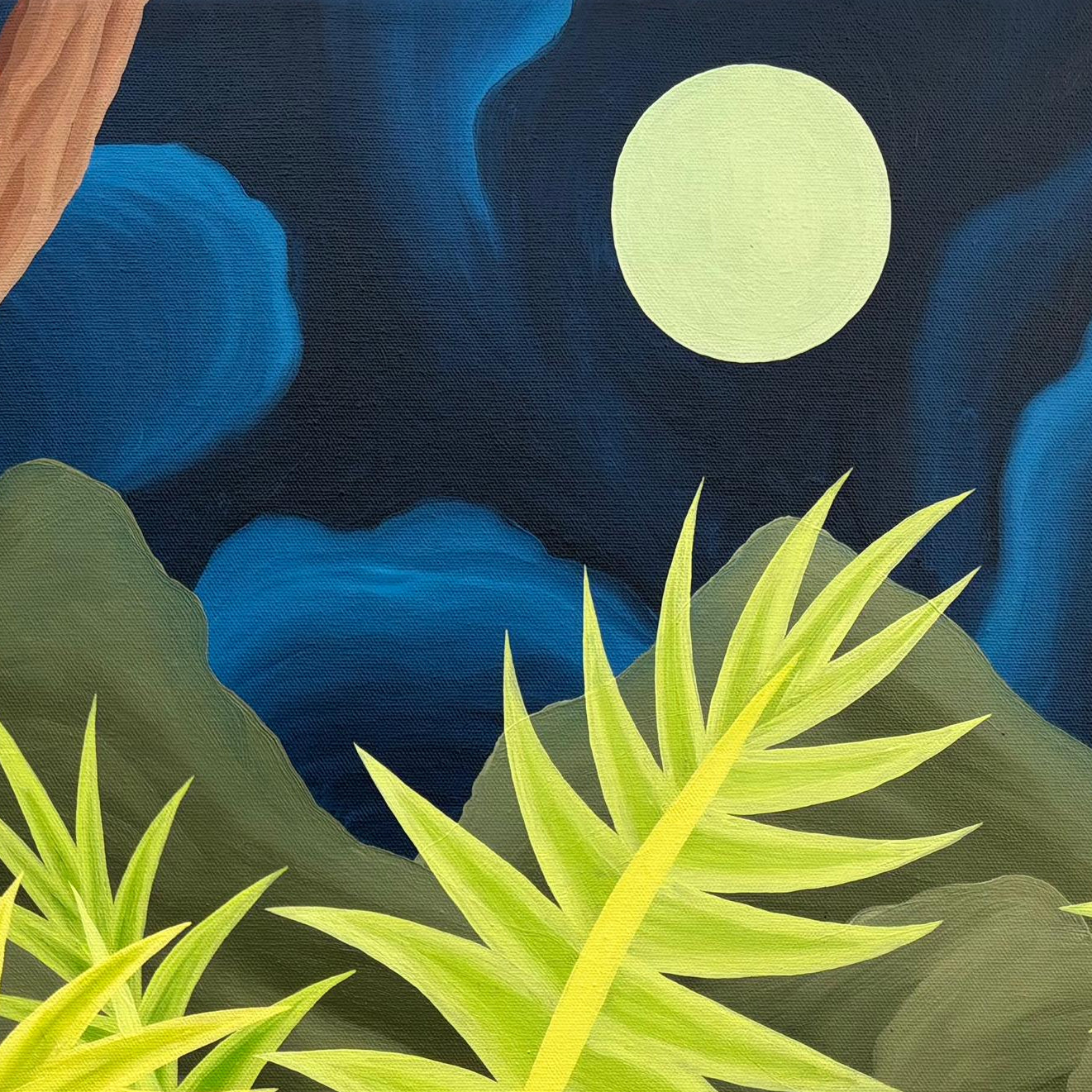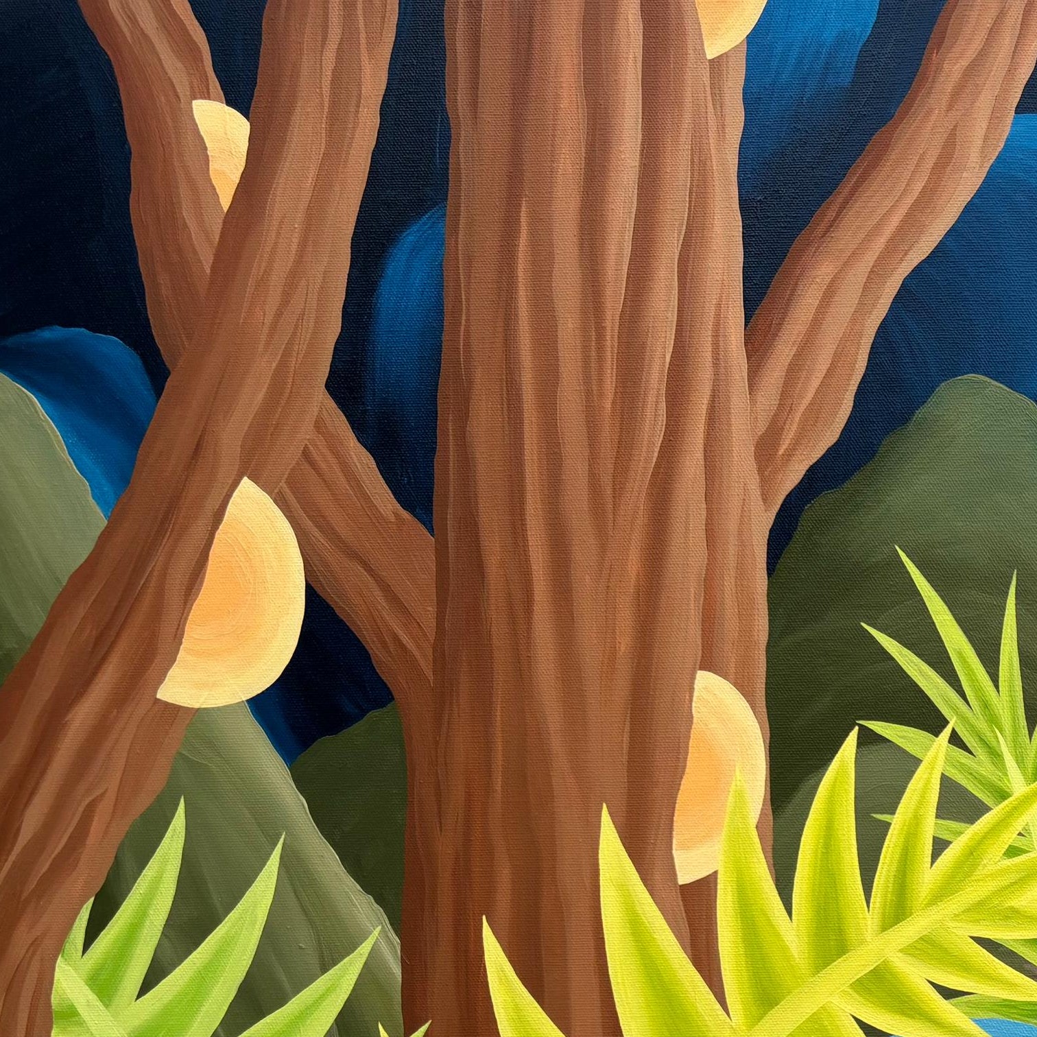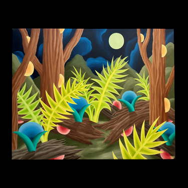 Llamativo óleo sobre tela del pintor y grabador chileno Michael Yaikel. La obra presenta un paisaje nocturno de abundante vegetación, donde largos troncos y hojas estilizadas se despliegan en formas orgánicas y geométricas. En el fondo, la luna aparece como un elemento protagónico que ilumina la escena y refuerza su atmósfera. La pintura refleja el lenguaje característico del artista: una interpretación imaginativa de la naturaleza, donde la forma, el ritmo y el color adquieren un papel central.