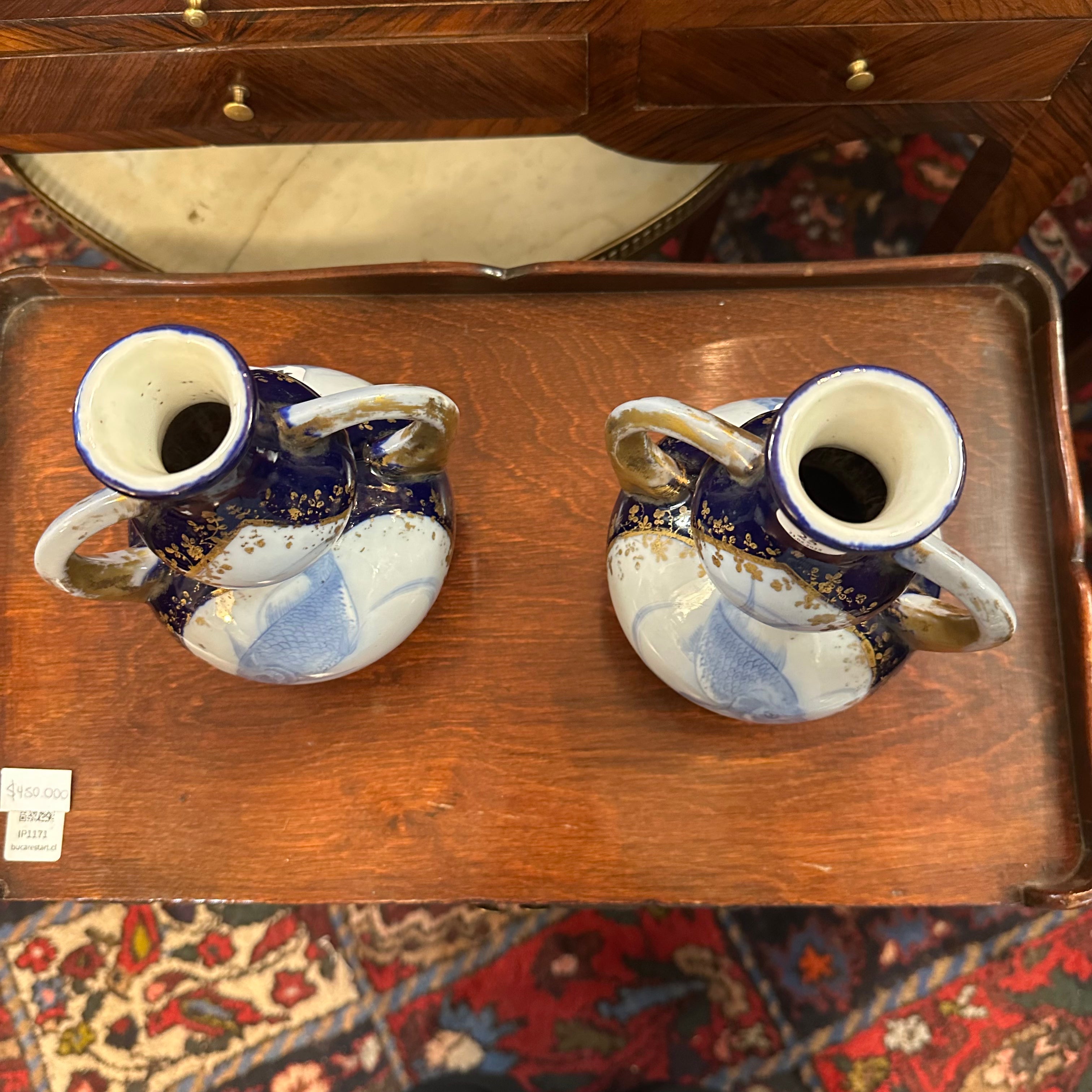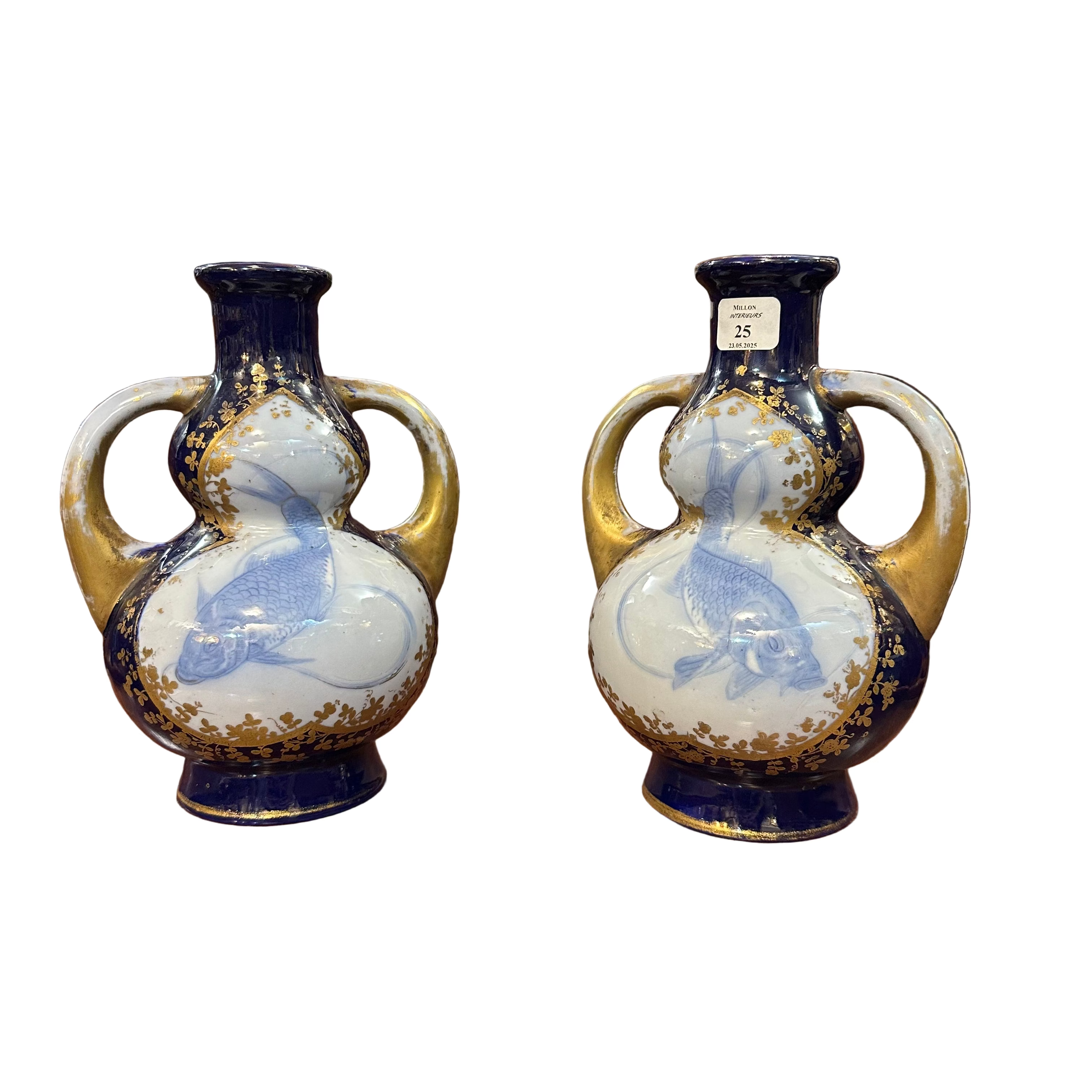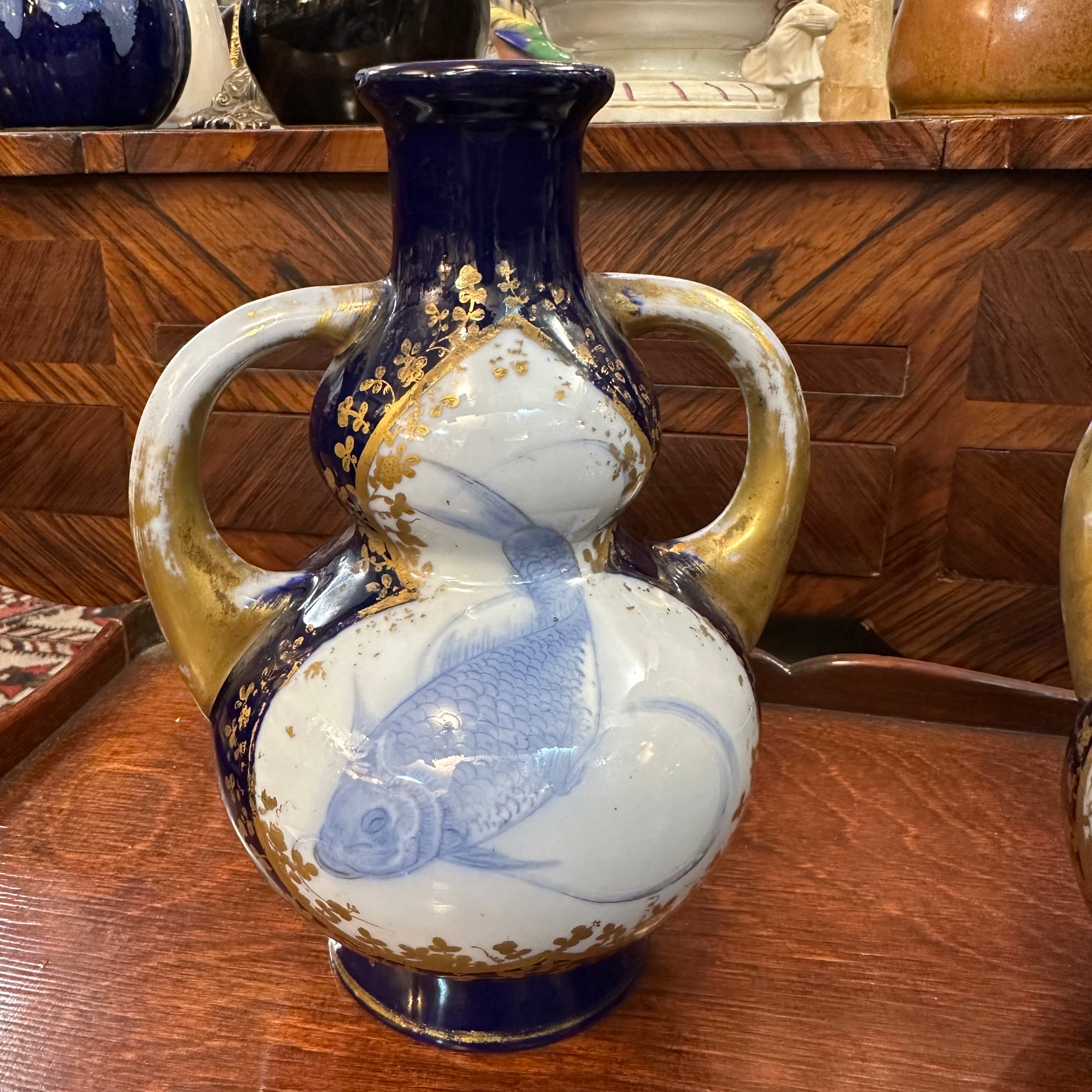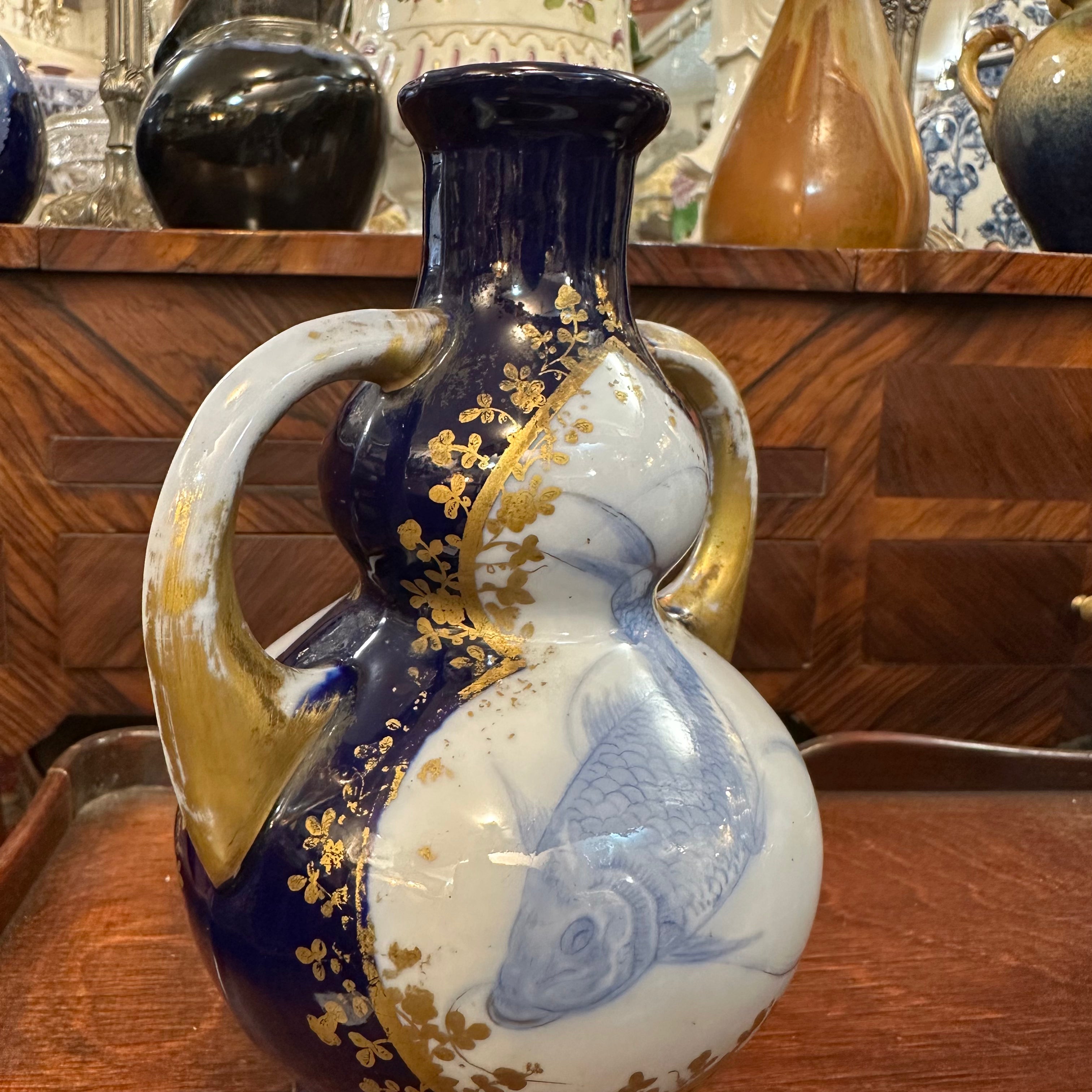 Beautiful set of two small porcelain vases, of French origin, in a double gourd design with handles, and dark blue enamel with gold details. The central figure is a koi fish, or carp as it is known in the West, a symbol that represents good fortune, courage, and wisdom.