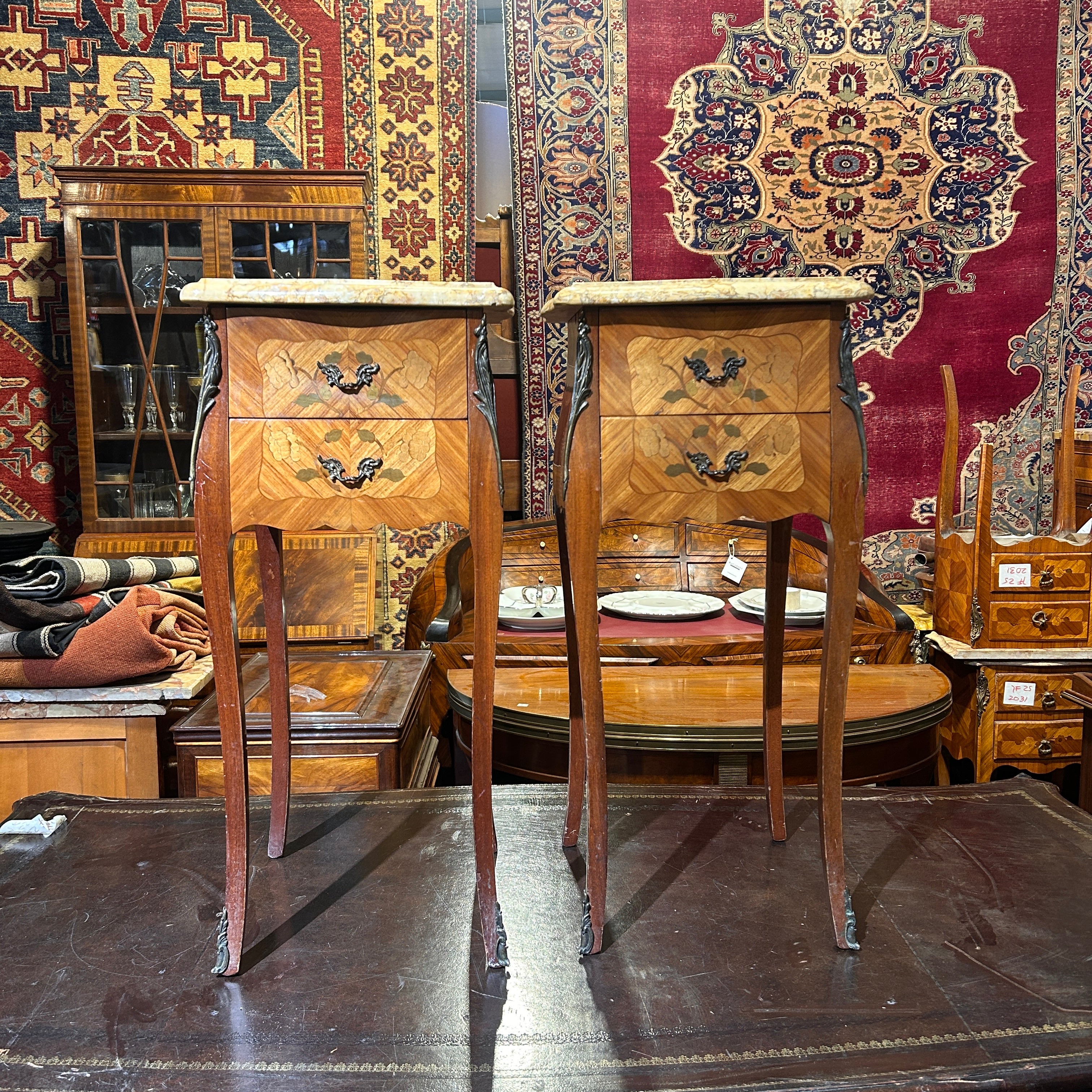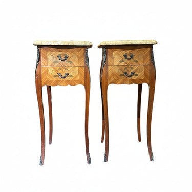Pareja de petit veladores franceses estilo Luis VX, con bellísima marquetería en palo de rosa con motivos florales, aplicaciones y tacos de bronce y una especial cubierta de mármol original hecha siguiendo el gallbèe (curvatura) del mueble. Las piezas tienen dos cajones.