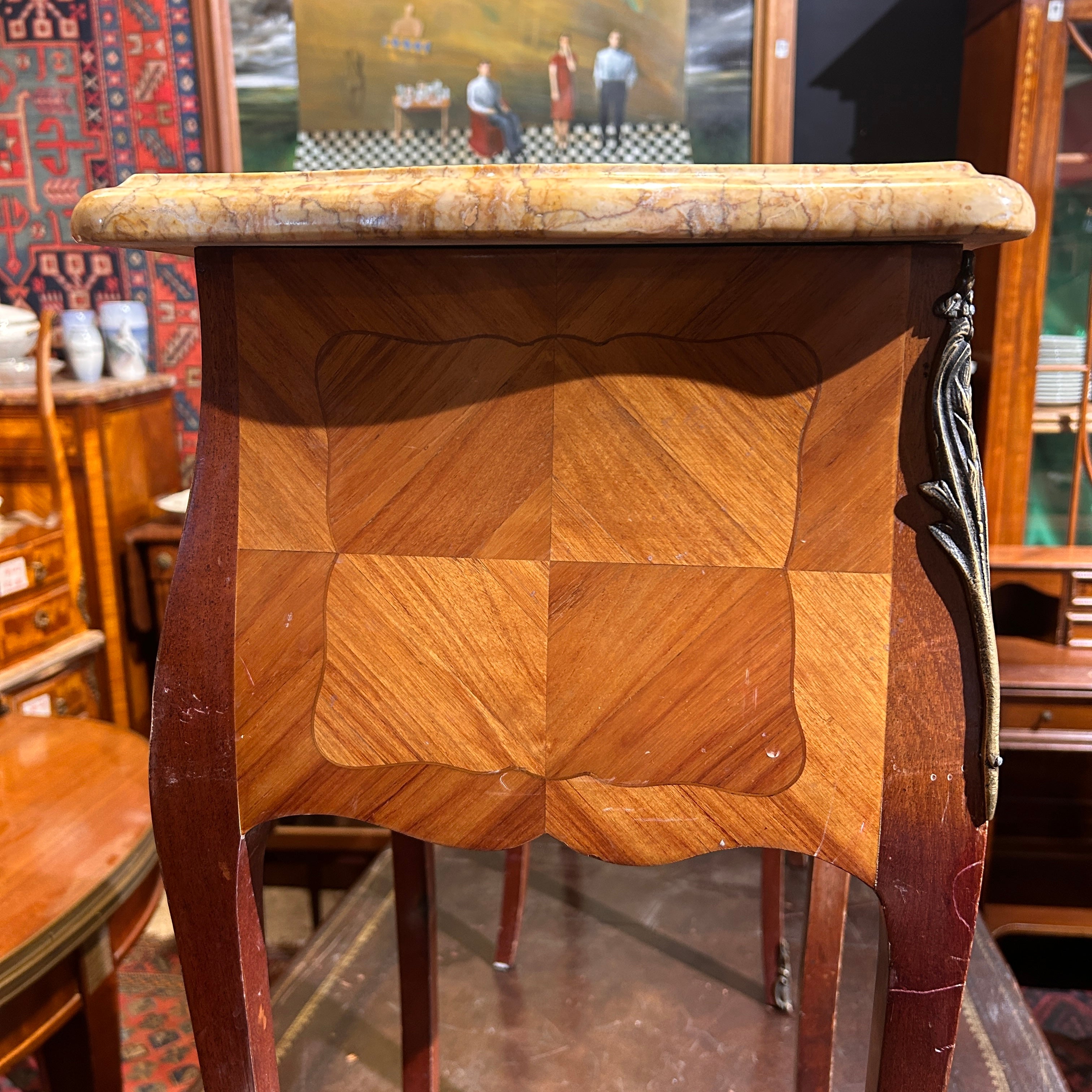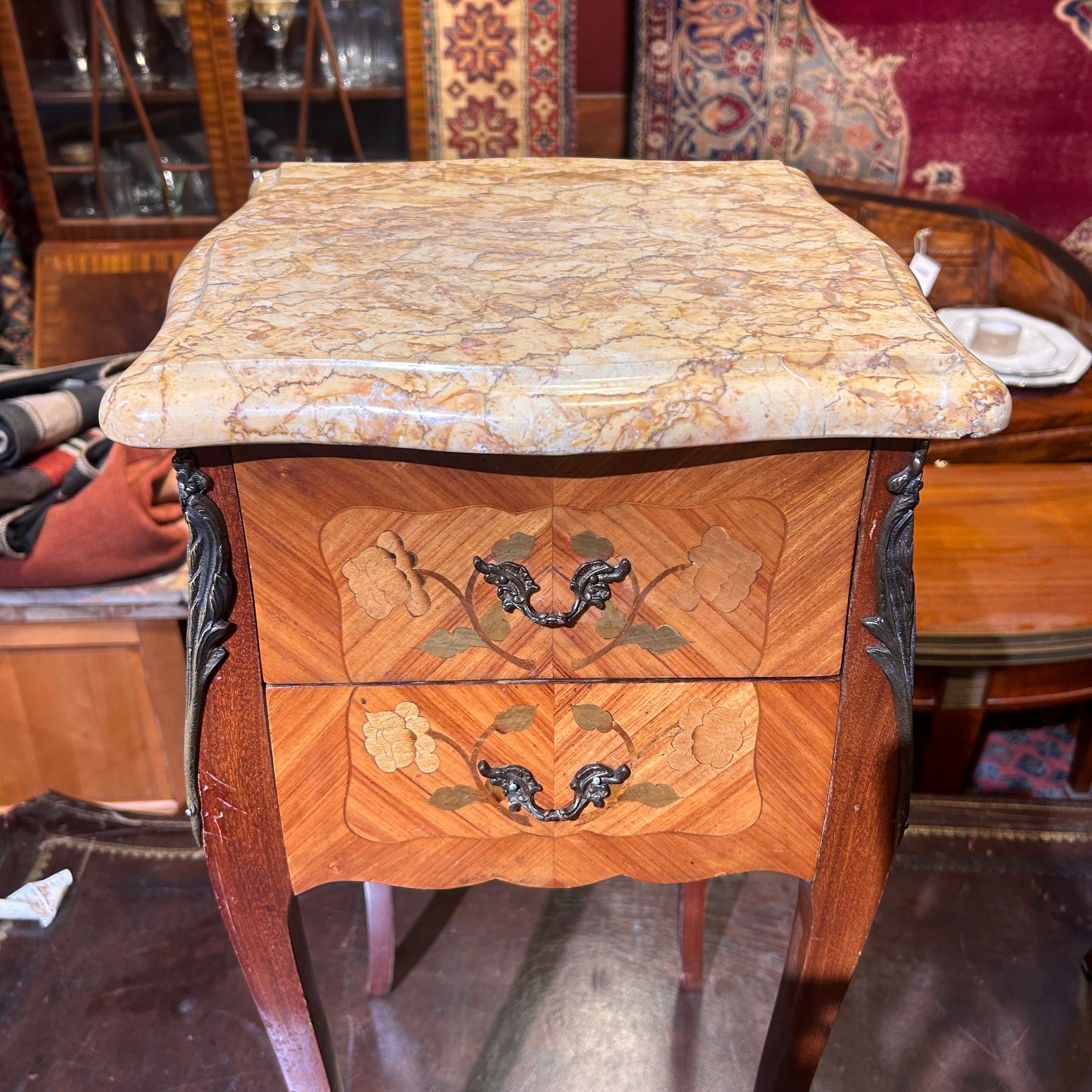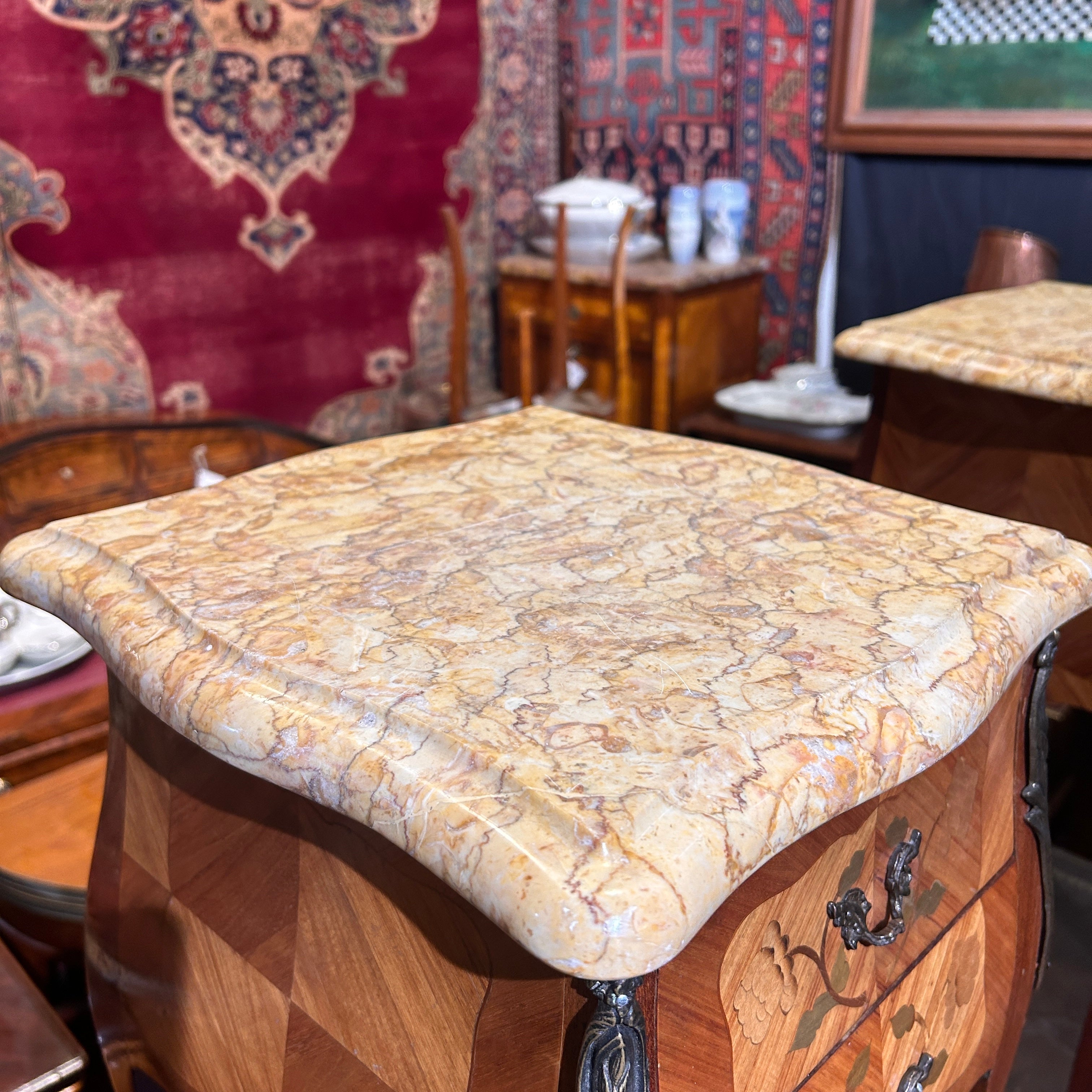 Petit veladores Luis XV bombé marquetería mármol y dos cajones