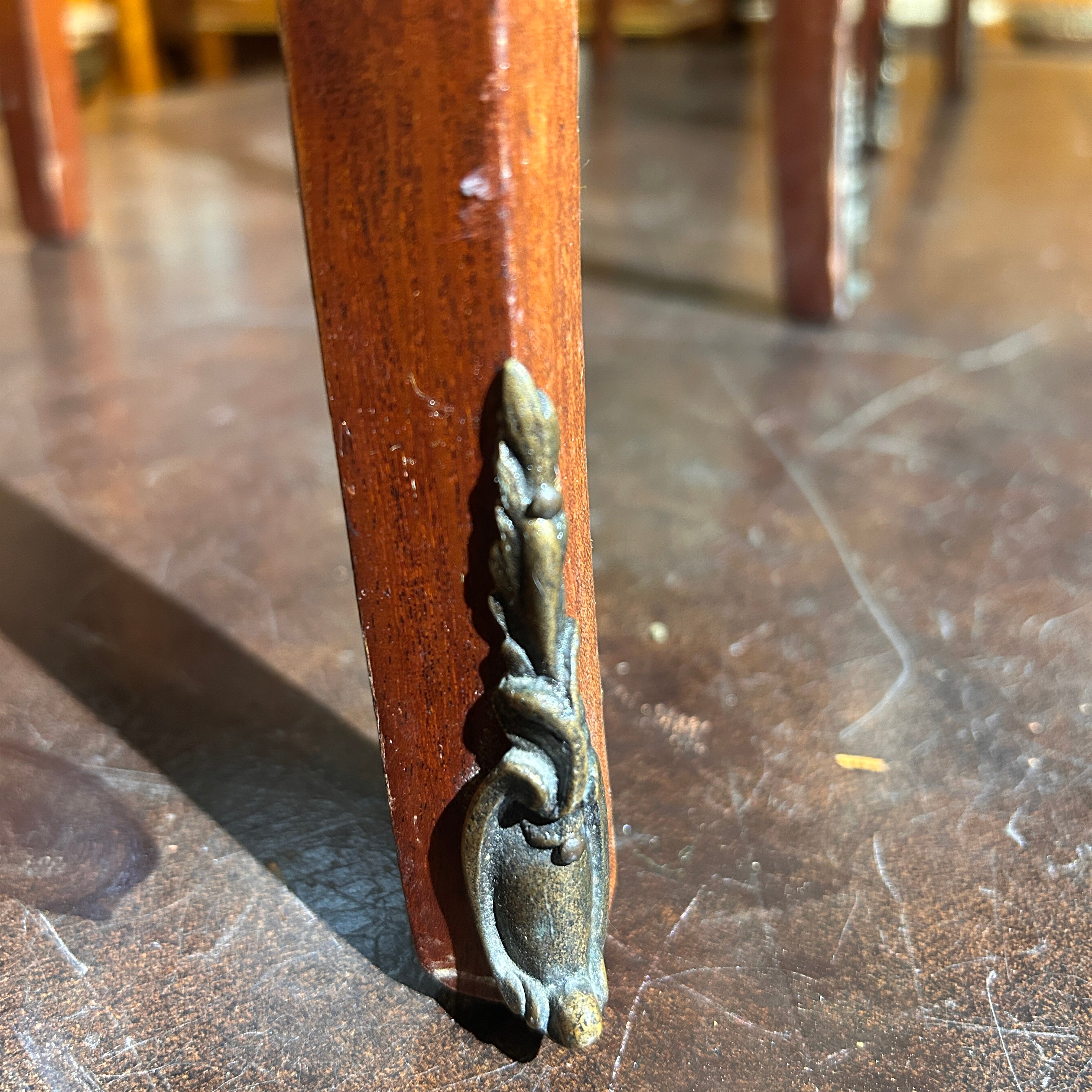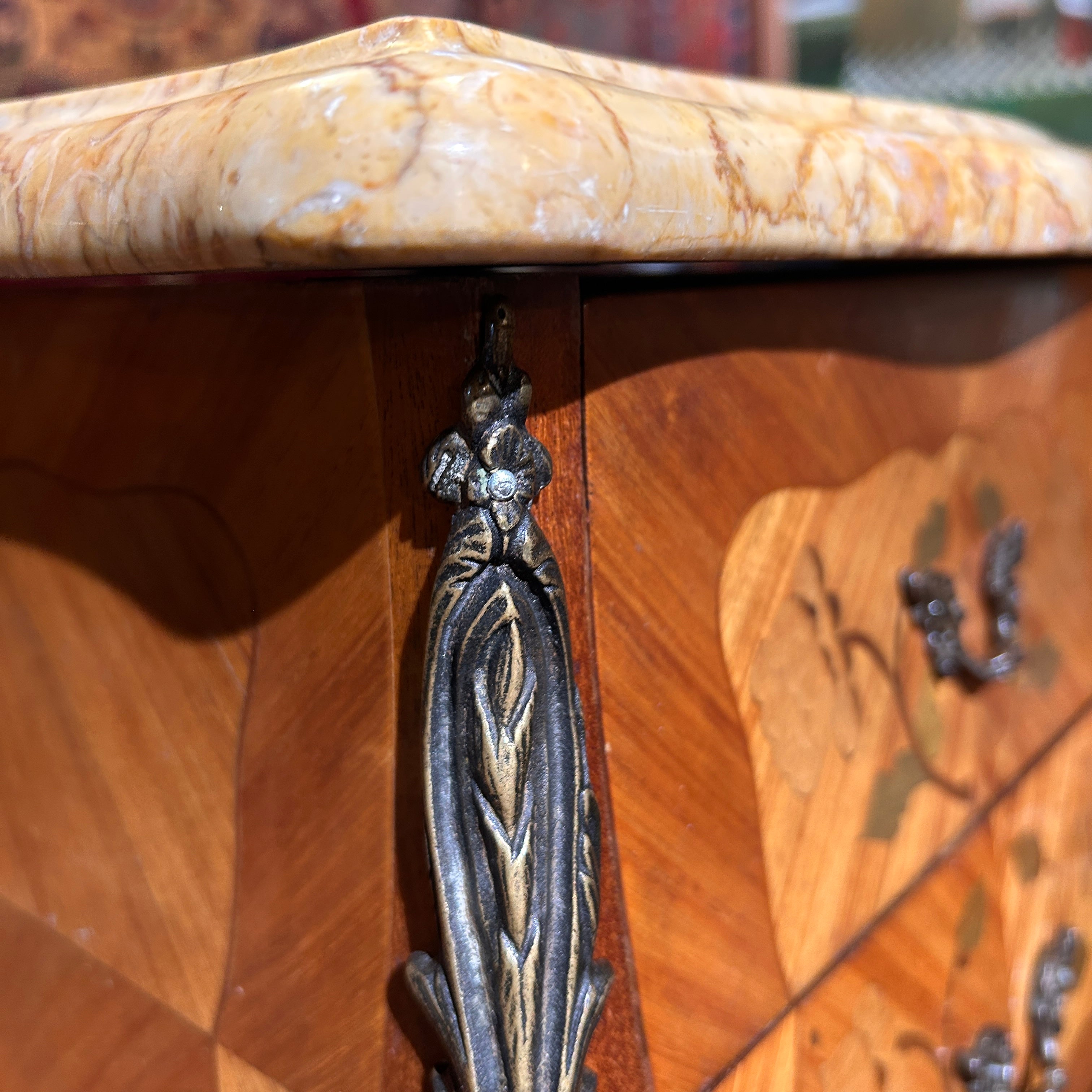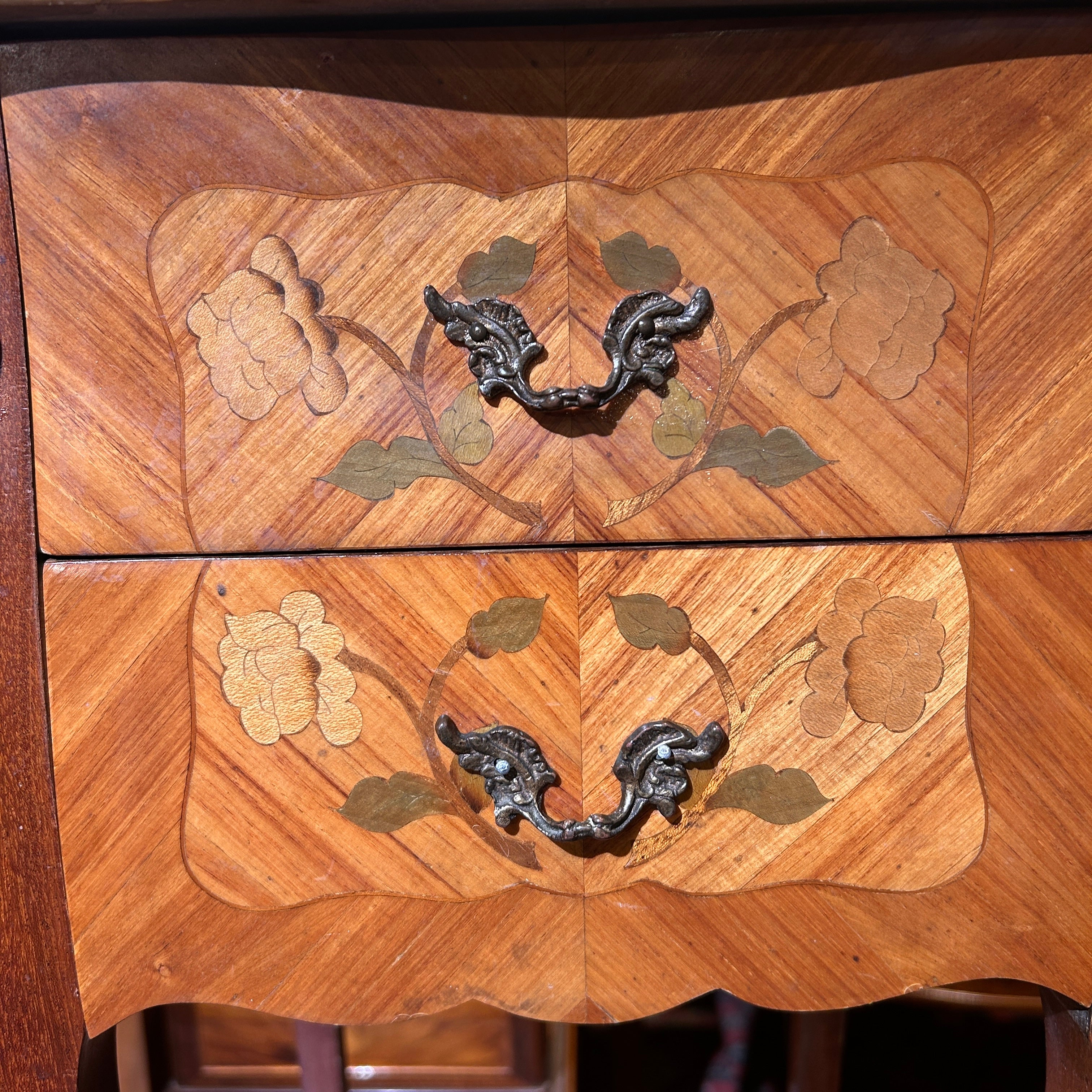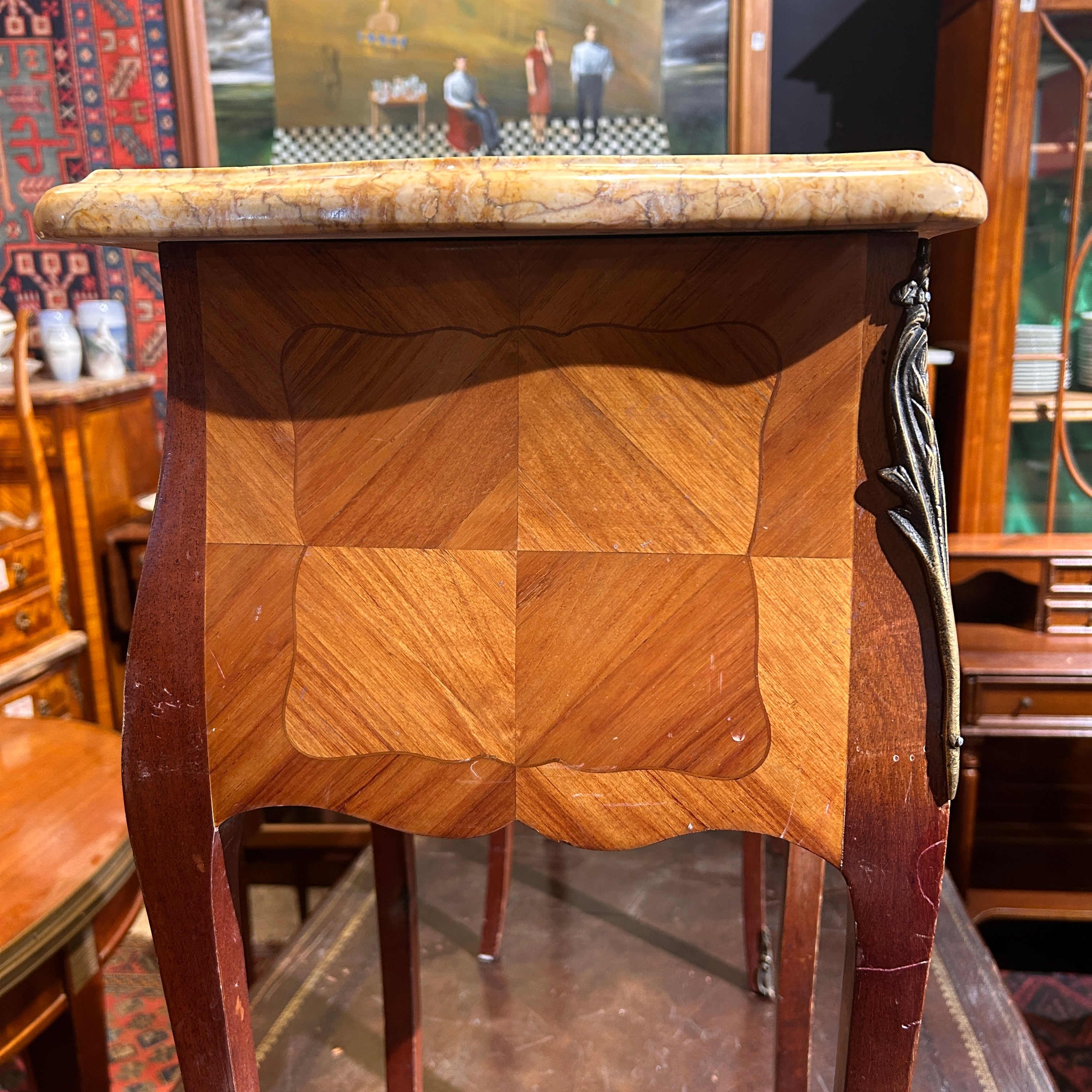 Petit veladores Luis XV bombé marquetería mármol y dos cajones