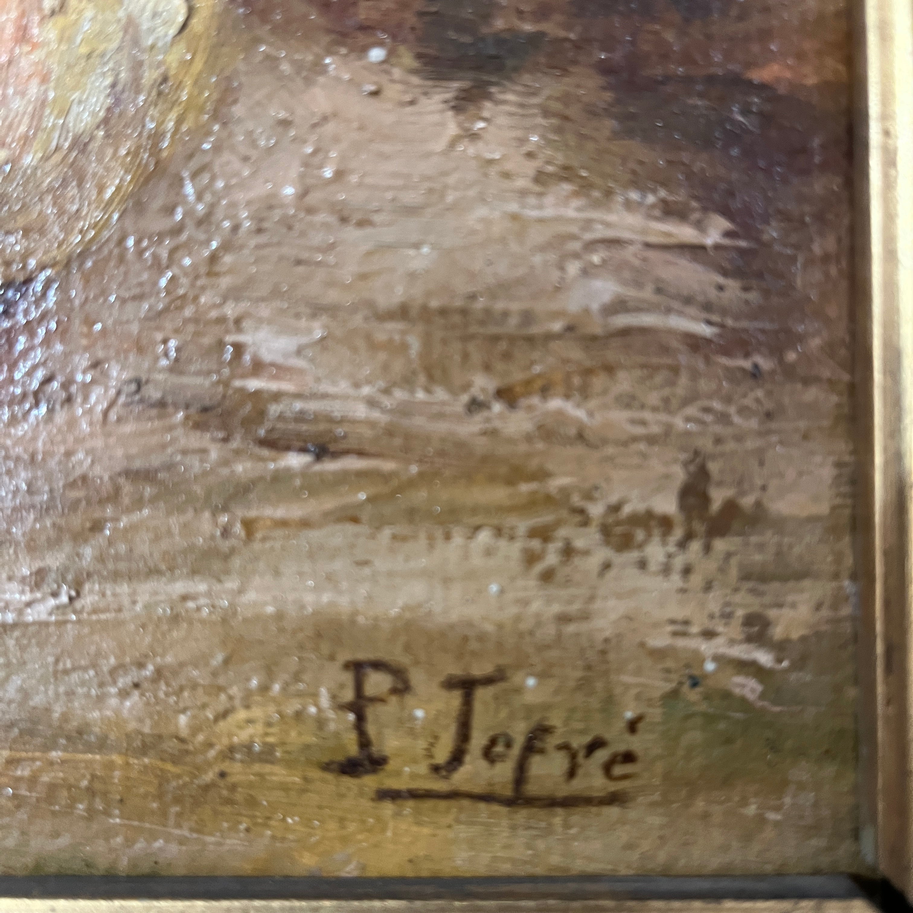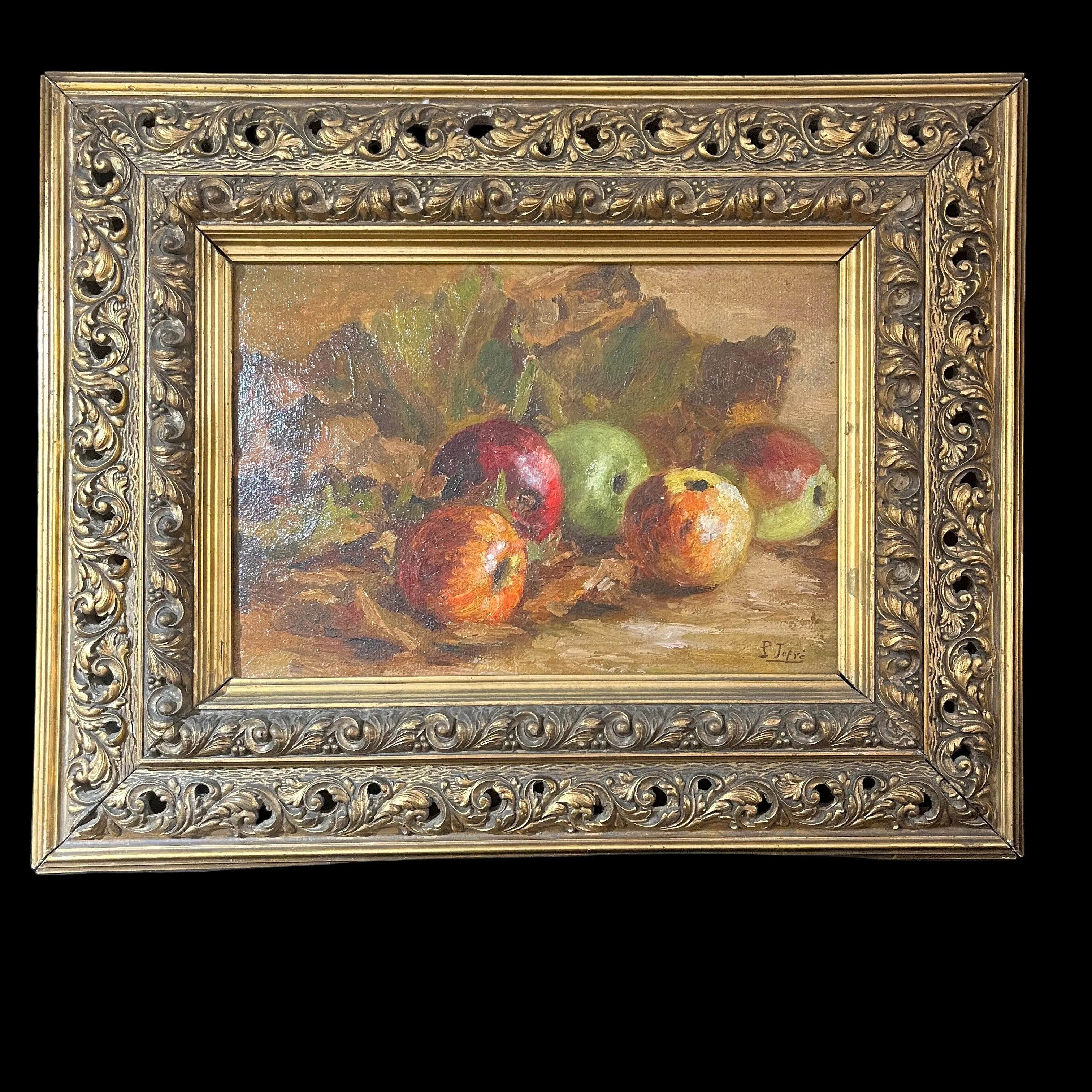Hermoso bidegón del talentoso pintor chileno Pedro Jofré que nos presenta un plano muy luminoso de diversas frutas puestas en una mesa con un fondo de lo que pareciera ser hojas verdes. El cuadro viene con su marco original de madera con relieve y tallado bellas hojas con un acabado dorado.