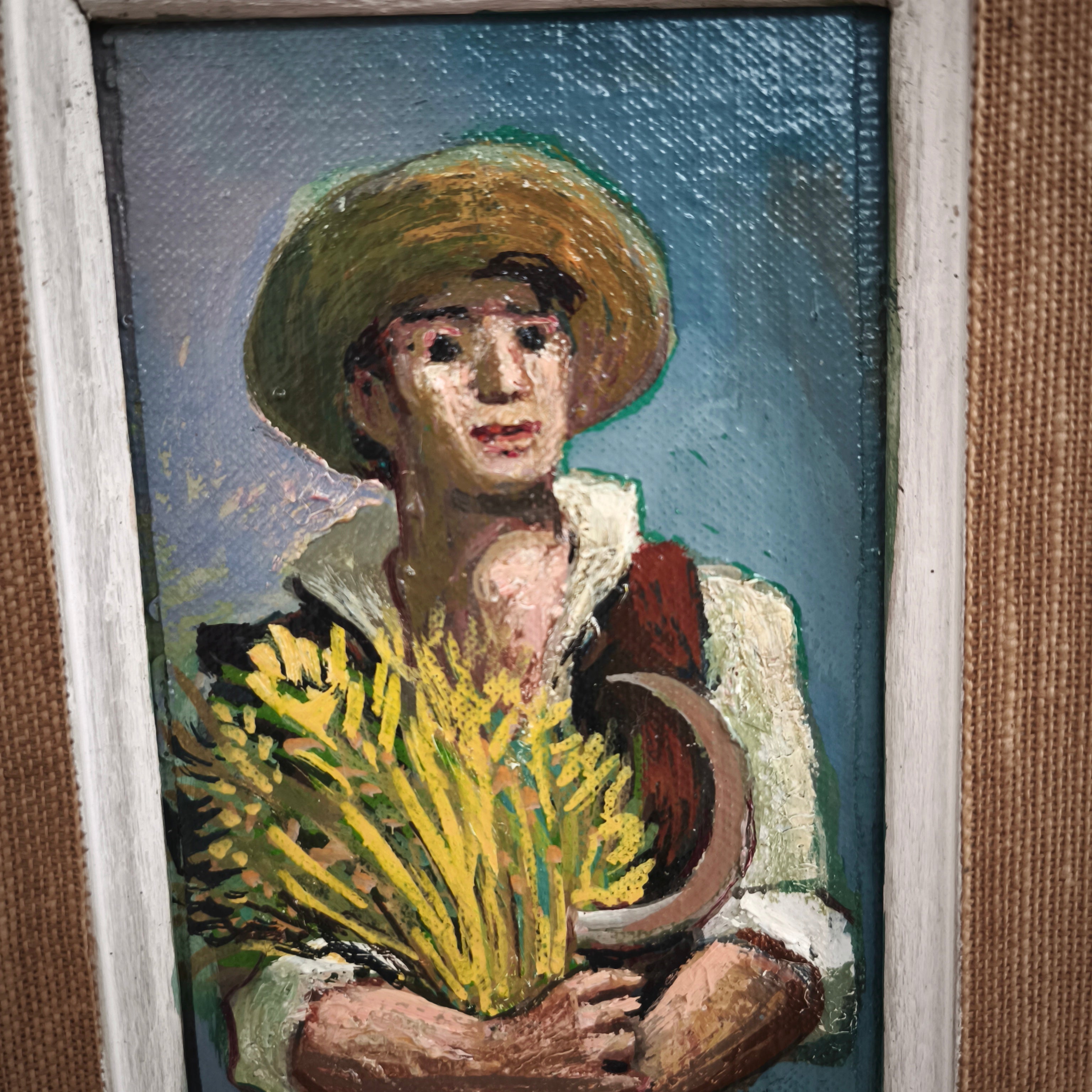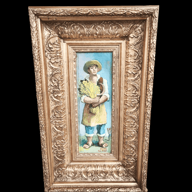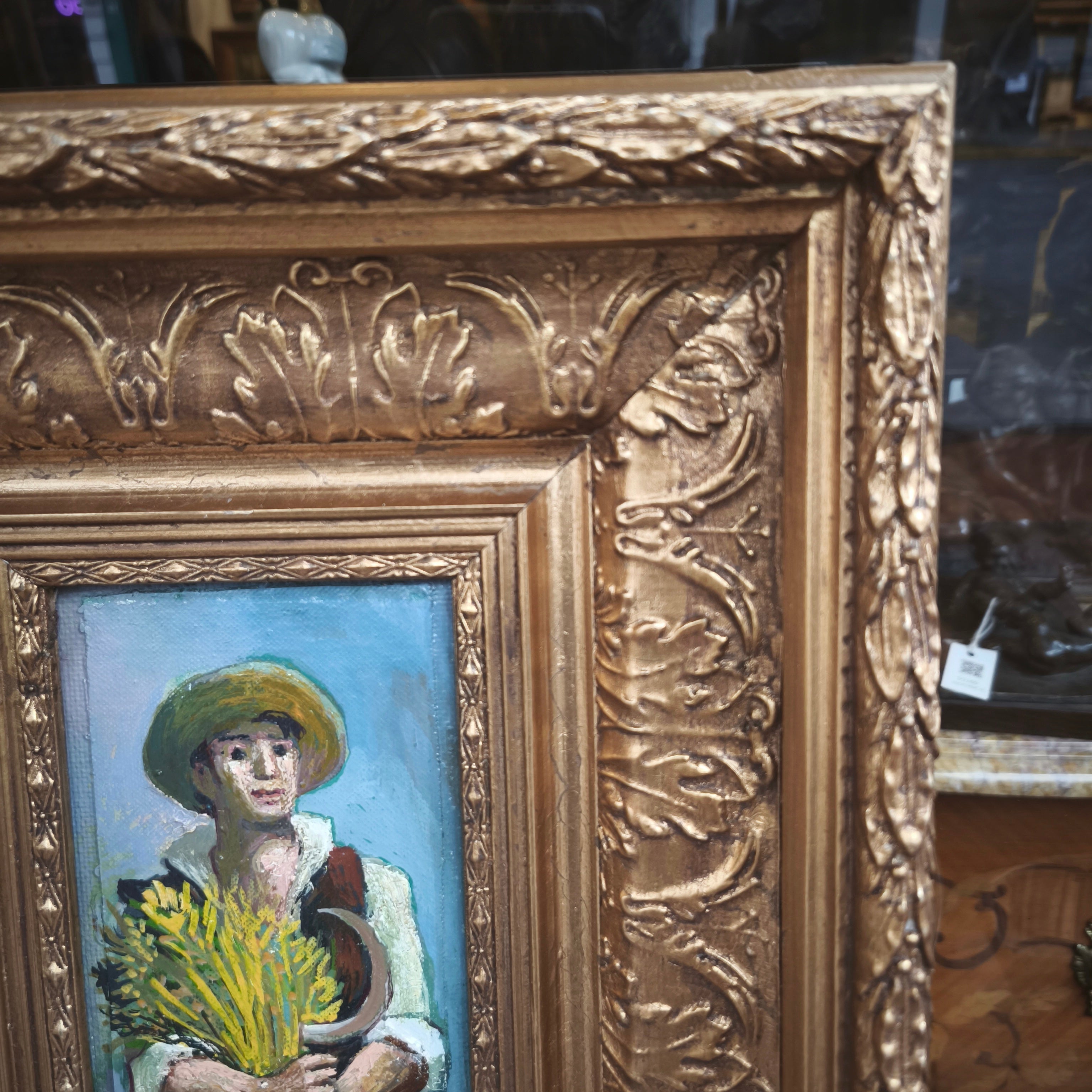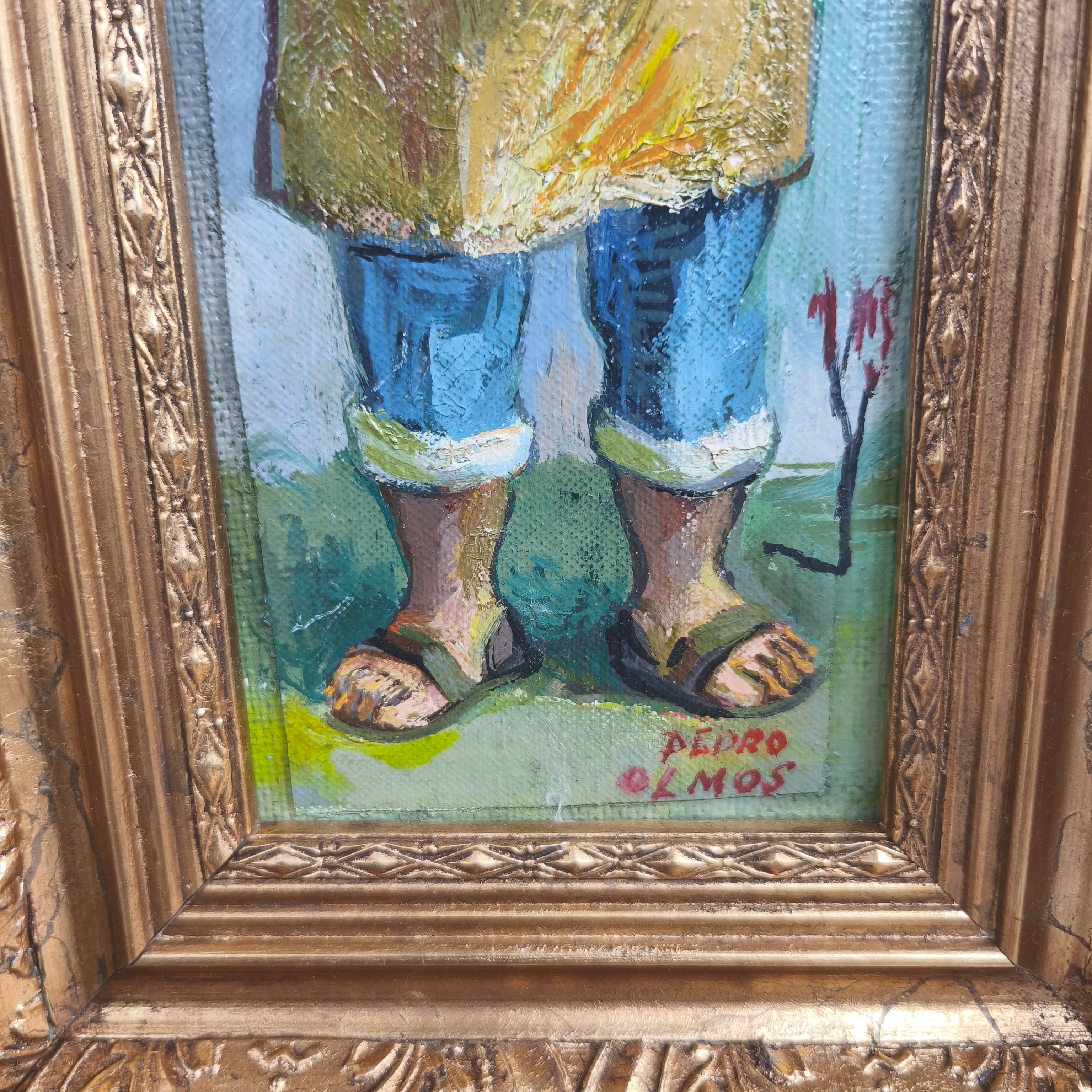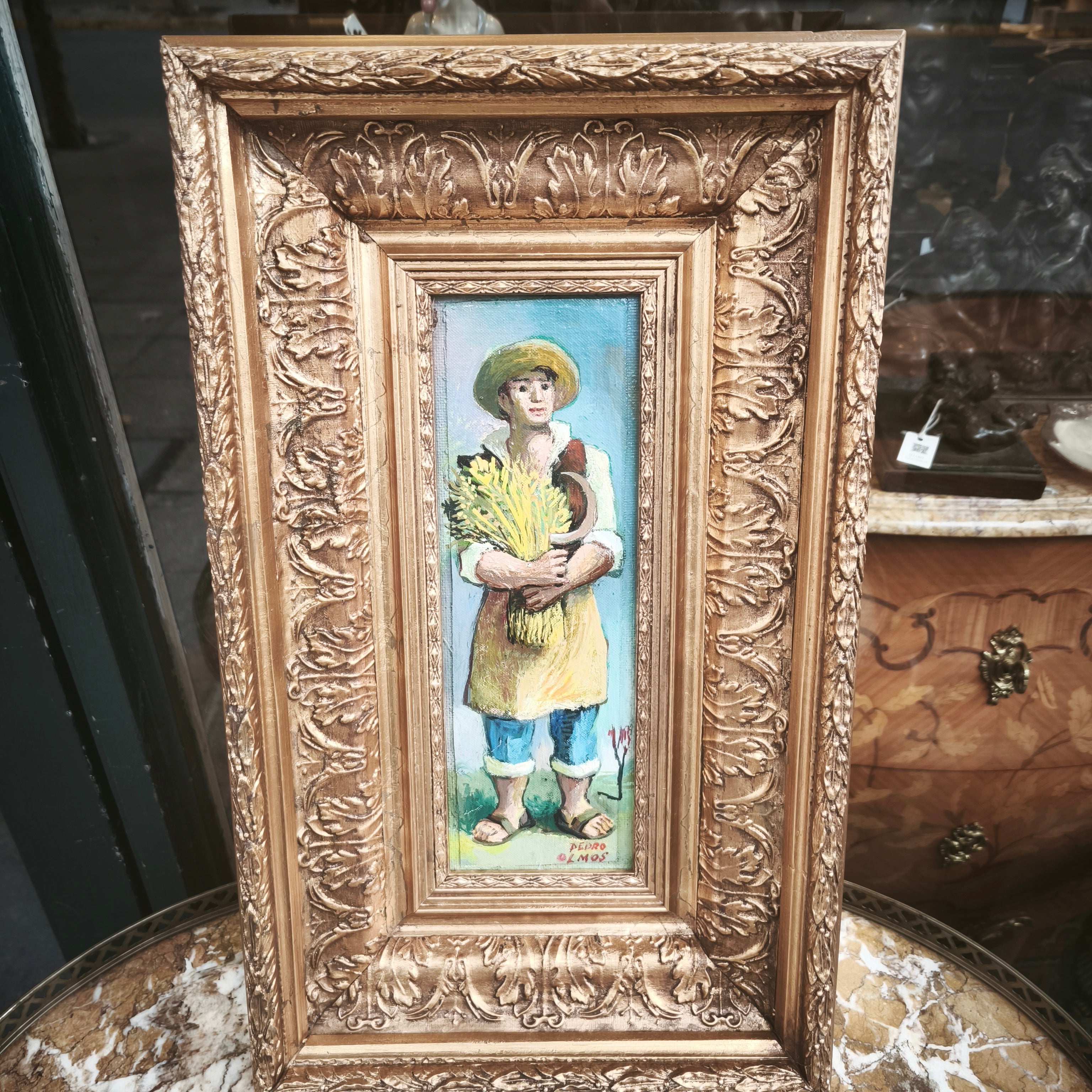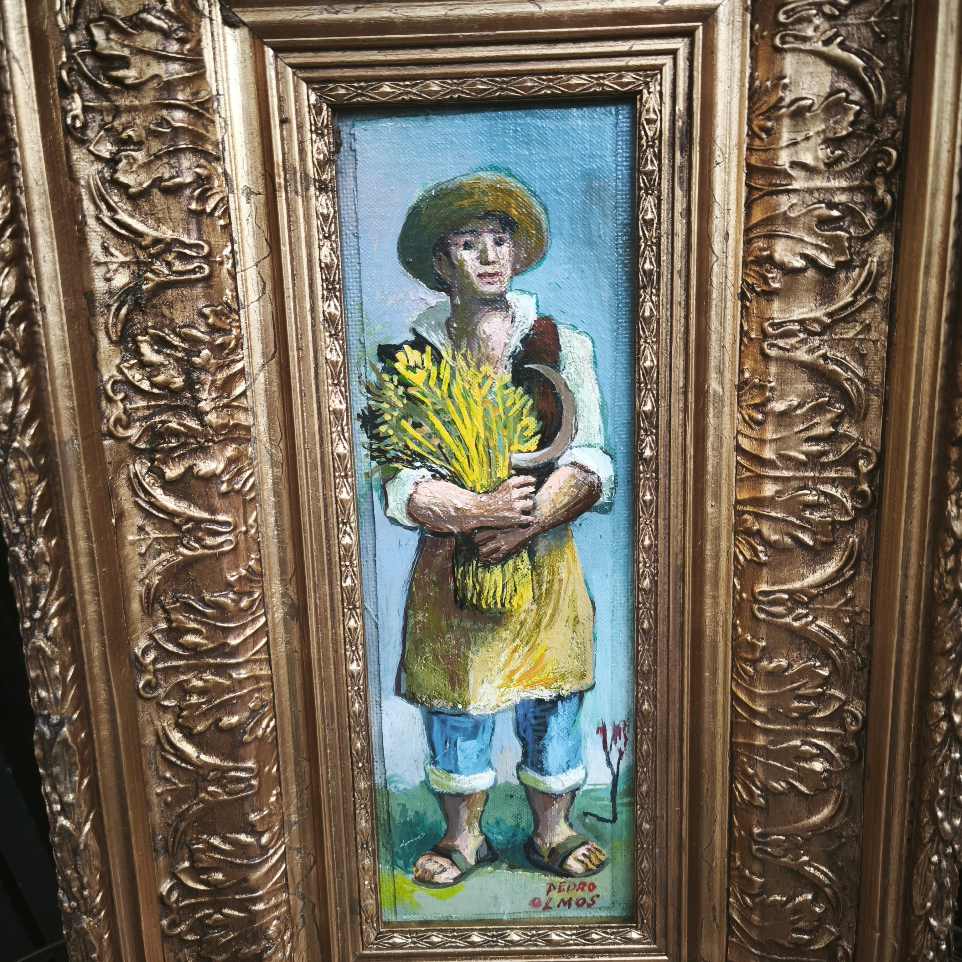 Oil on wood by the Chilean artist of Buenos Aires origin, Pedro Olmos, depicts a farmer carrying wheat in vibrant colors. The work is framed in wood carved in spectacular reliefs and finished in gilt.