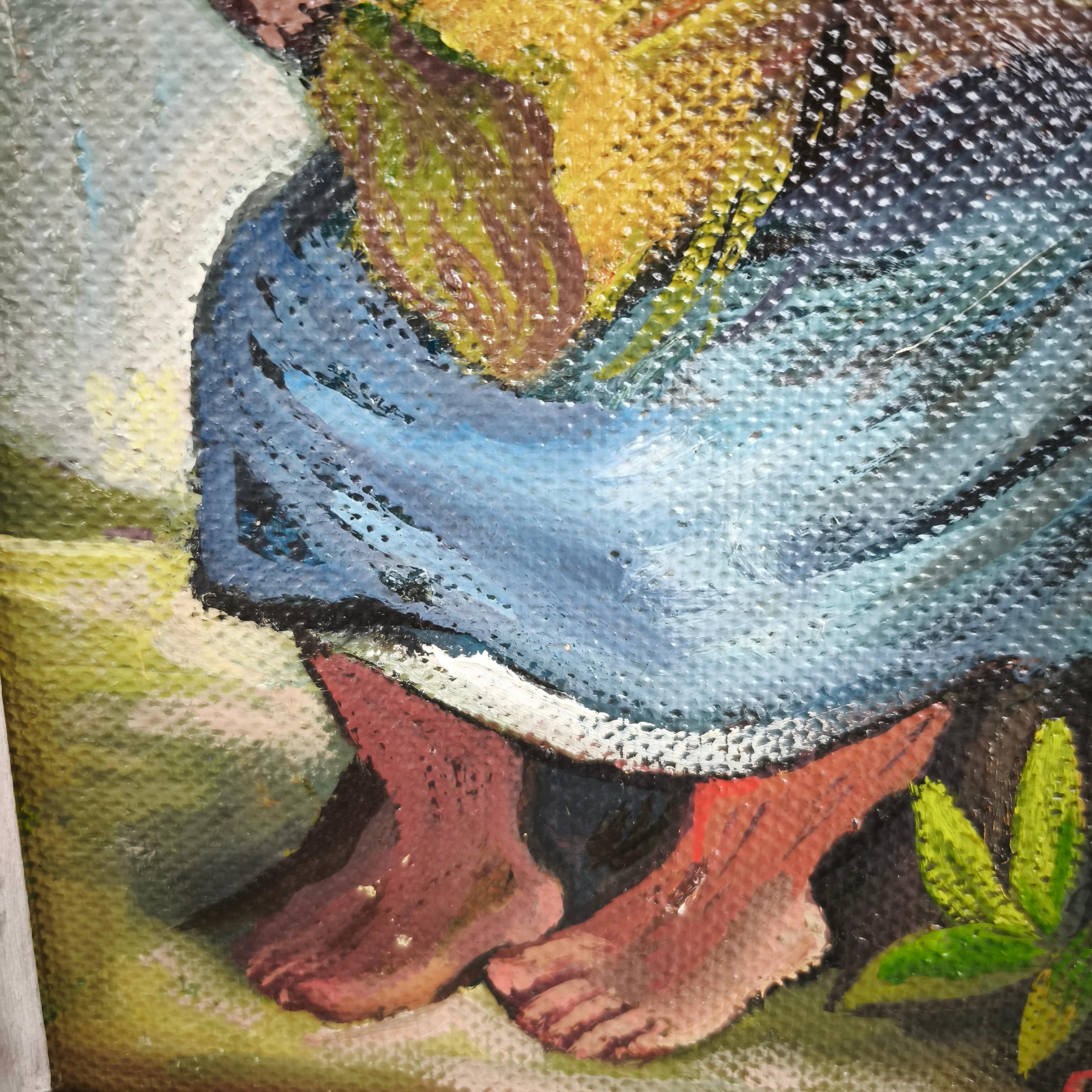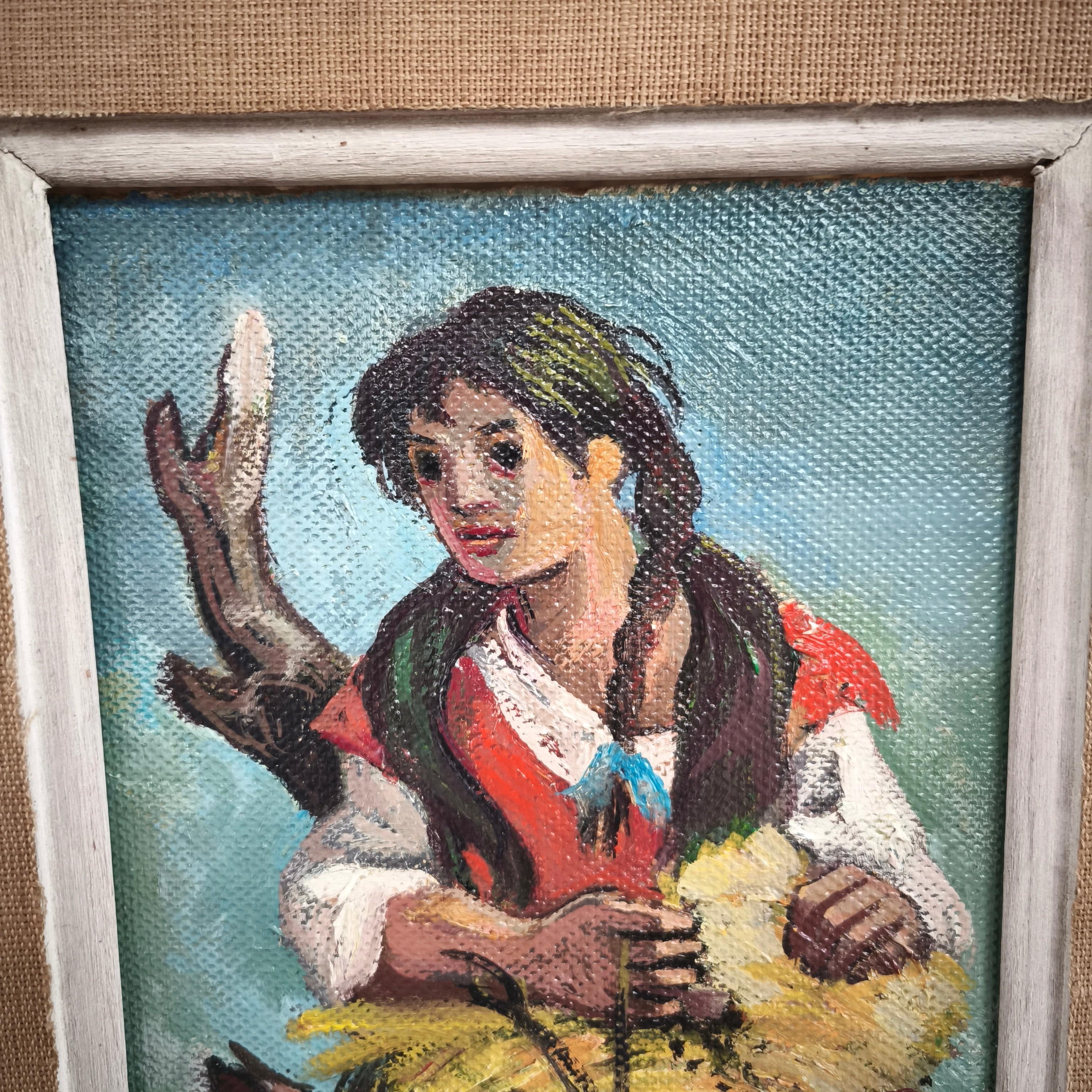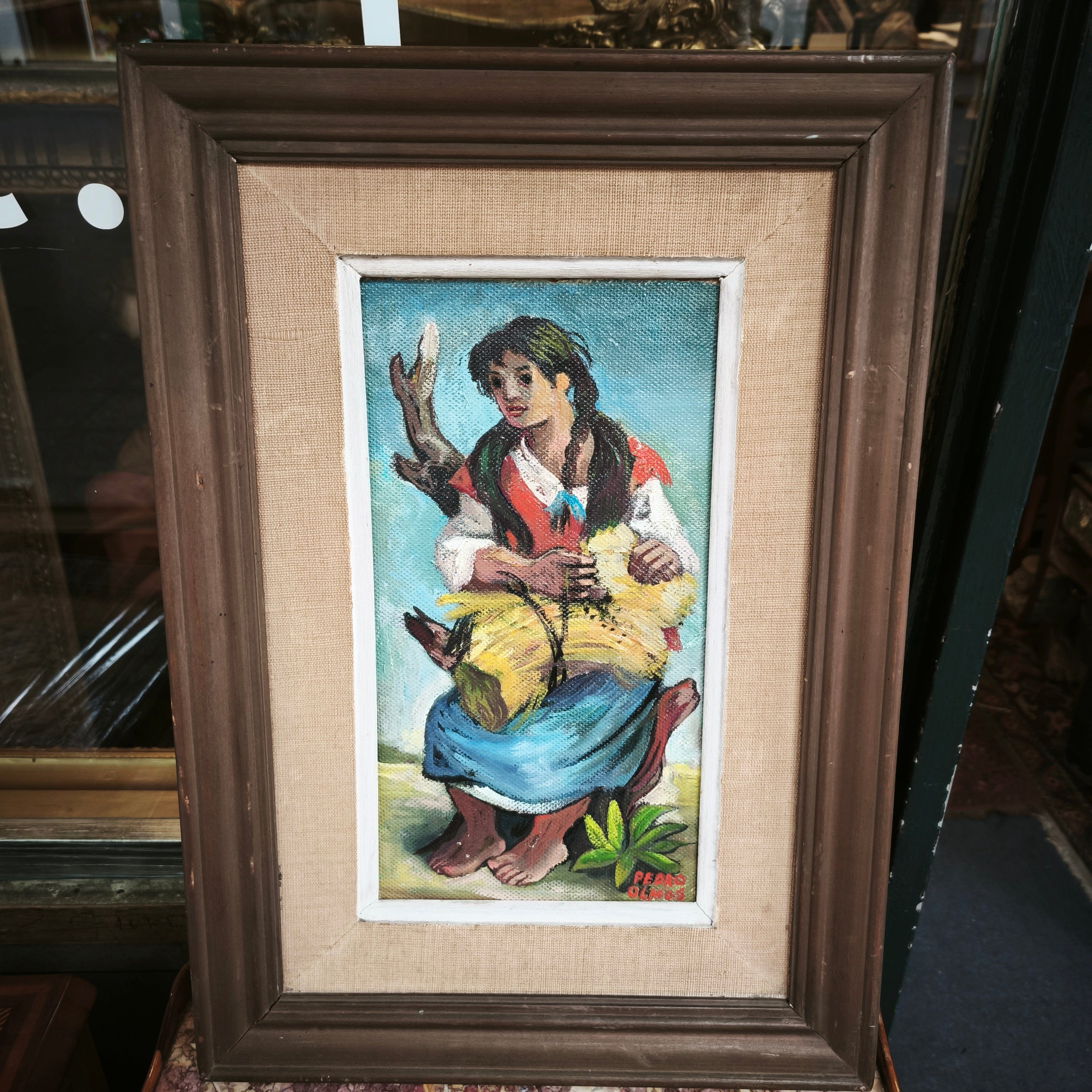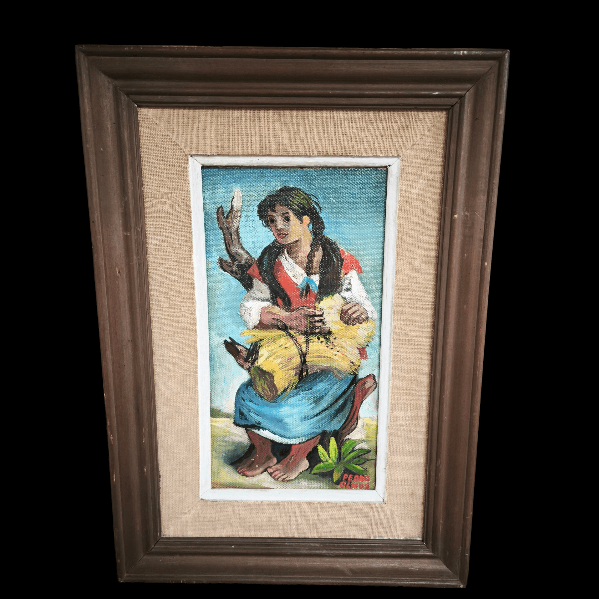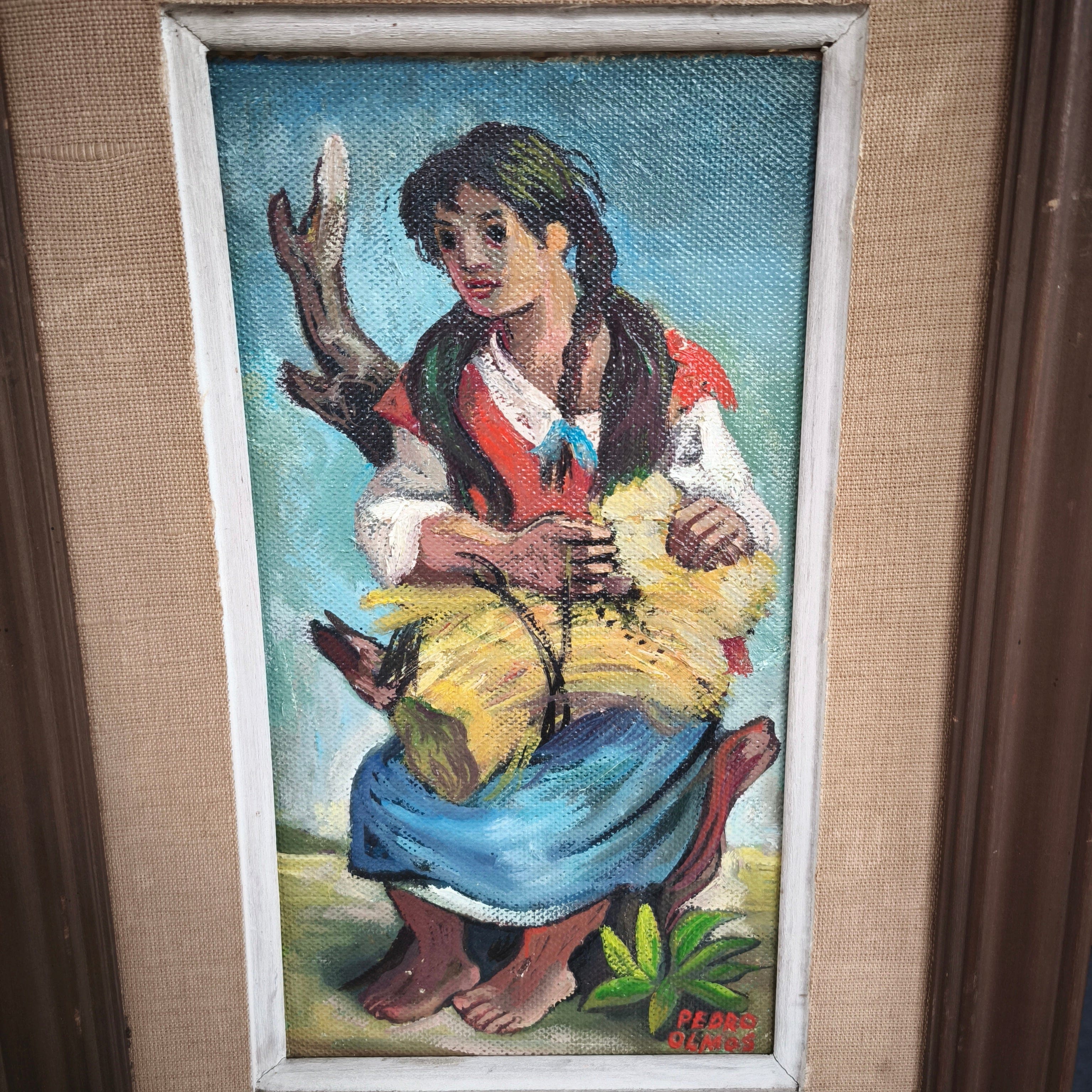 Oil on wood by Chilean artist Pedro Olmos, depicting a seated peasant tying wheat. The work is framed in wood with a beautiful and understated natural fiber mat.