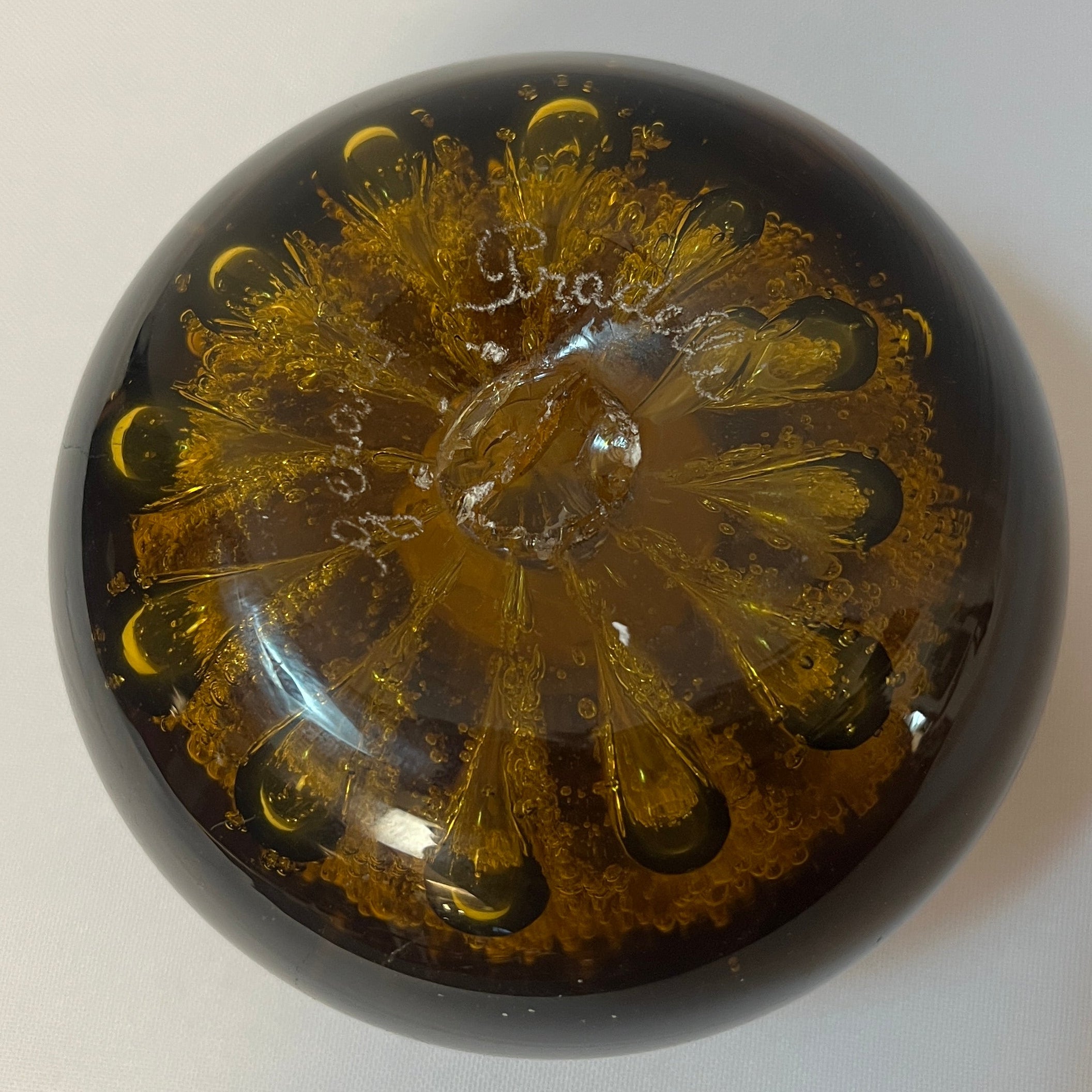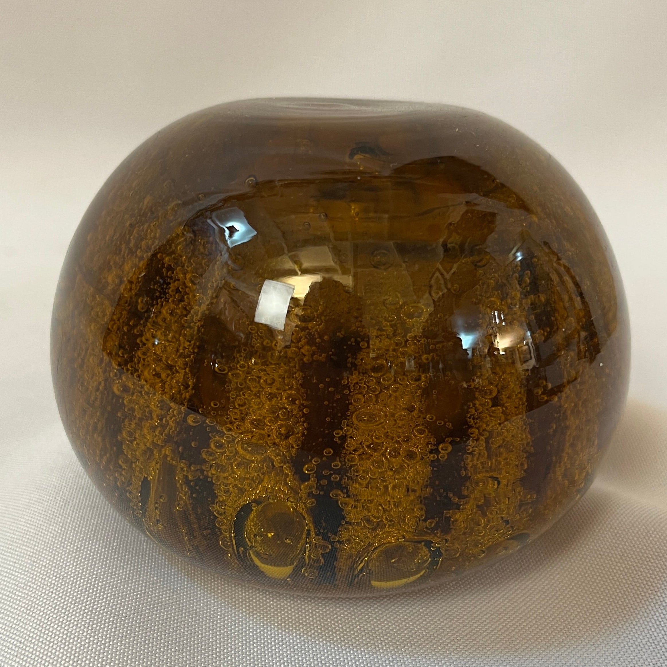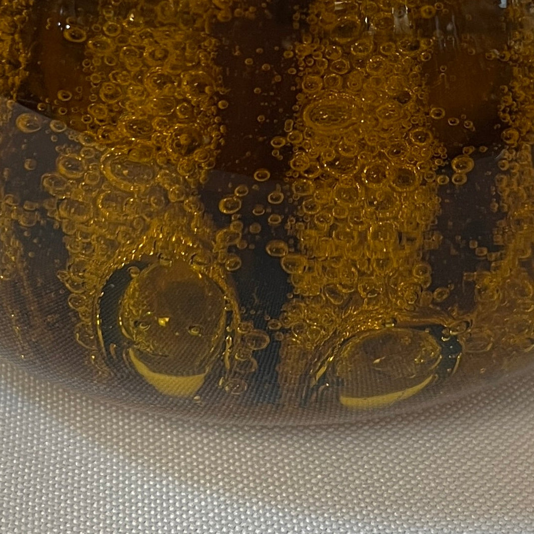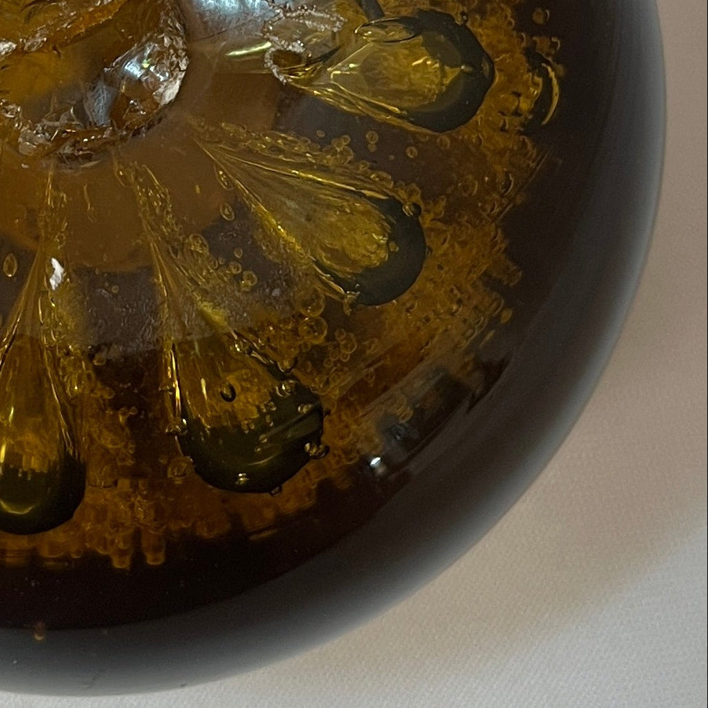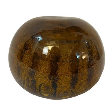 Bello pisapapeles francés de vidrio color ámbar, decorado con delicadas burbujas en su interior, que aportan profundidad y luminosidad a la pieza. Su forma simple y elegante realza el color cálido del vidrio. Se encuentra firmado en la parte inferior por 'Gerard Pradelle'.