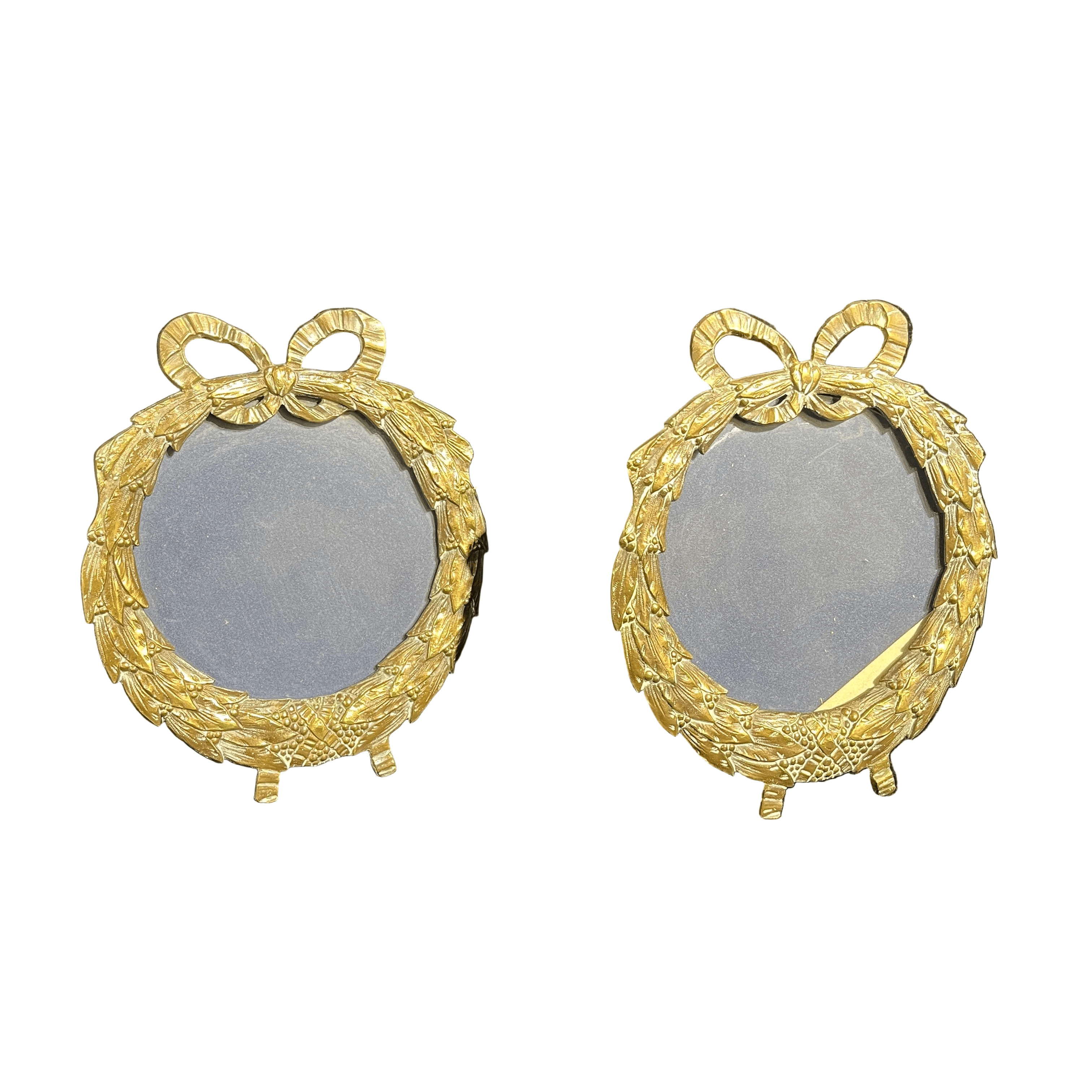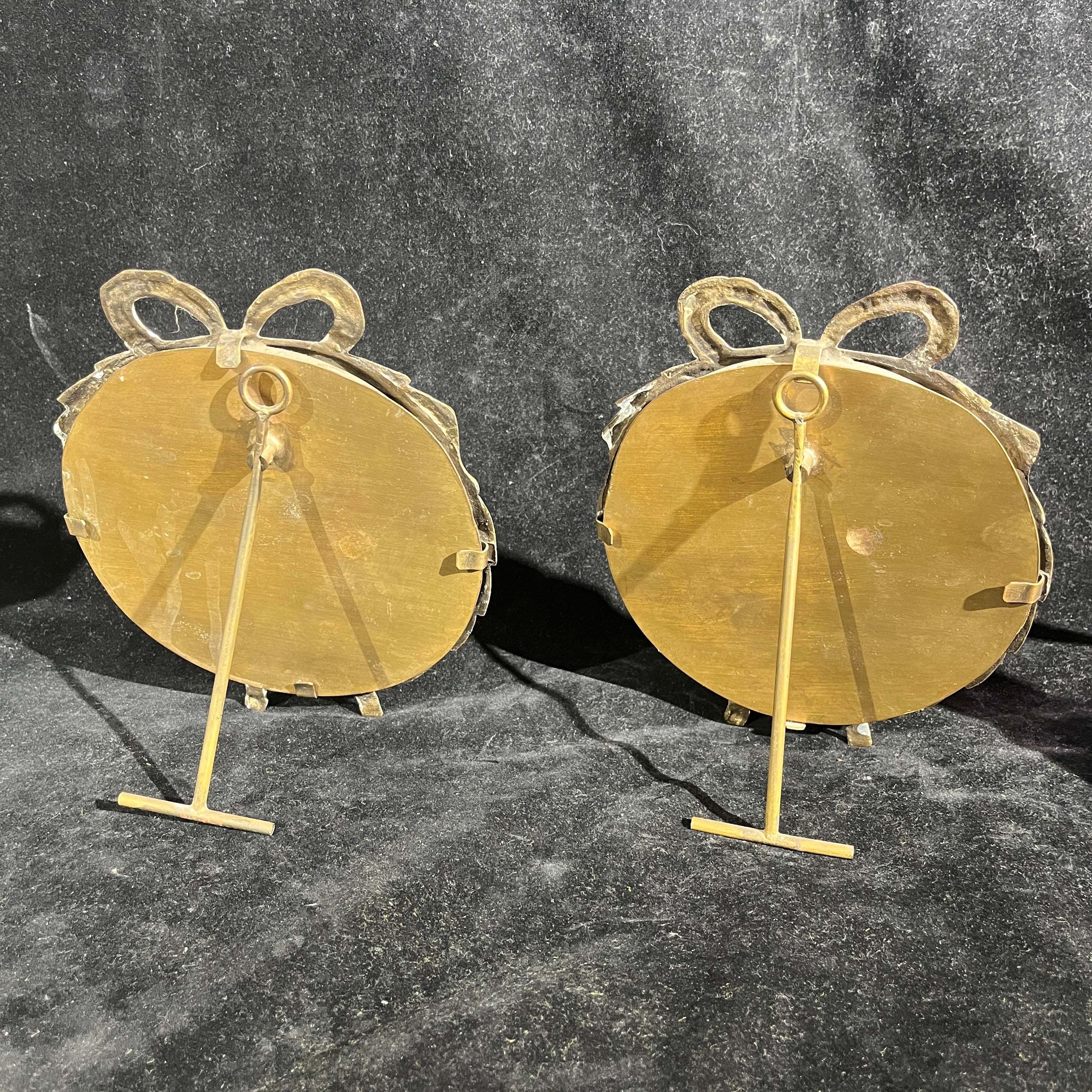 Pareja de bellos portarretratos circulares en bronce con diseño tallado en forma de guirnalda con cinto en su parte superior. Las piezas tienen un vidrio para proteger el retrato y y su parte posterior tiene una pata de sobrio diseño en líneas rectas.