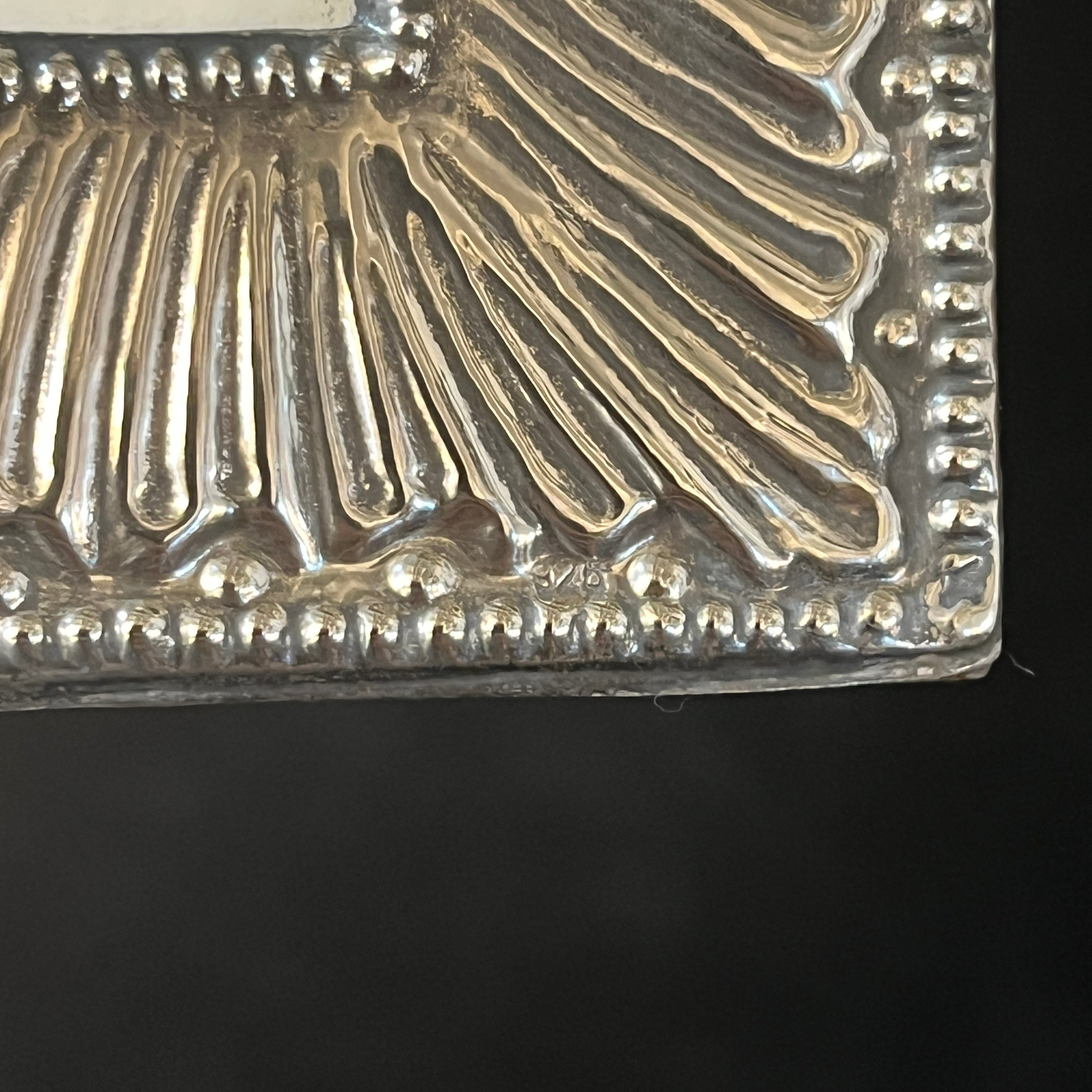 Portarretratos de madera enchapada en plata 950 con un bello repujado de relieves decorativos, generando un efecto de textura en torno a una esfera en su parte superior.