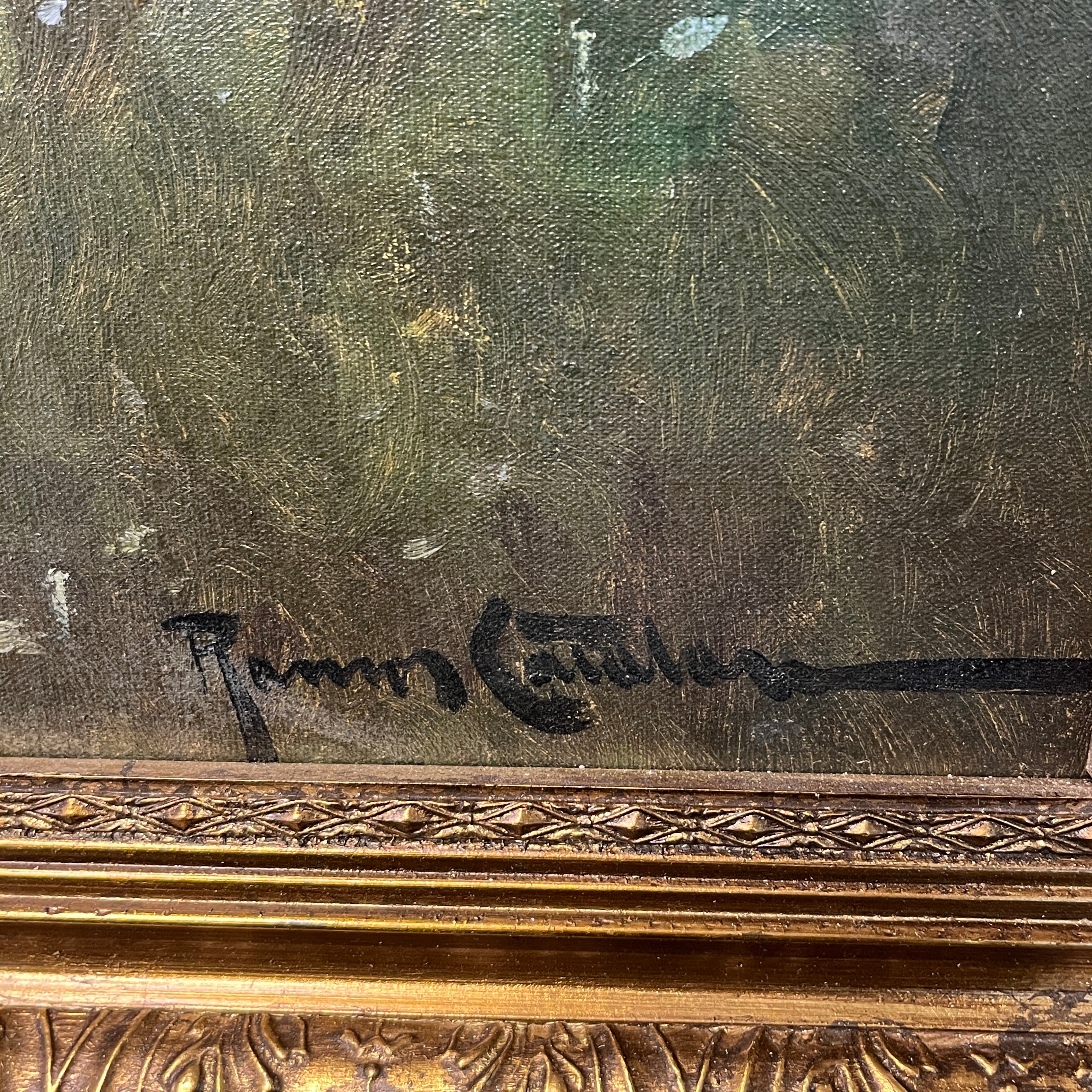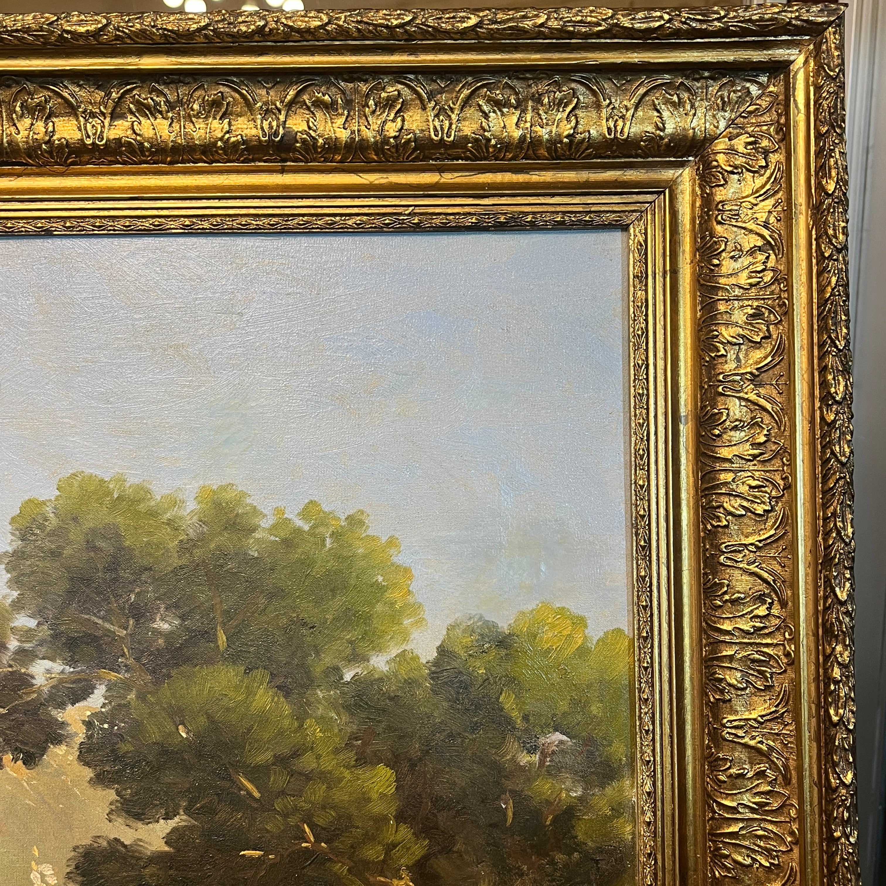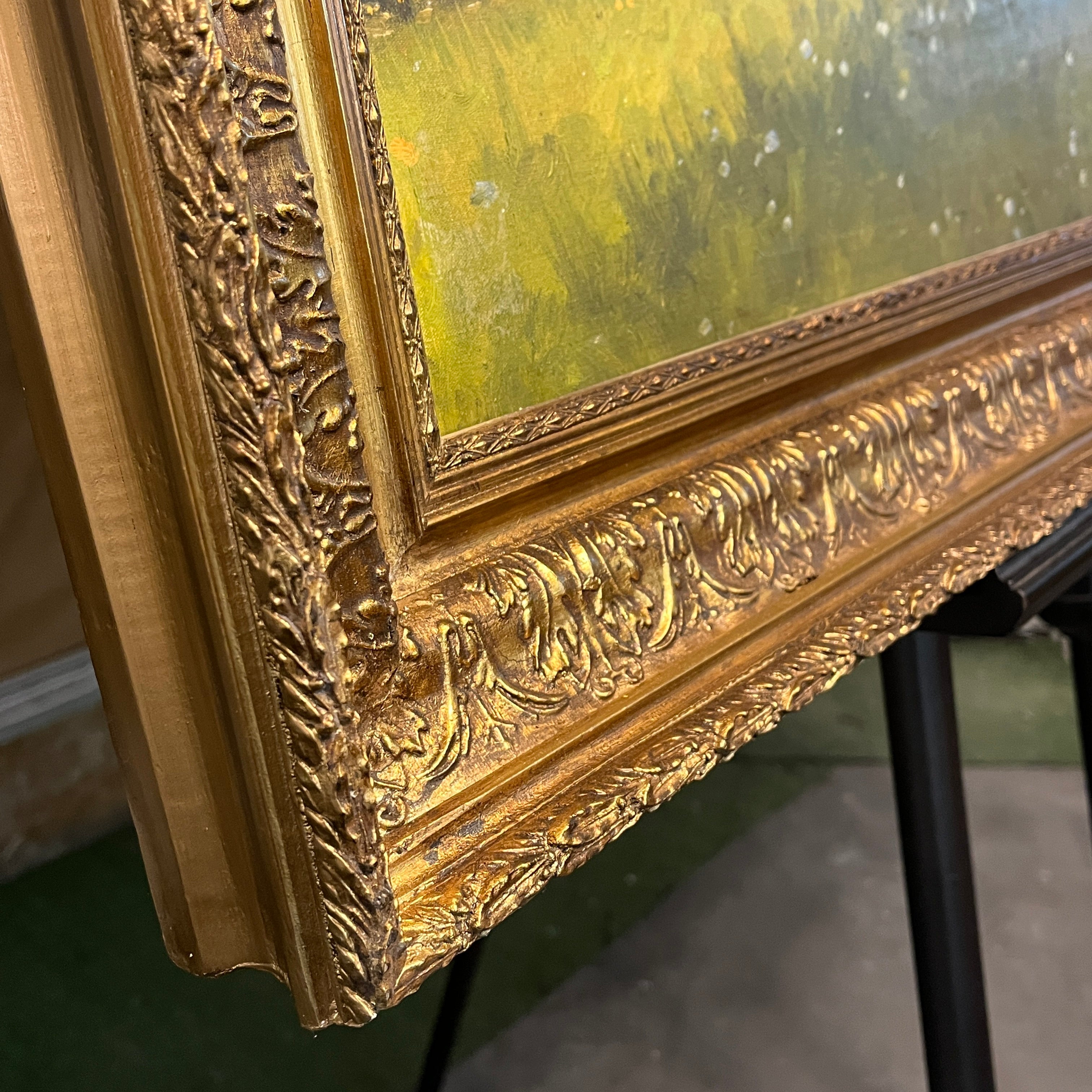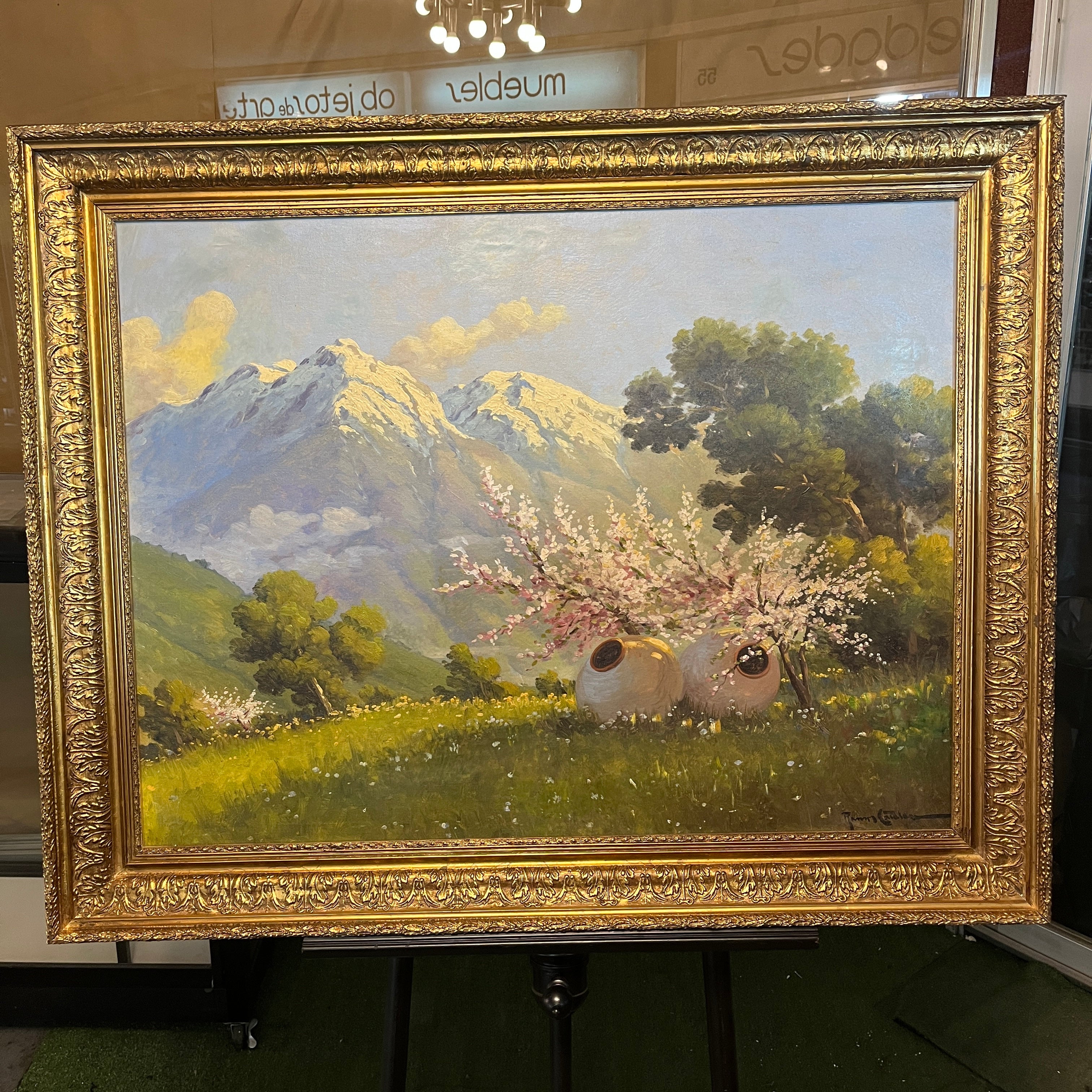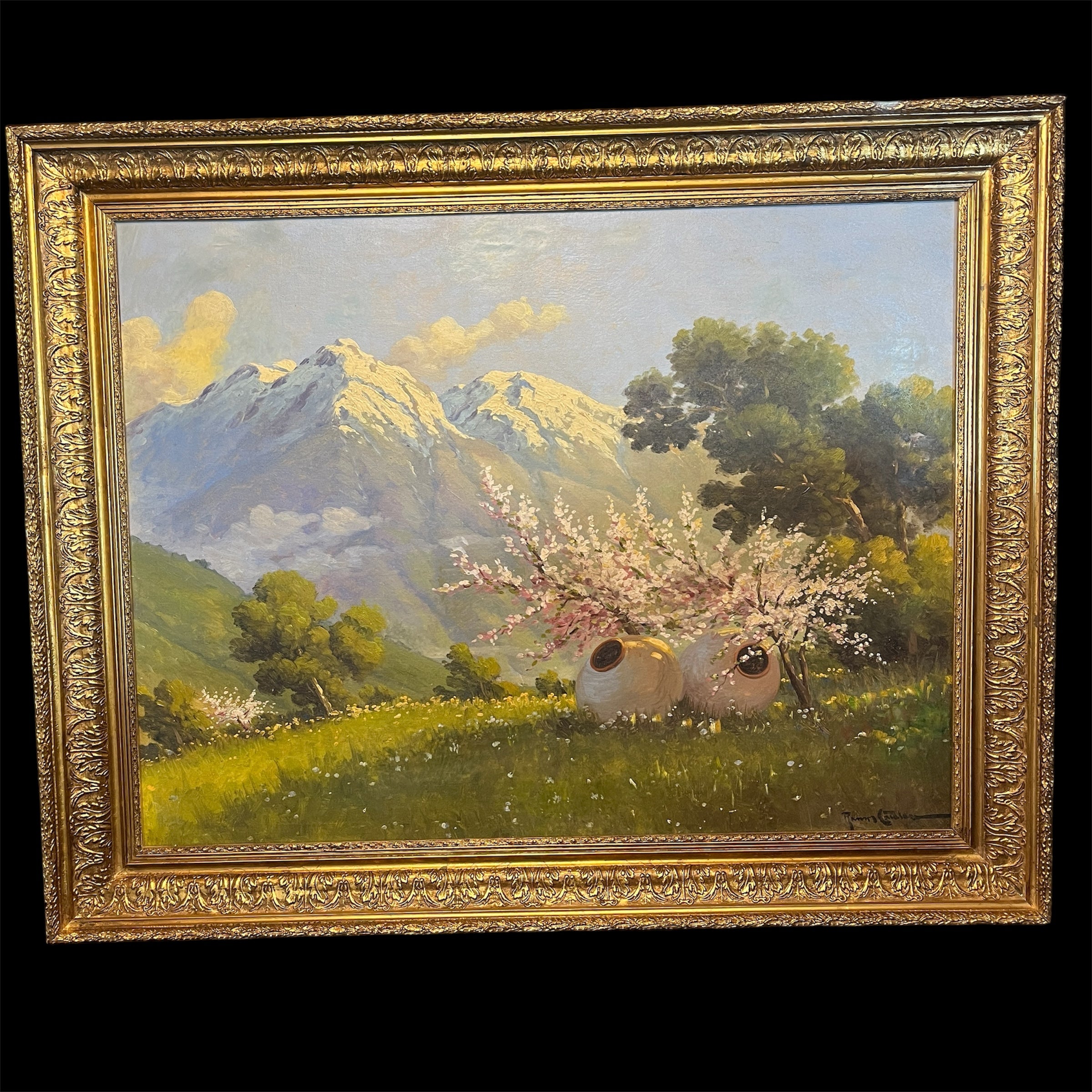 Gran óleo sobre tela del reconocido artista chileno Benito Ramos Catalán, representando un majestuoso paisaje de valle y cordillera, en la que toma protagonismo un par de tinajas de greda bajo un delicado cerezo. La obra está hecha con gran oficio y detalles. Además, está enmarcada en madera tallada en relieves y pintada de elegante dorado.