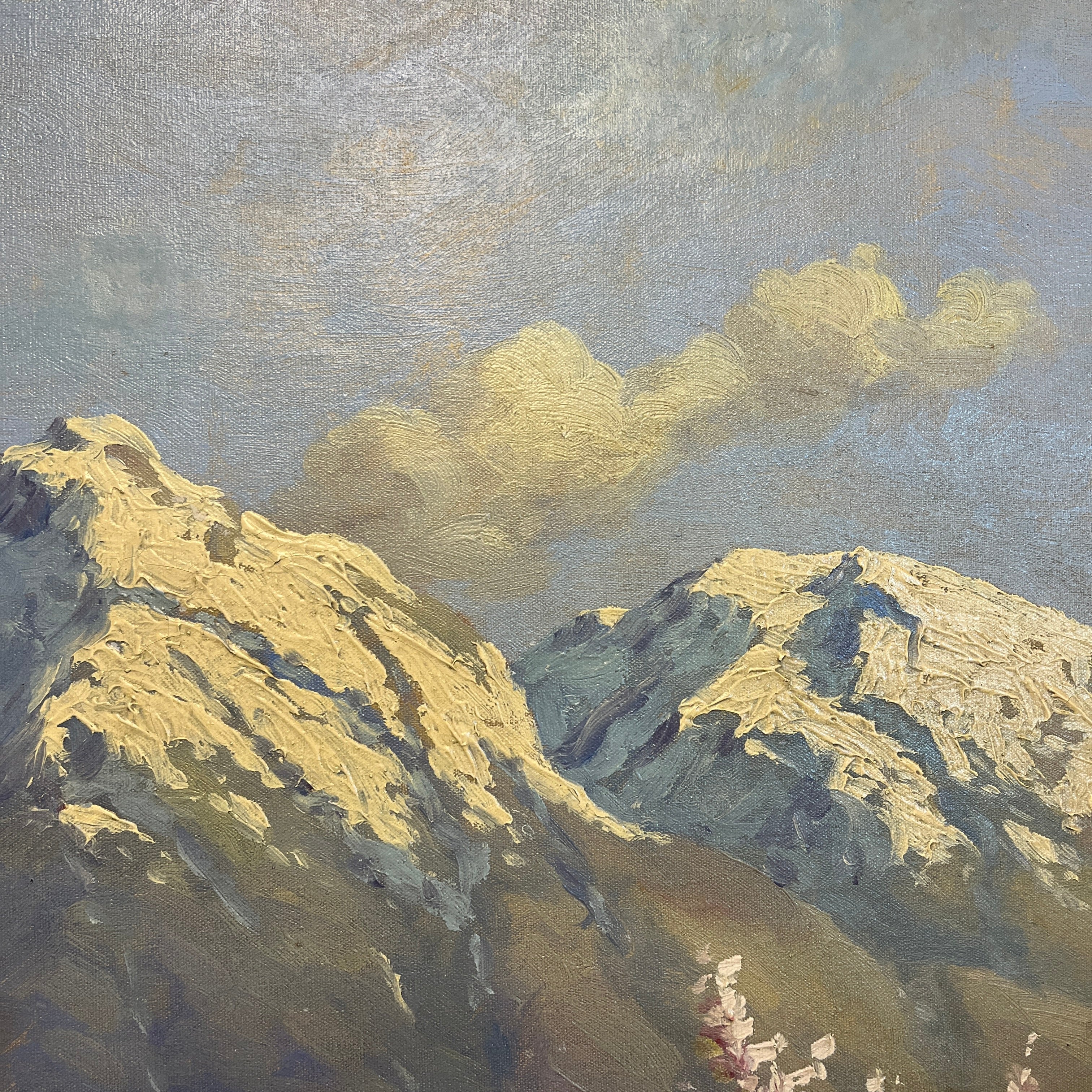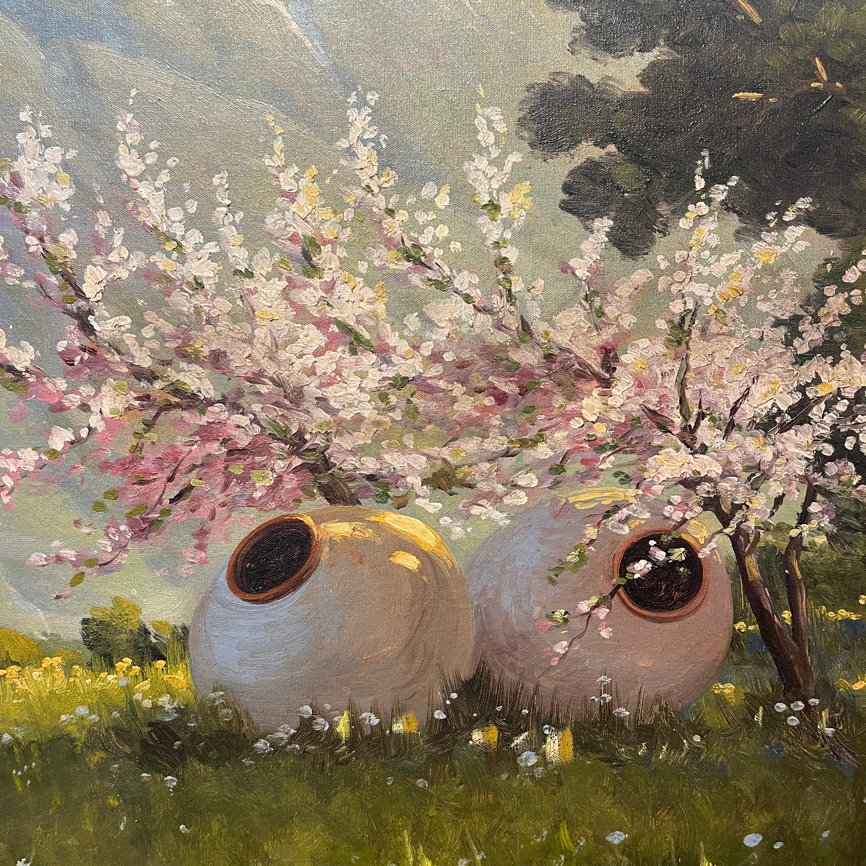Ramos Catalán - Óleo sobre tela ‘Paisaje de cordillera, tinajas y cerezo’