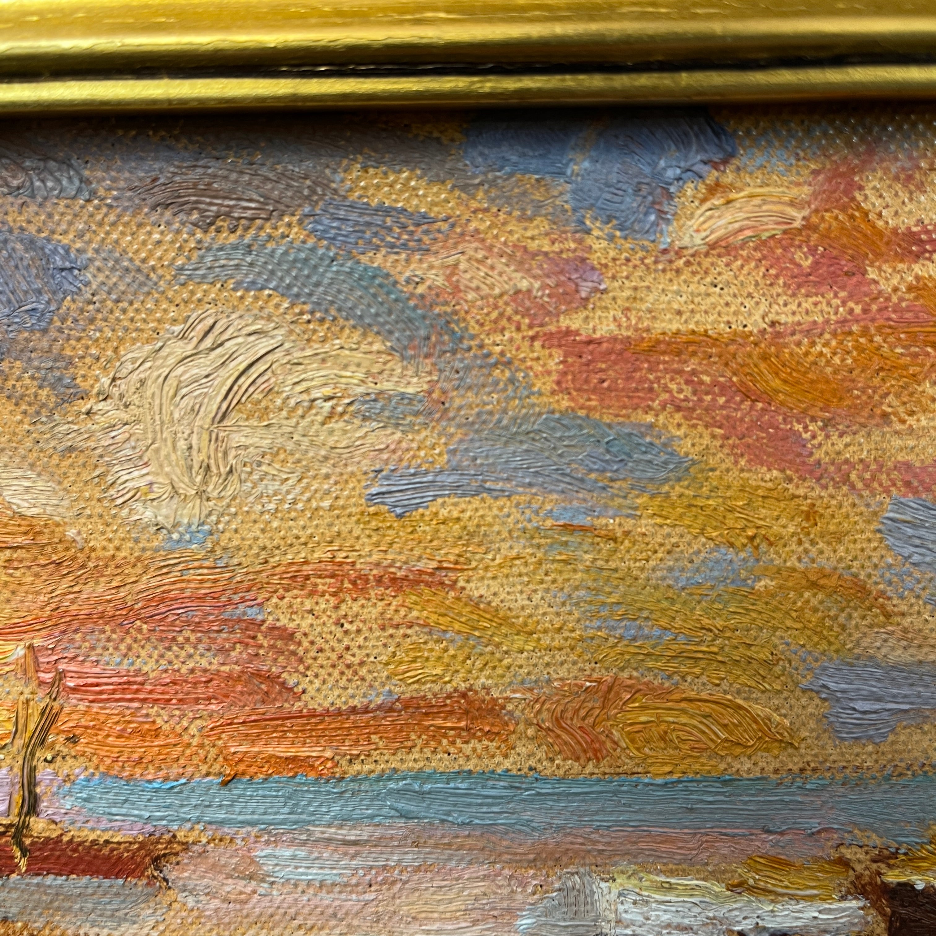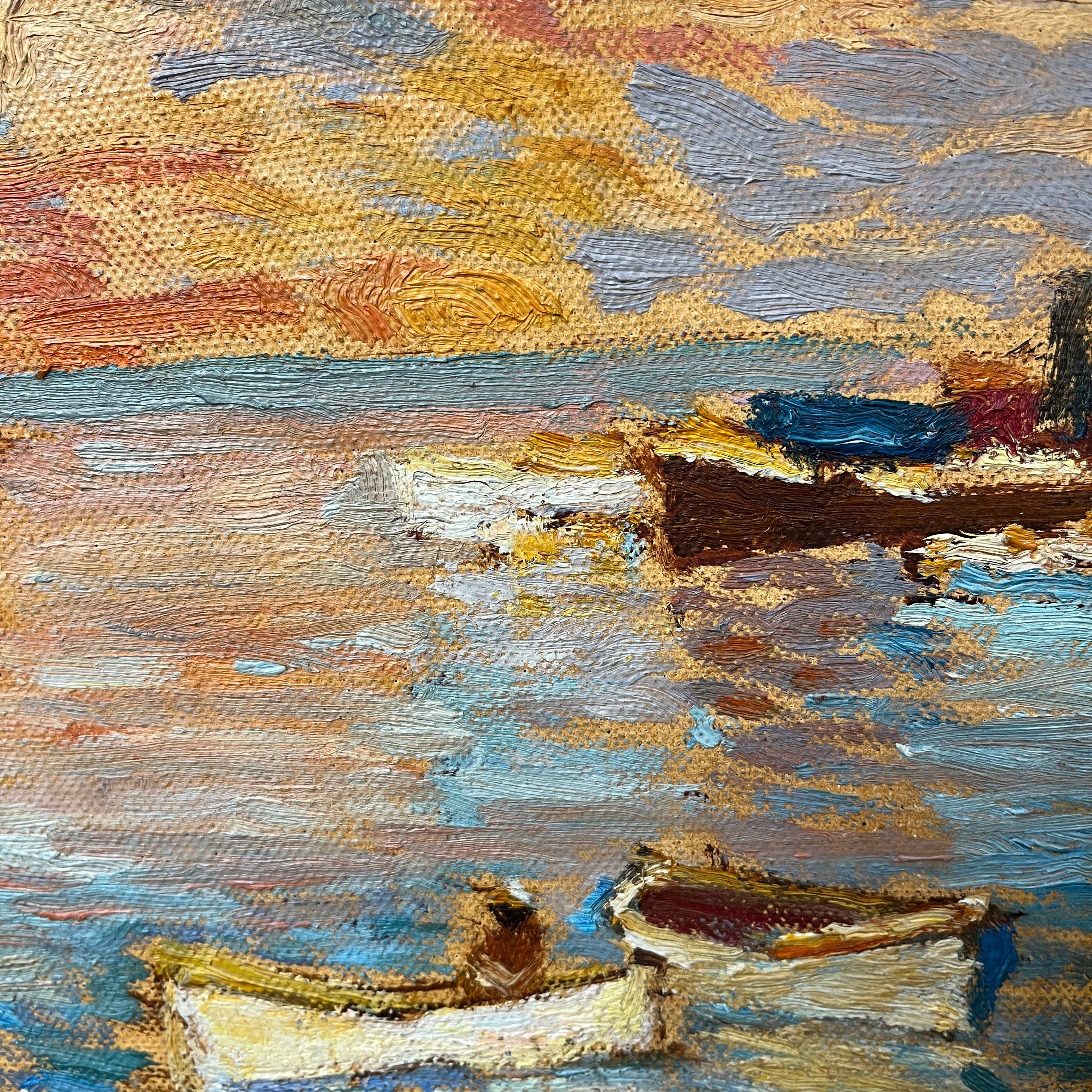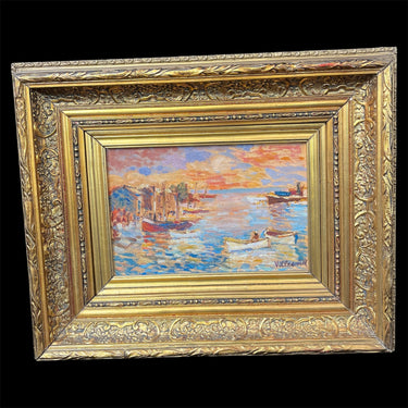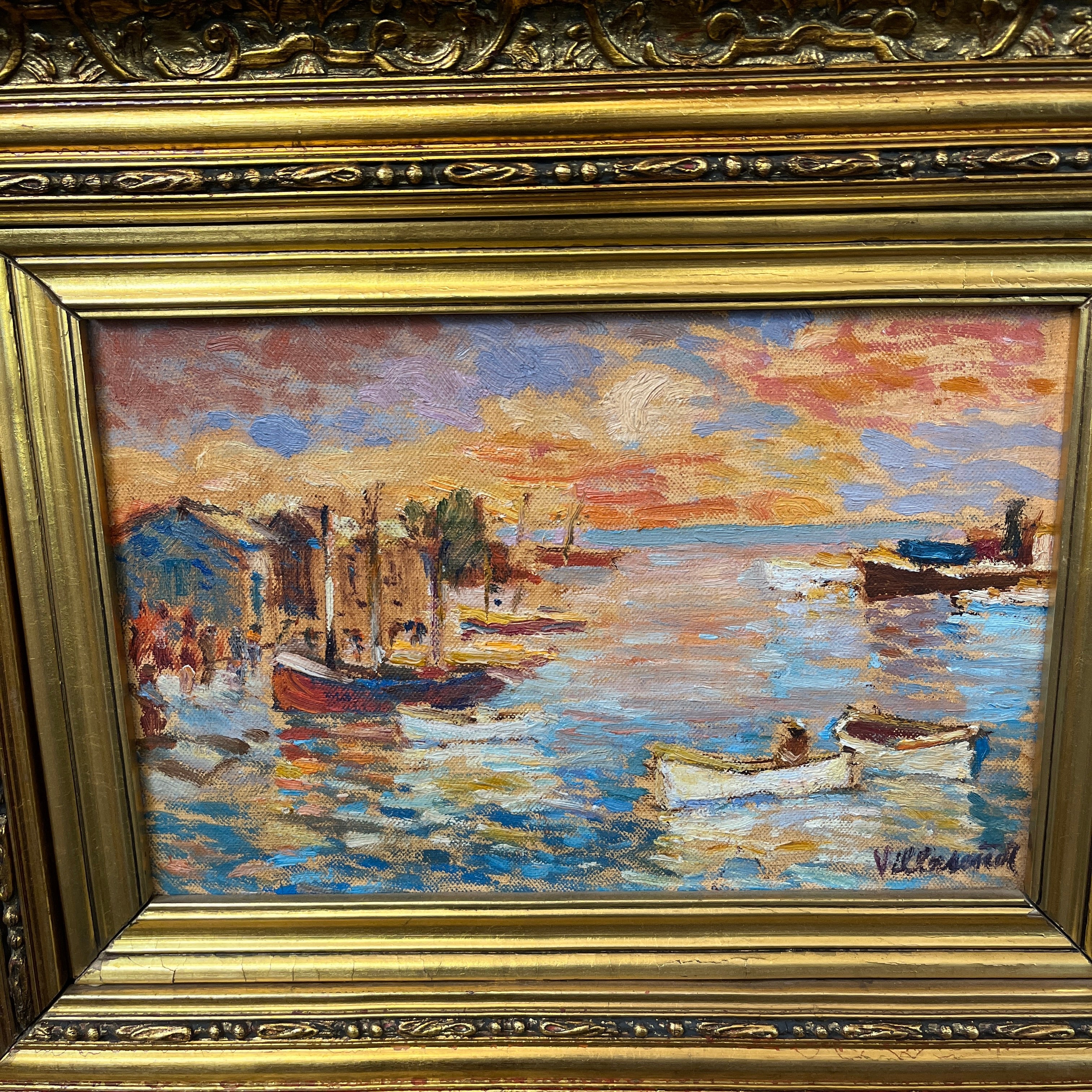 Óleo sobre tela del pintor chileno Reinaldo Villaseñor, representando un paisaje costero, mirado desde el mar hacia la costa, con algunos botes sobre el agua y casitas de colores en una de las esquinas. La obra tiene un estilo impresionista, muy acorde a la influencia de este movimiento sobre Villaseñor. La elección de colores es atrevida y viva, haciendo que la técnica y los trazos cobren relevancia, más allá de la mímesis, haciendo que el reflejo del cielo anaranjado sobre el agua se vuelva un gesto vibrante. La obra está enmarcada en madera tallada con relieves y terminada en pintura dorada.
