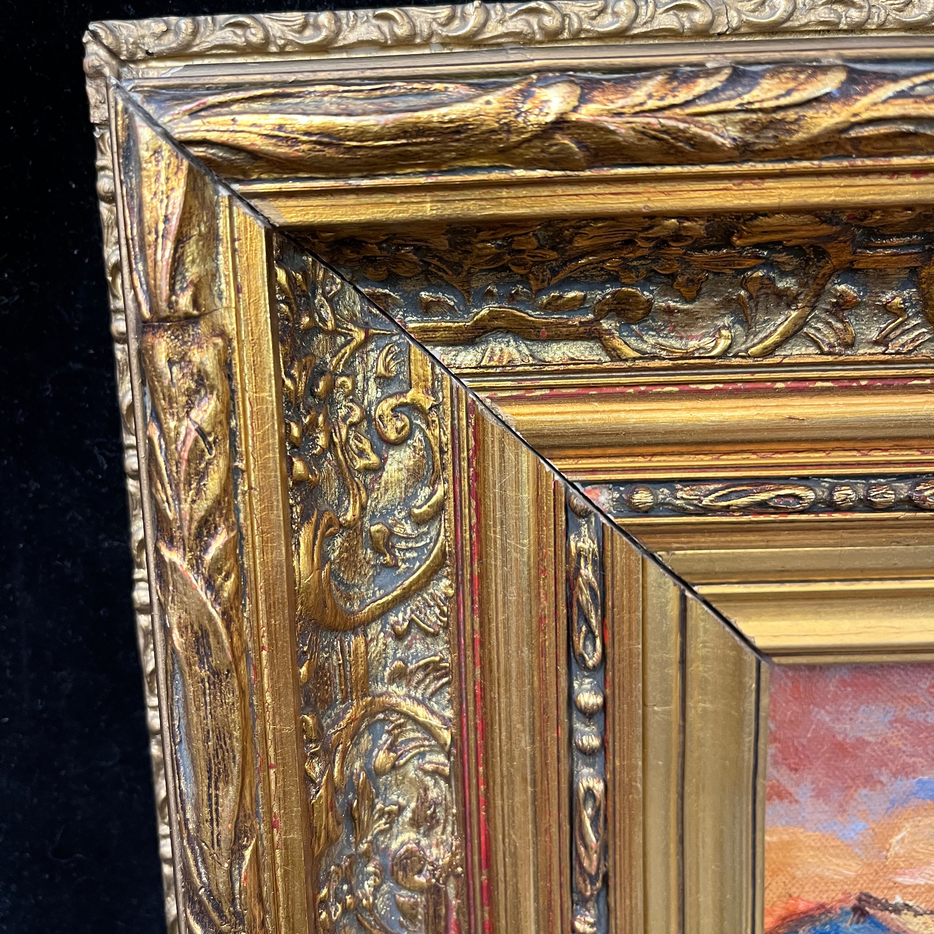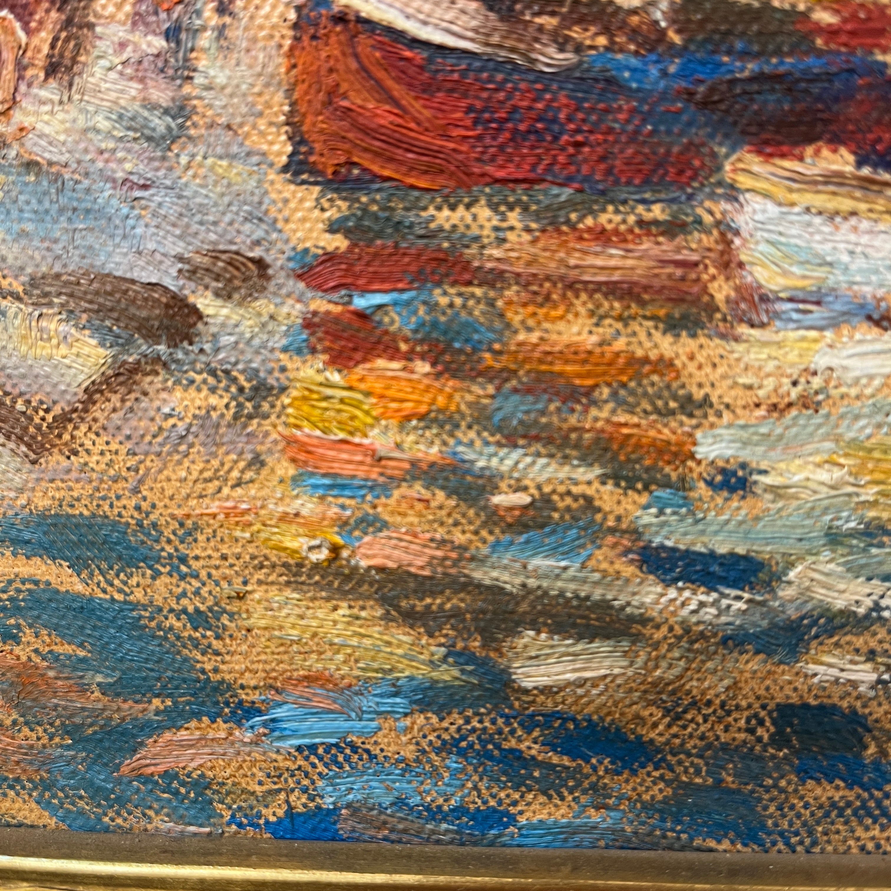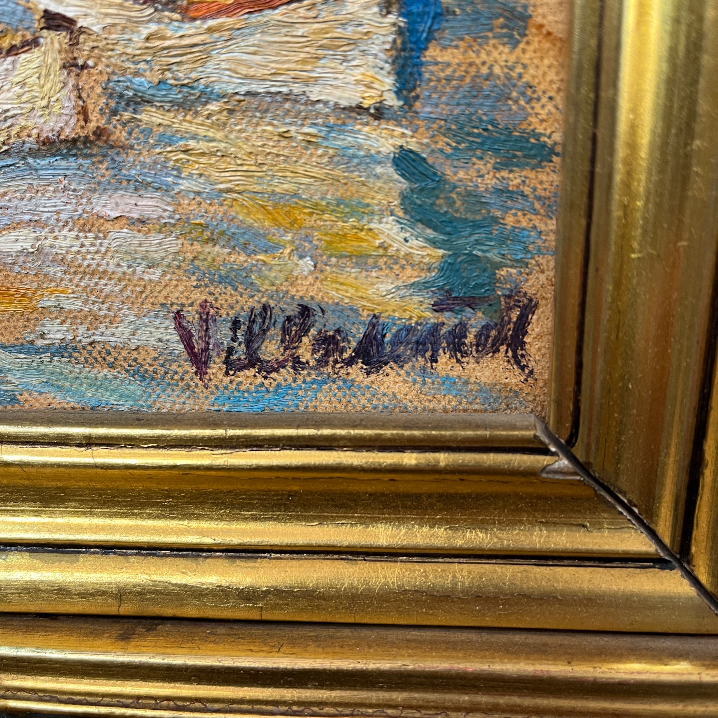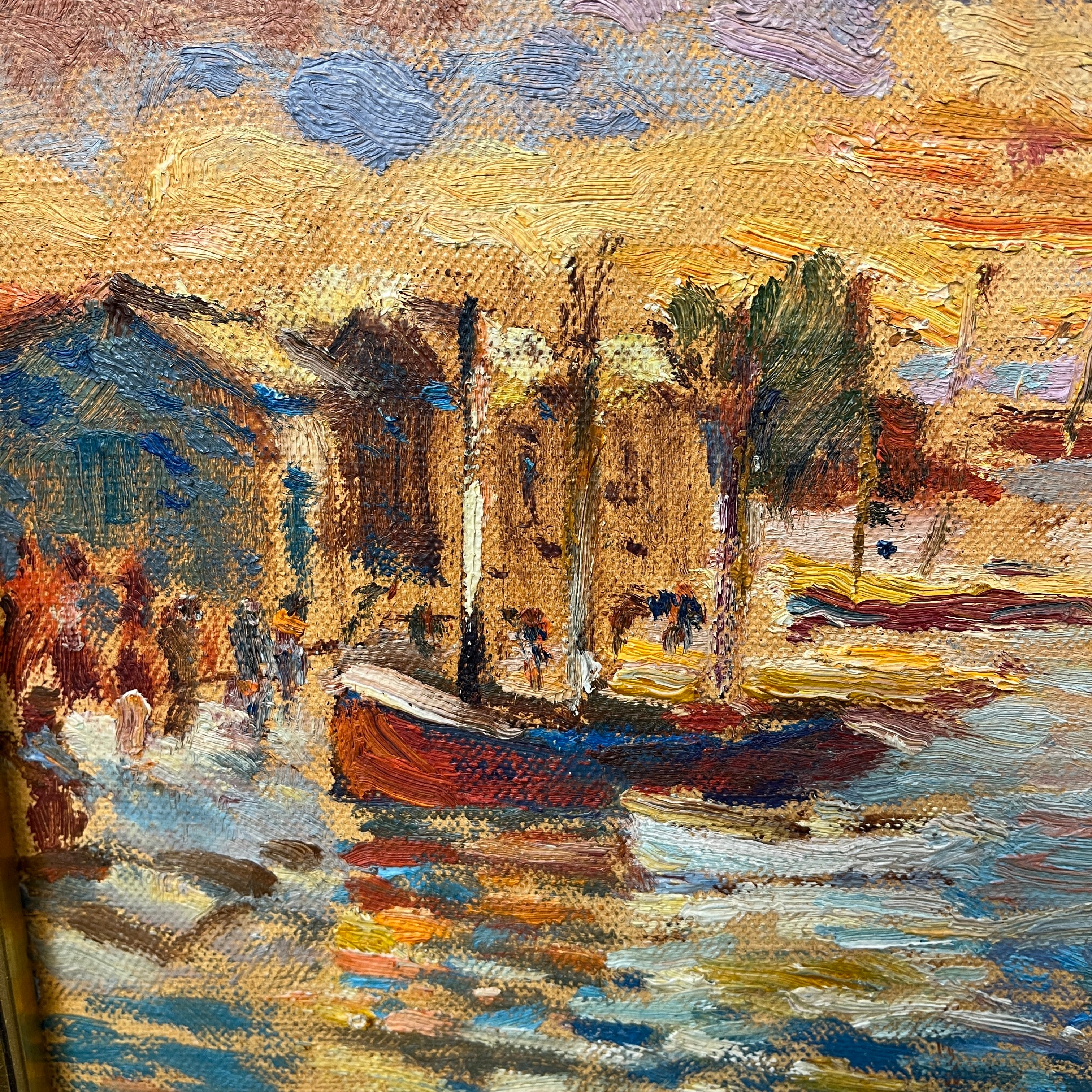 Óleo sobre tela del pintor chileno Reinaldo Villaseñor, representando un paisaje costero, mirado desde el mar hacia la costa, con algunos botes sobre el agua y casitas de colores en una de las esquinas. La obra tiene un estilo impresionista, muy acorde a la influencia de este movimiento sobre Villaseñor. La elección de colores es atrevida y viva, haciendo que la técnica y los trazos cobren relevancia, más allá de la mímesis, haciendo que el reflejo del cielo anaranjado sobre el agua se vuelva un gesto vibrante. La obra está enmarcada en madera tallada con relieves y terminada en pintura dorada.