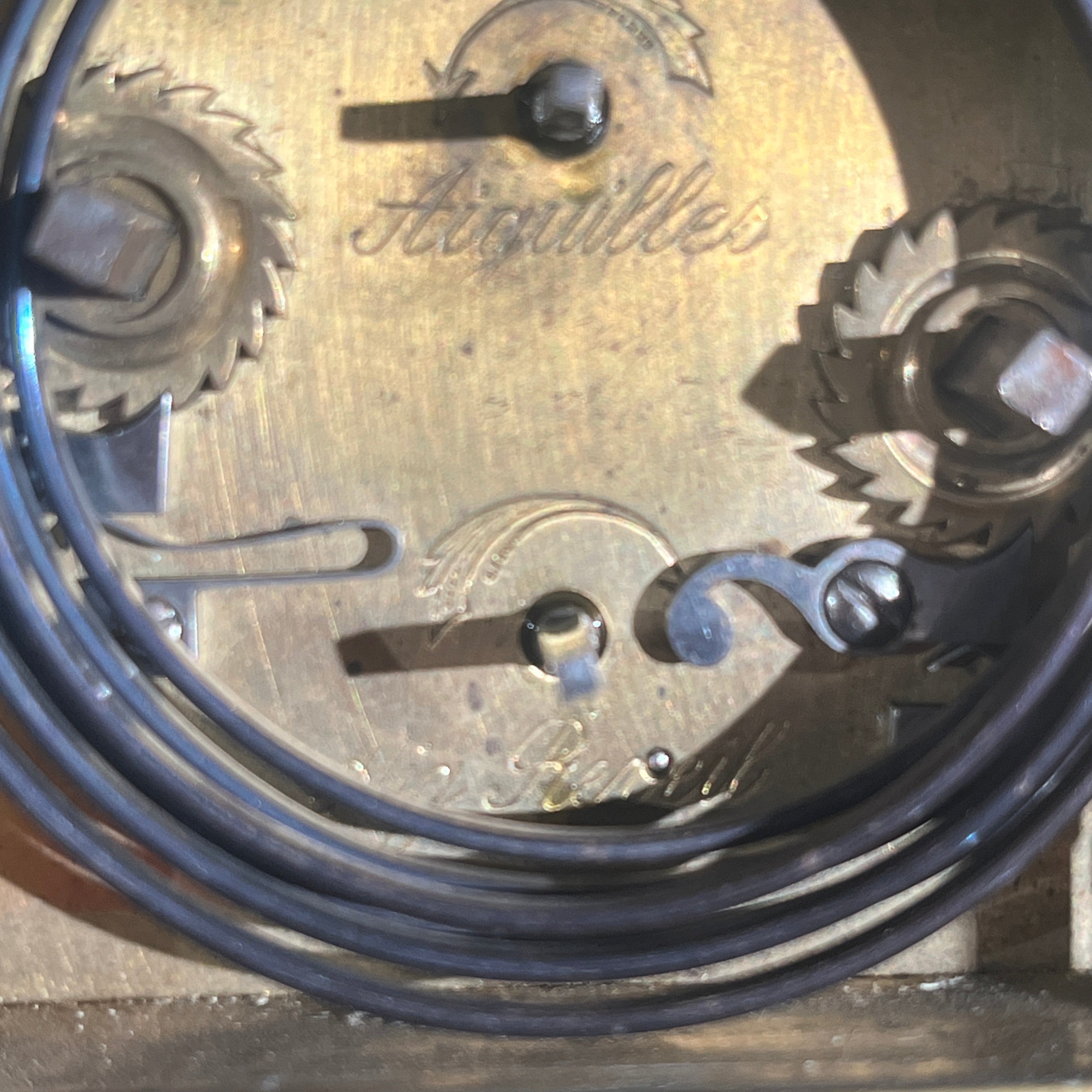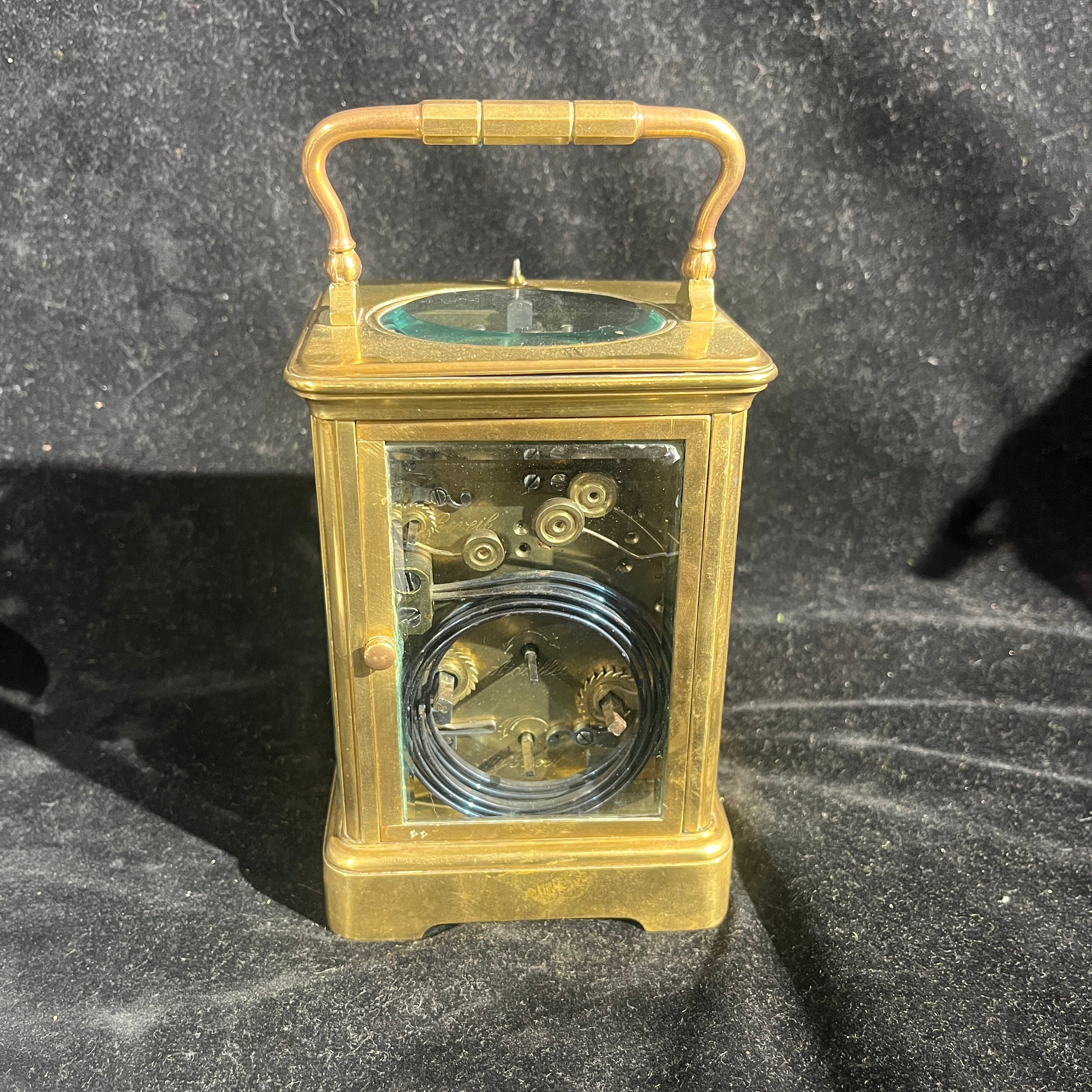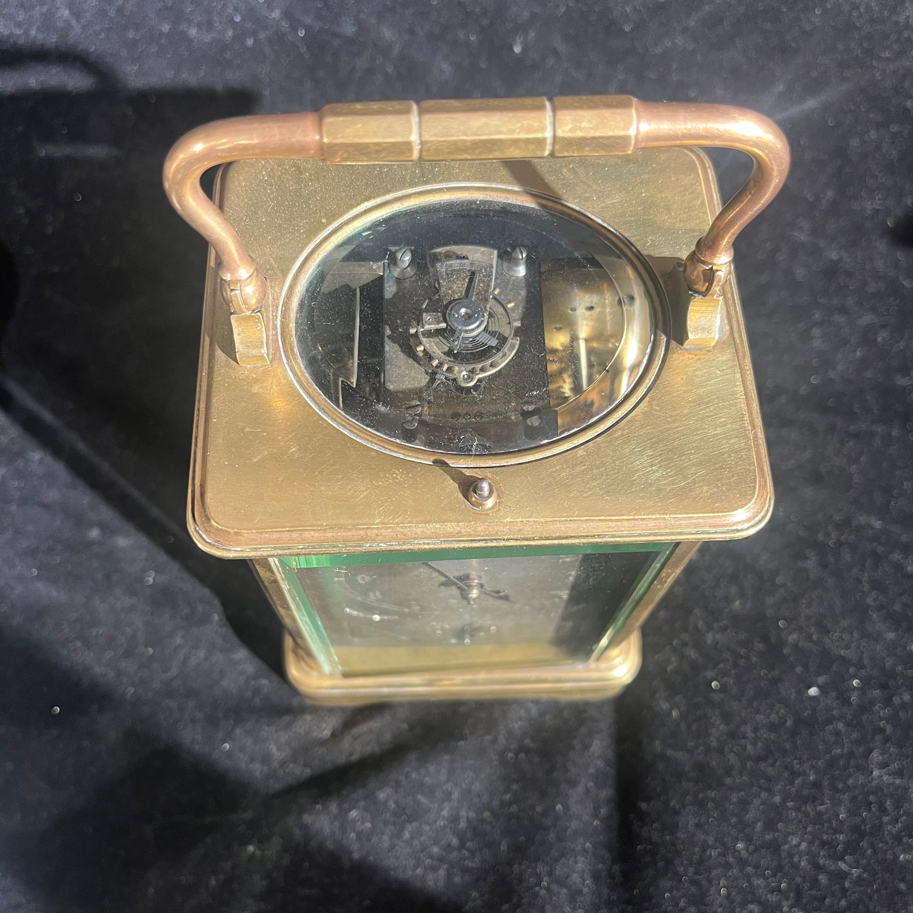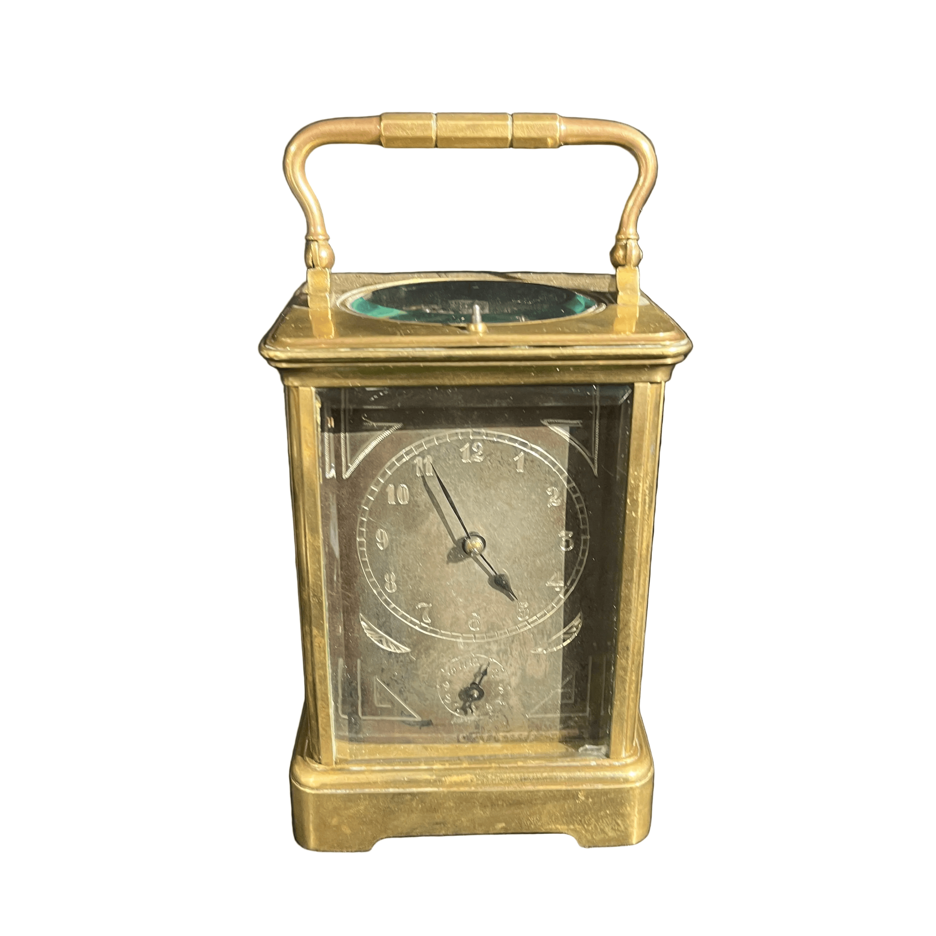 Precioso reloj carruaje francés siglo XIX con estructura de bronce dorado y finos vidrios biselados, que dejan ver su mecanismo interior. La pieza tiene un asa, remarcando su función original para ser llevado en los carruajes.