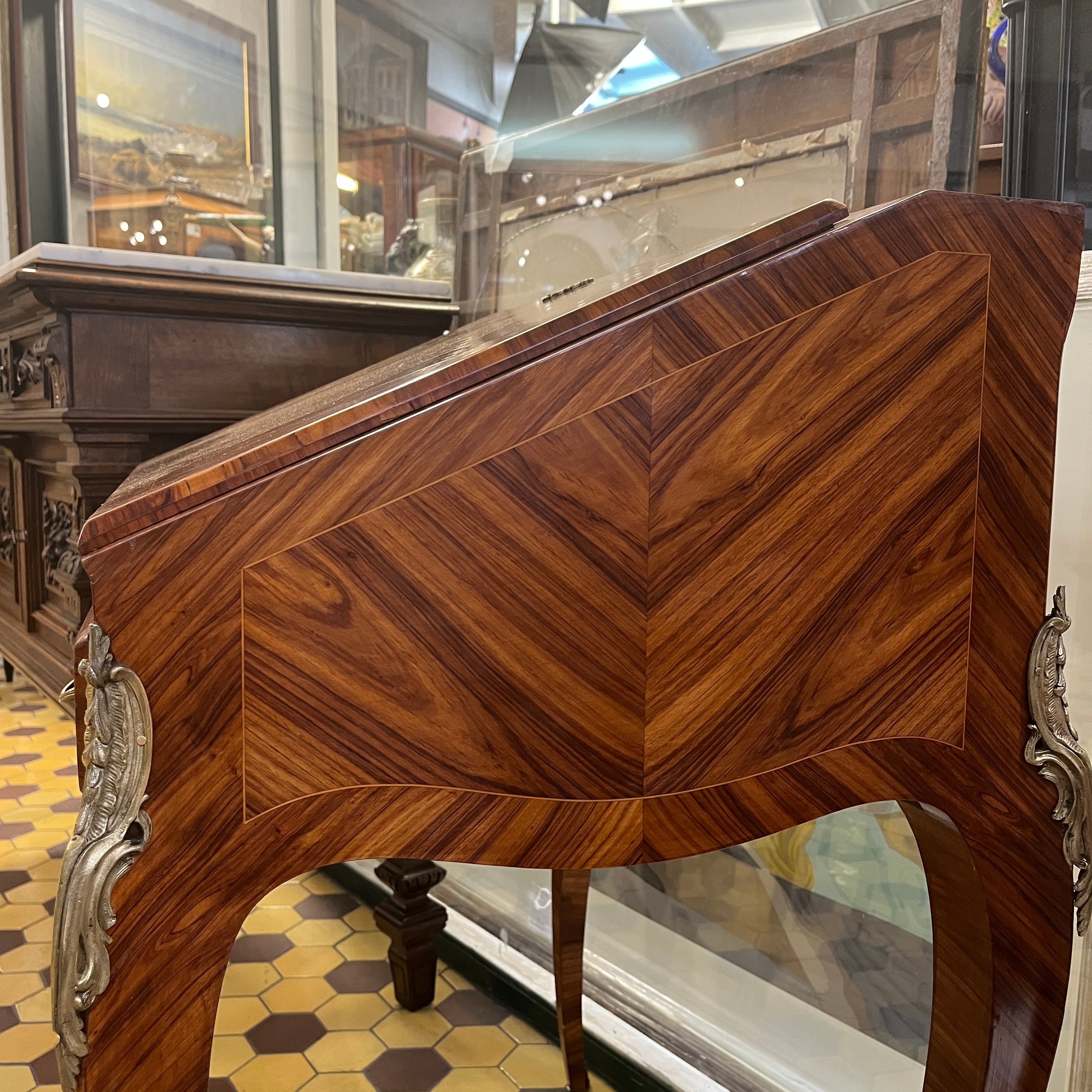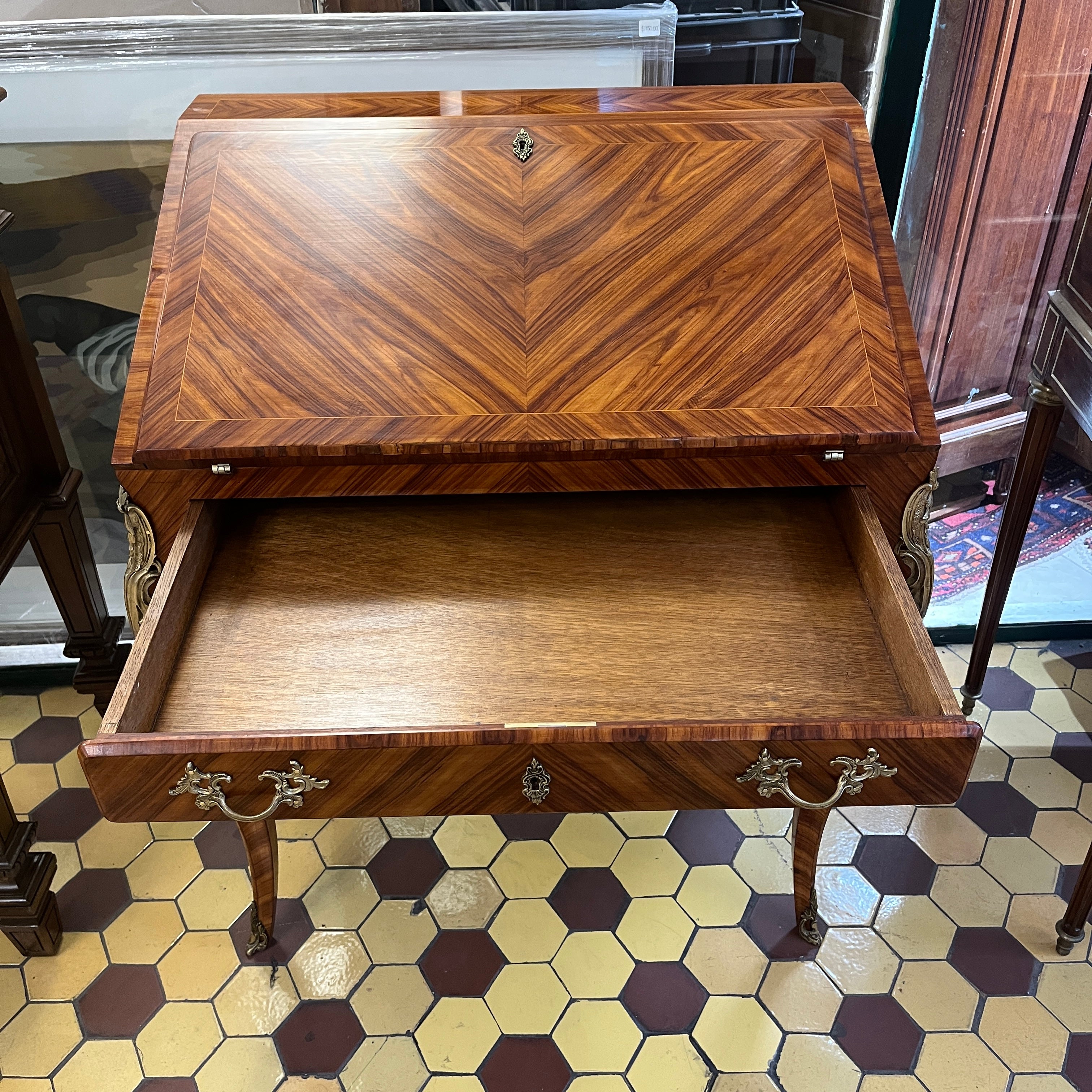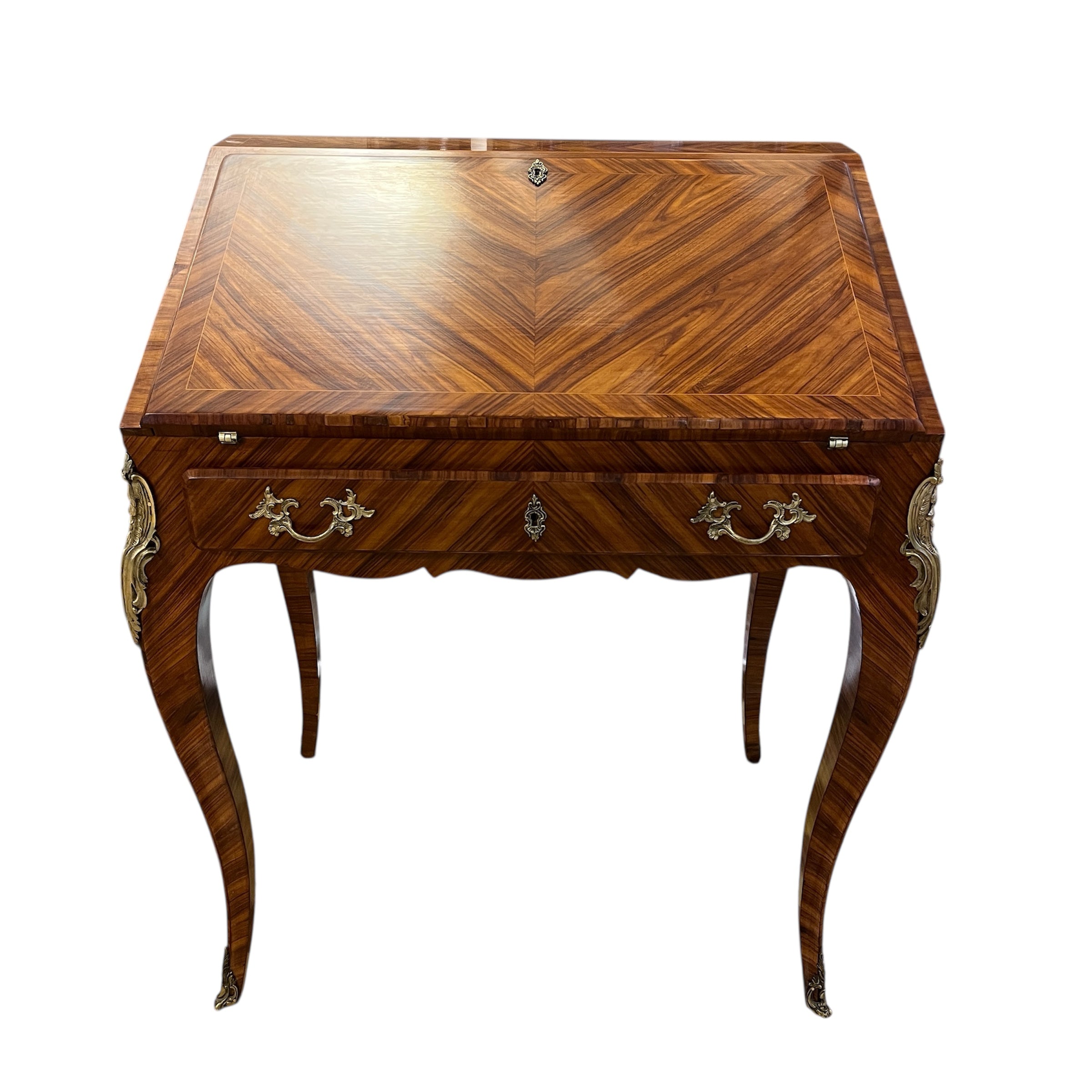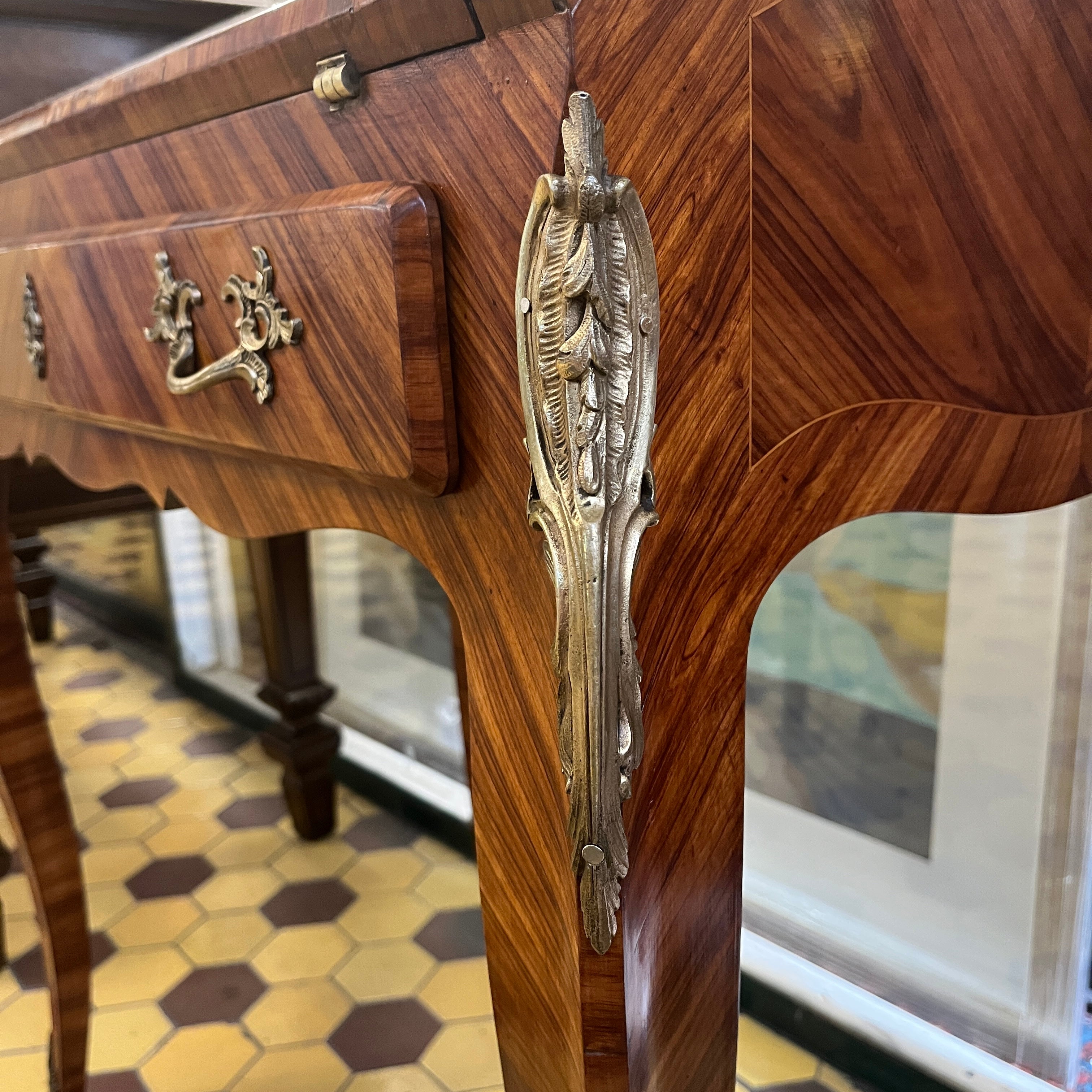 Maravilloso secretaire francés estilo Luís XV, en palisandro con aplicaciones y tiradores en bronce. Su espectacular diseño juega con las vetas de la madera creando diamantes bicolores en toda su cubierta. Las cuatro patas tienen aplicaciones en bronce, como también los bordes superiores. Posee un cajón central que ocupa todo el ancho y puerta abatible, que en su interior tiene una cubierta de cuero cafe con borde de un dorado floral y tres cajones pequeños en perfectas condiciones.