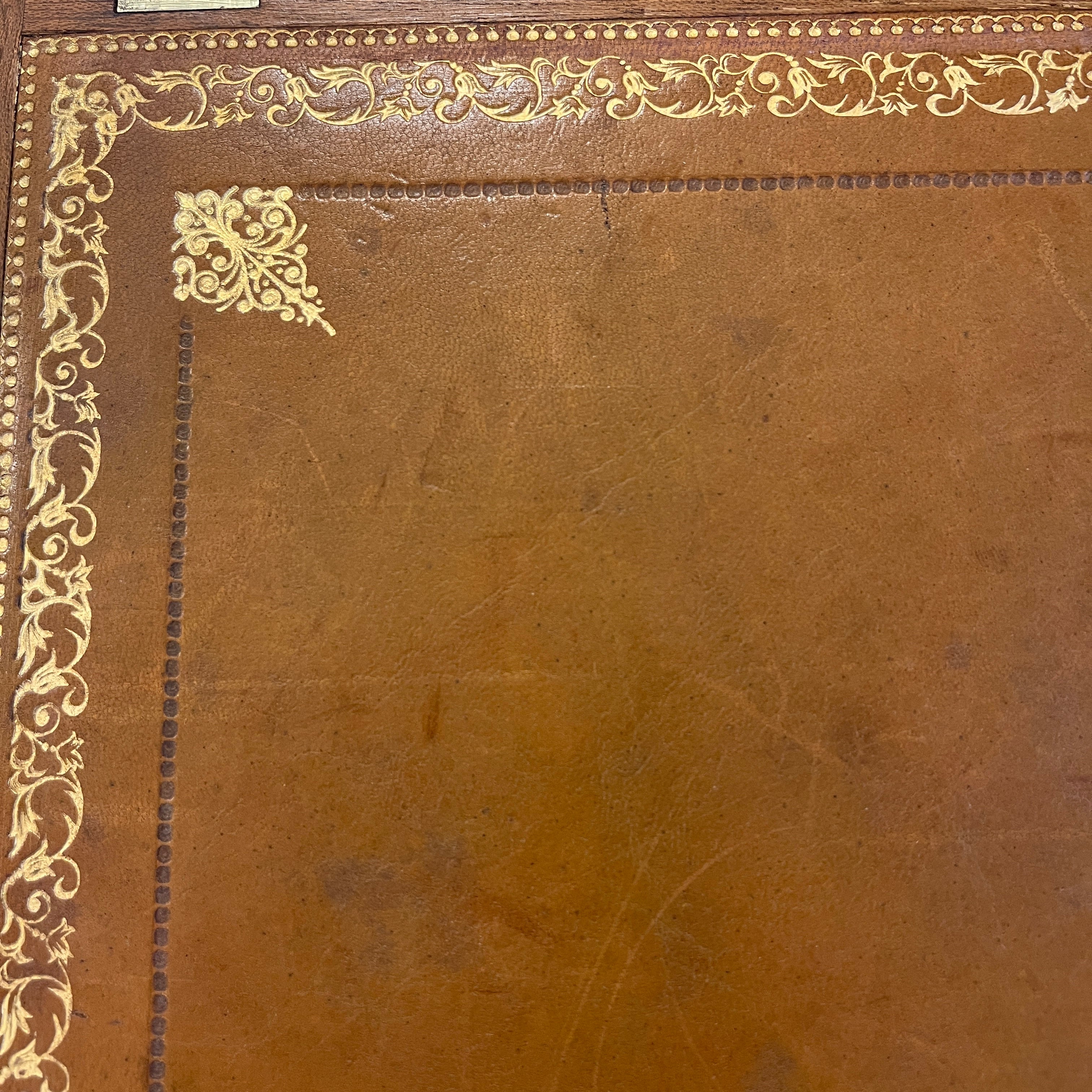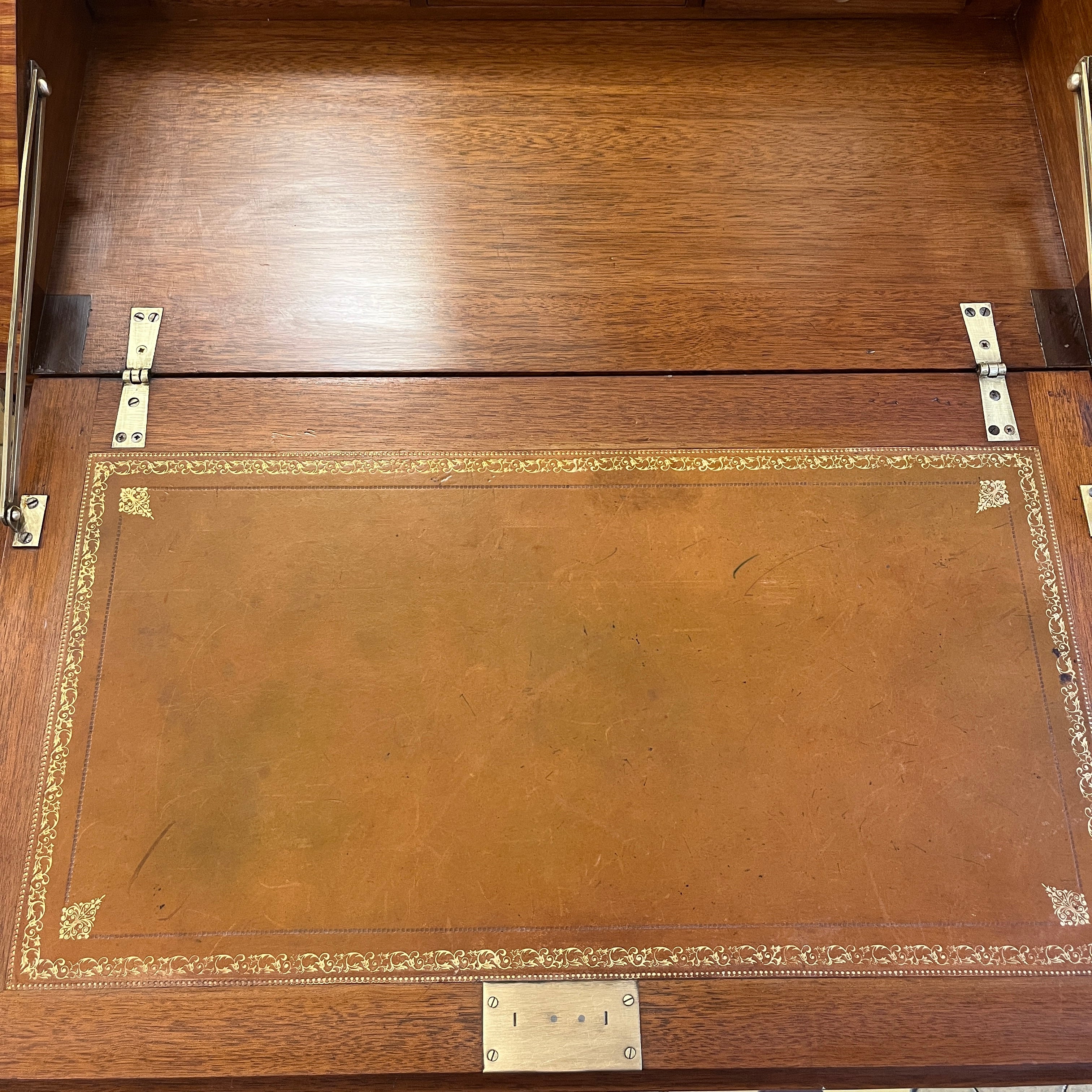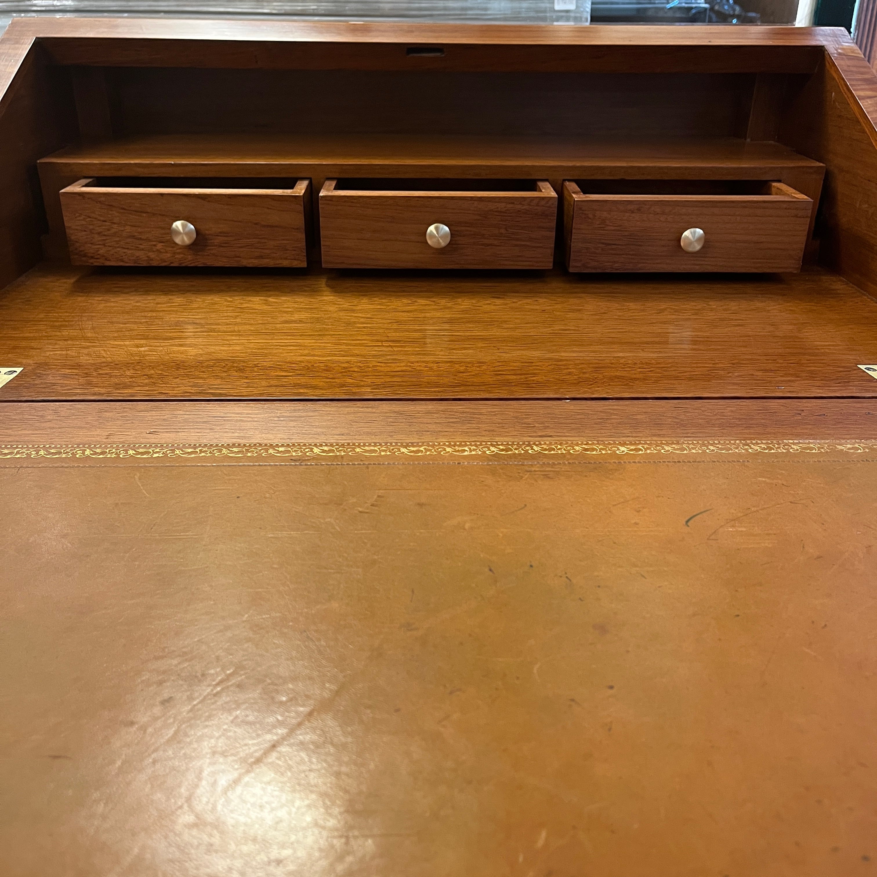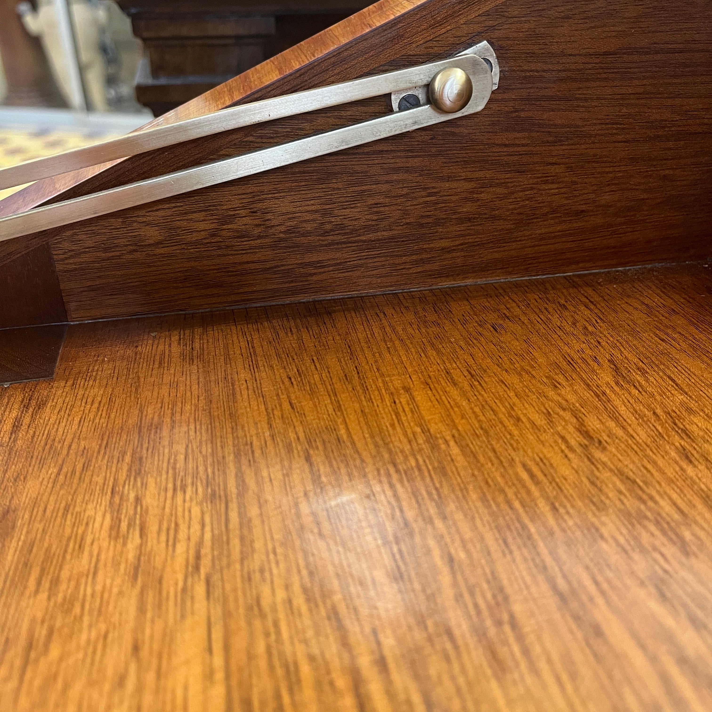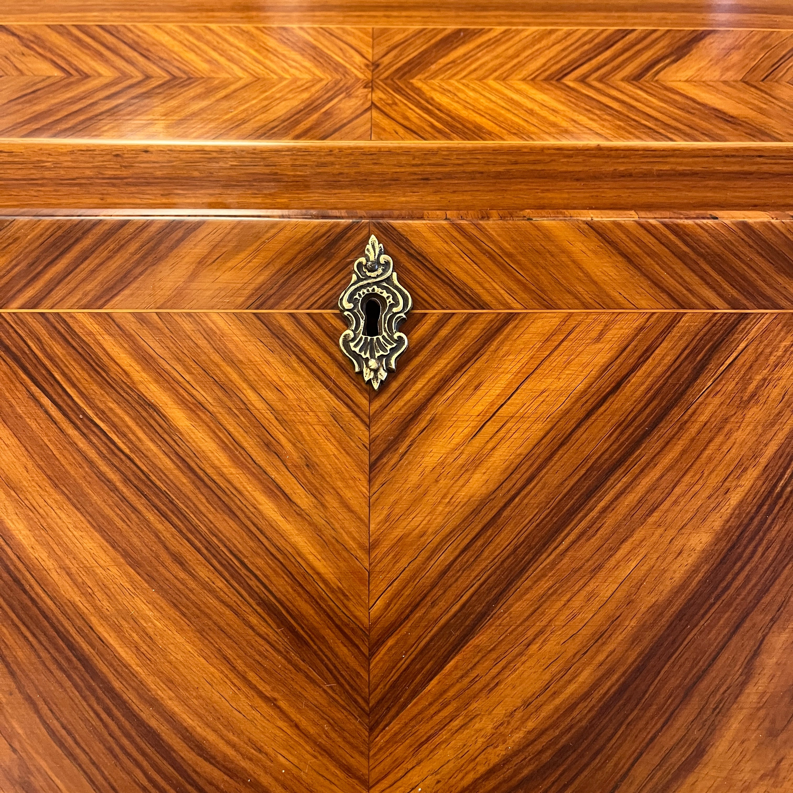 Maravilloso secretaire francés estilo Luís XV, en palisandro con aplicaciones y tiradores en bronce. Su espectacular diseño juega con las vetas de la madera creando diamantes bicolores en toda su cubierta. Las cuatro patas tienen aplicaciones en bronce, como también los bordes superiores. Posee un cajón central que ocupa todo el ancho y puerta abatible, que en su interior tiene una cubierta de cuero cafe con borde de un dorado floral y tres cajones pequeños en perfectas condiciones.