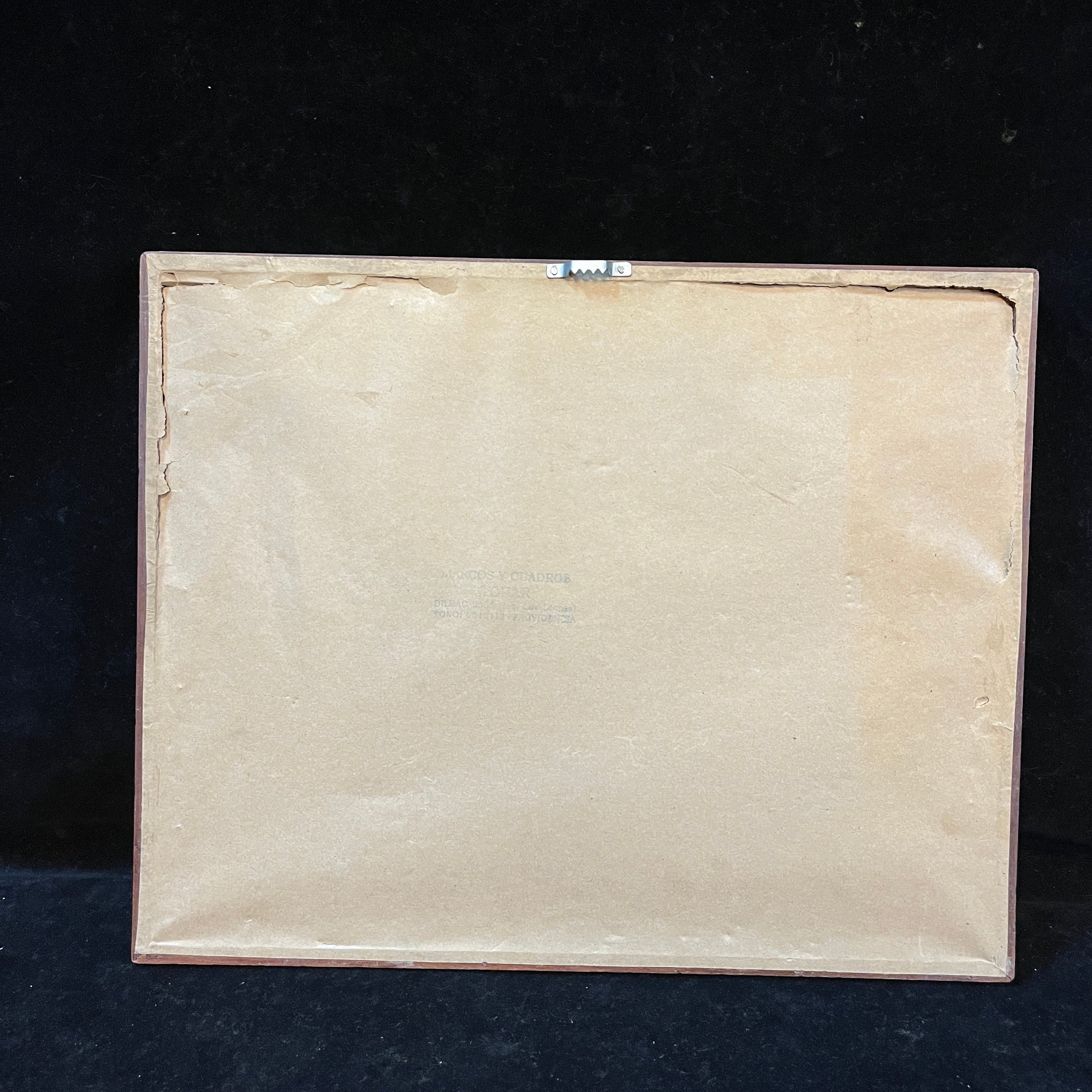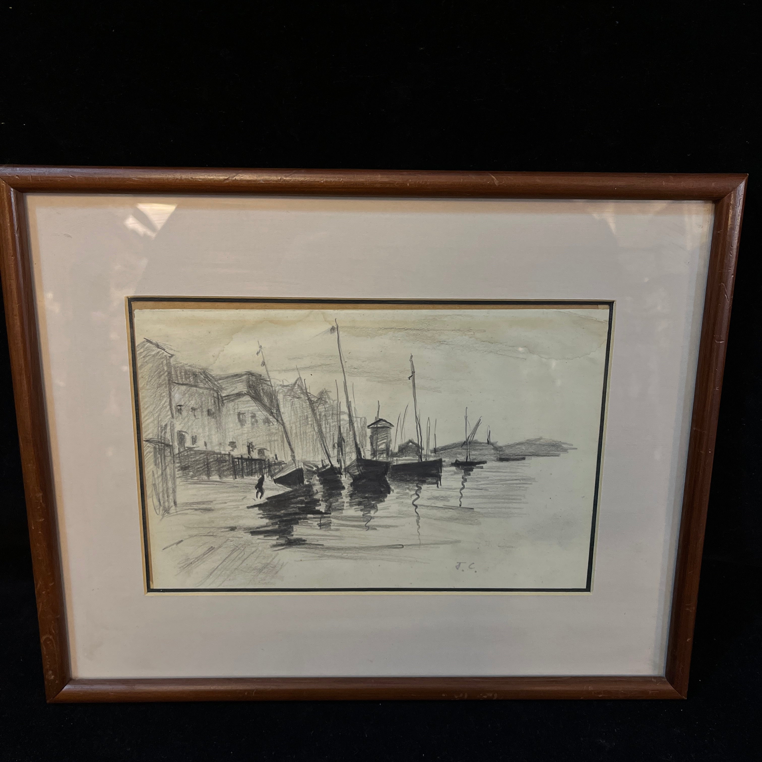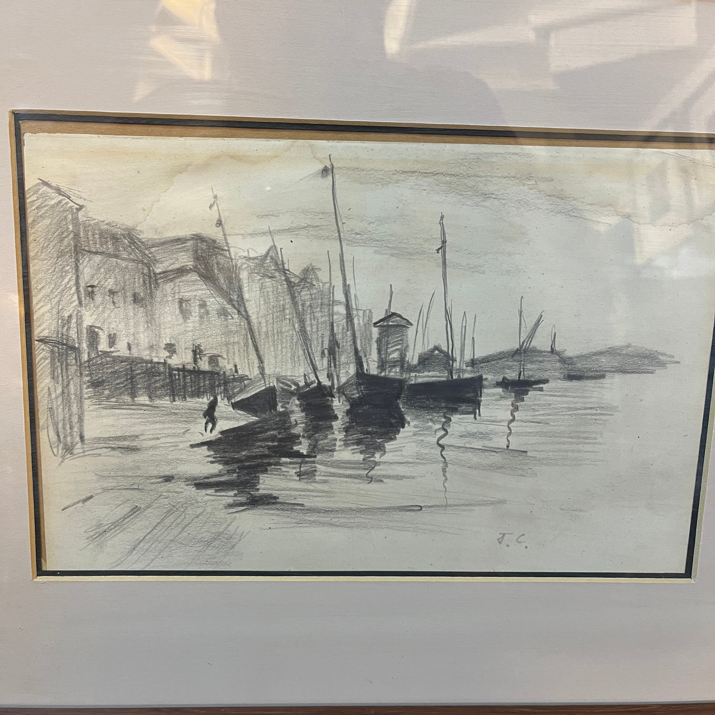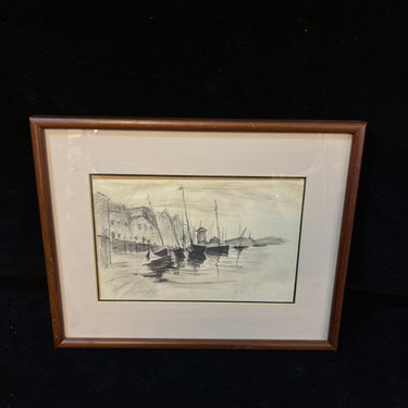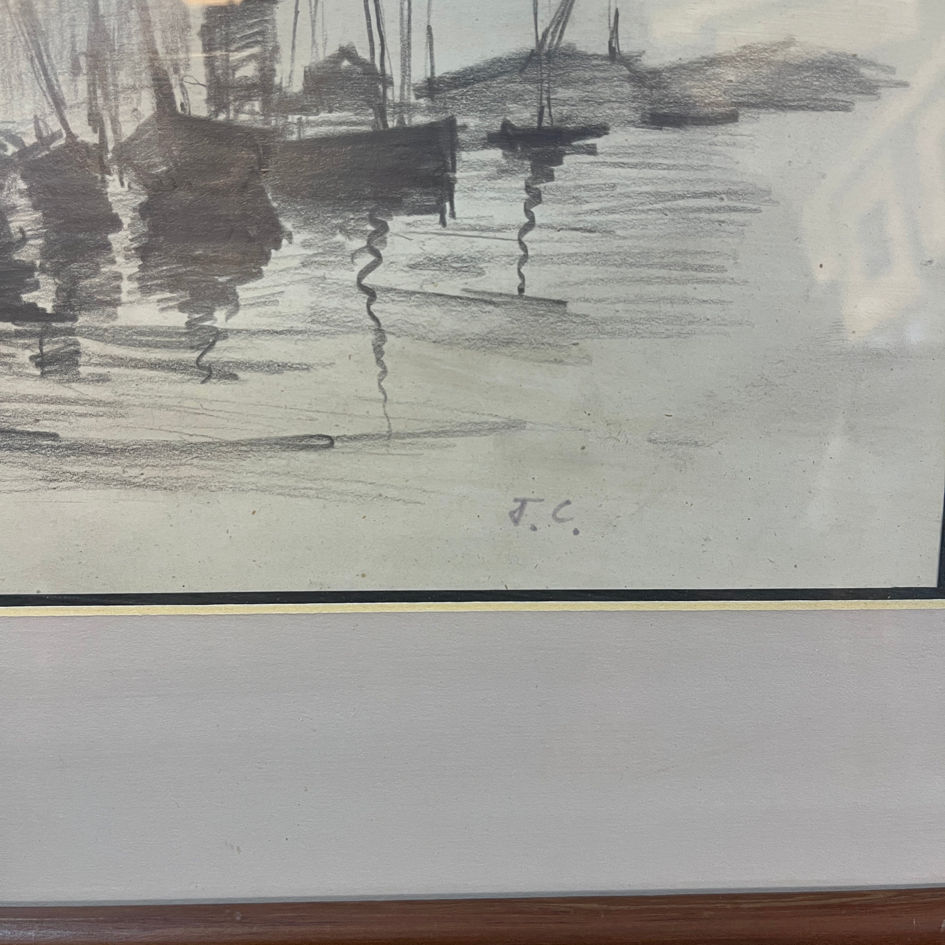 Grafito sobre papel, firmado J.C, representando unos botes amarrados a un pequeño puerto, con algunos edificios en la orilla. Se trata de una obra sencilla, pero muy bien ejecutada, utilizando el grafito para capturar de manera versátil todos los elementos del paisaje. Cabe destacar el trabajo de sombras y reflejos en el agua, especialmente logrado, dándole movimiento a la composición. La obra está enmarcada en un sutil marco ed madera café, con paspartú blanco.