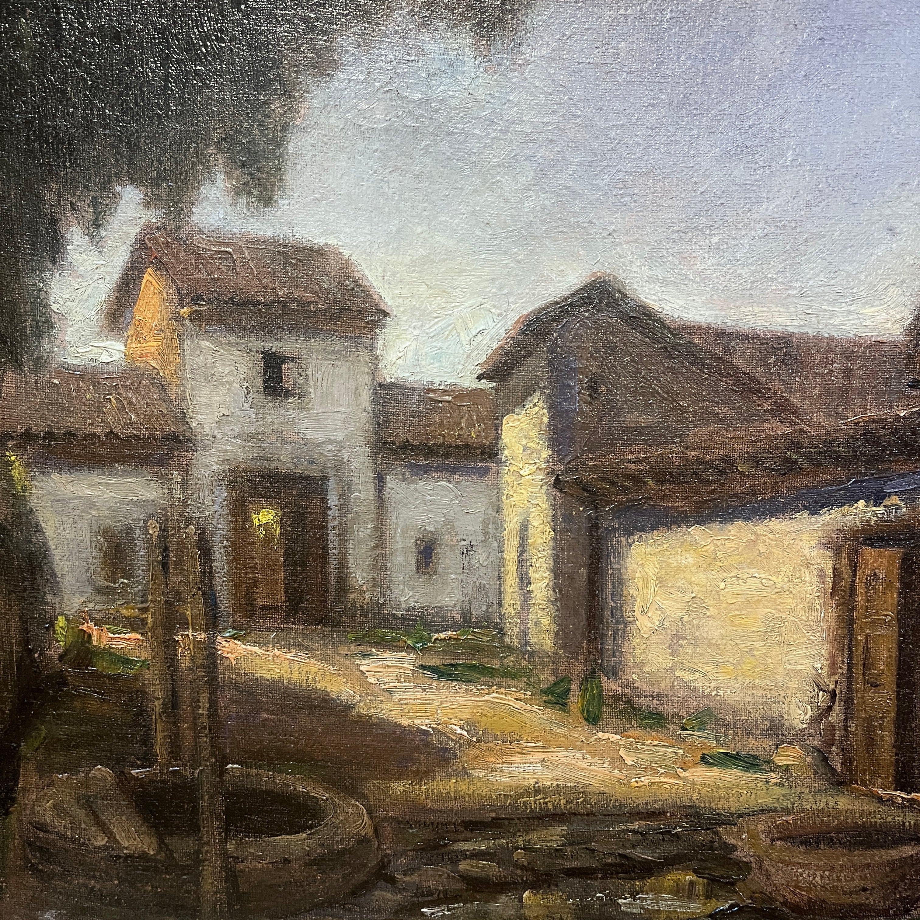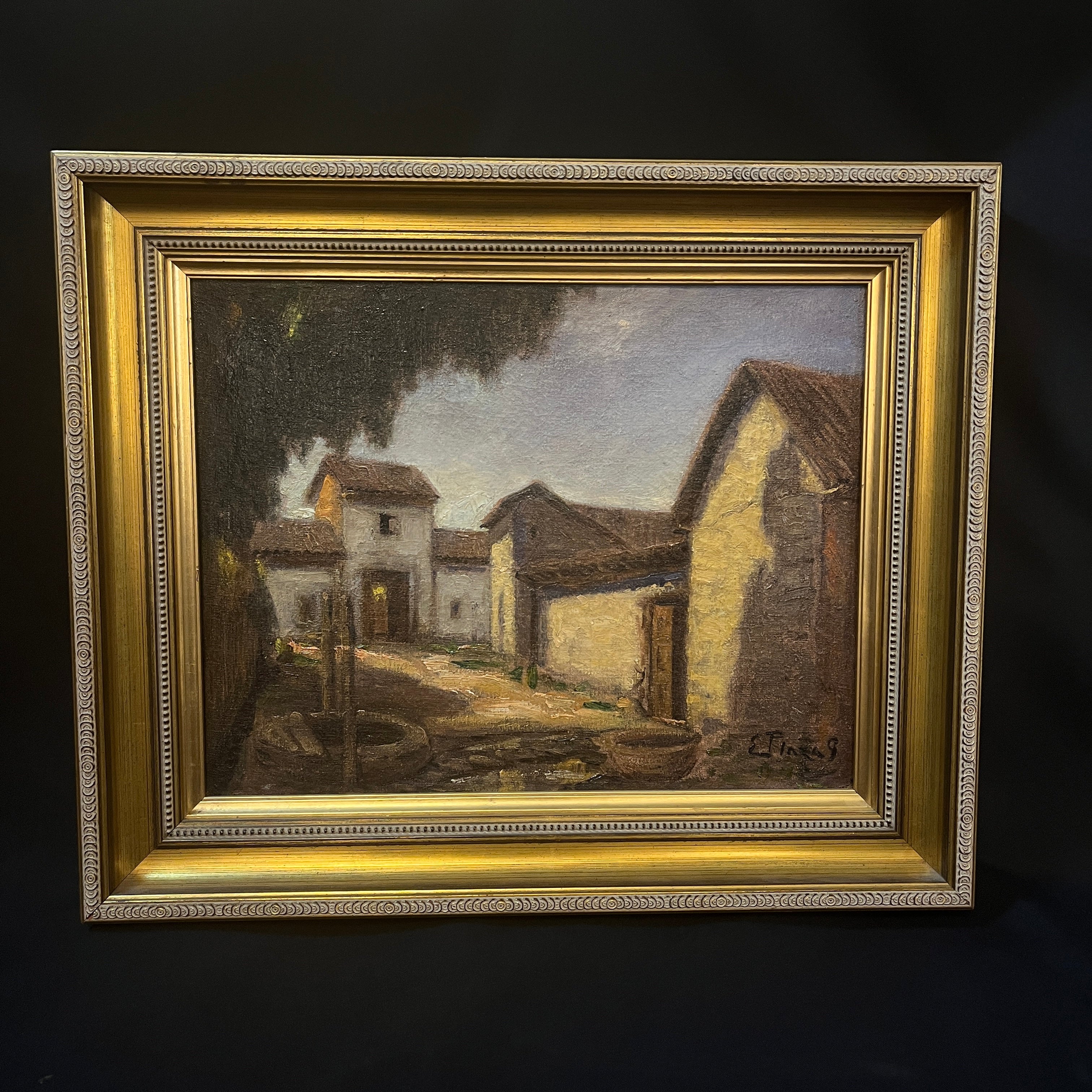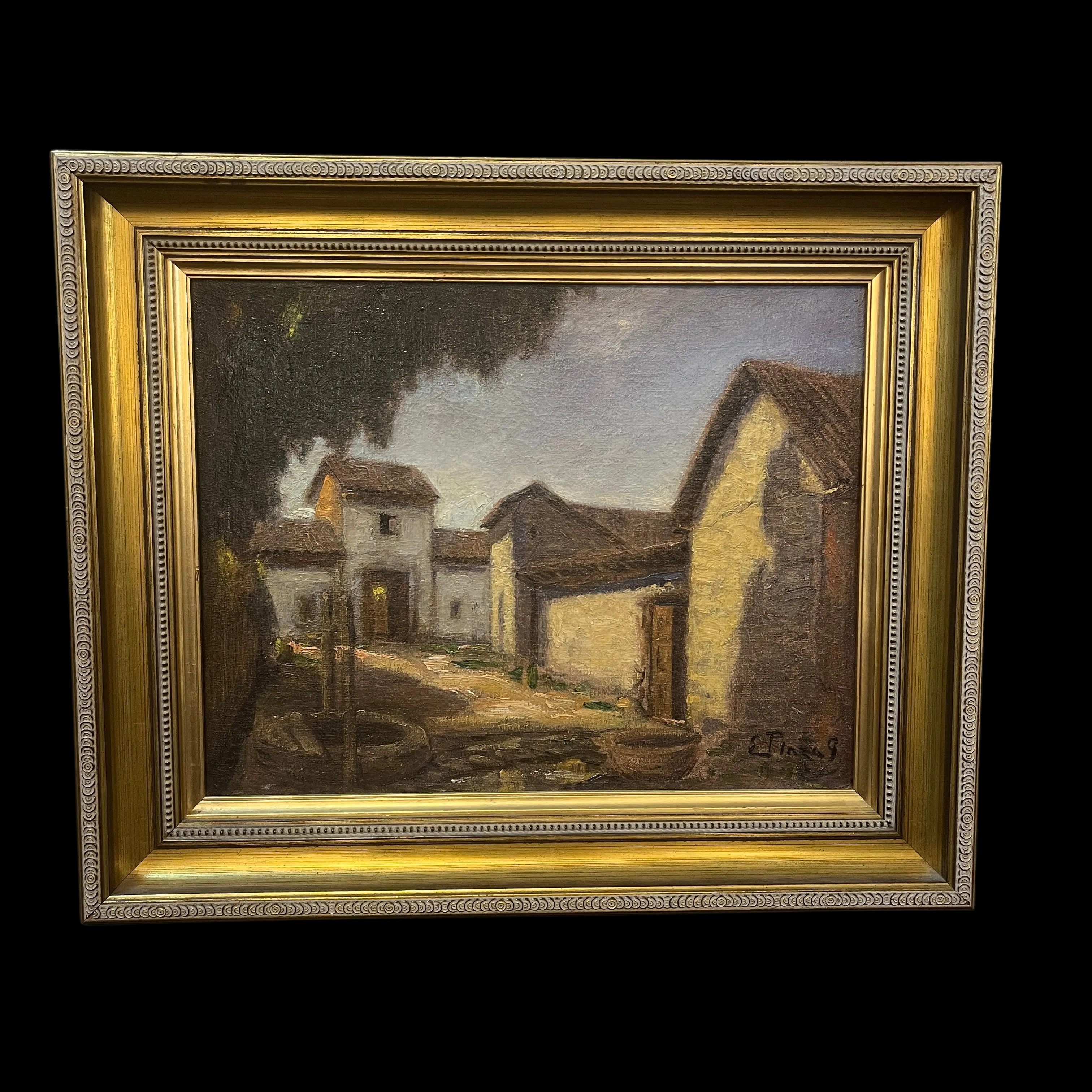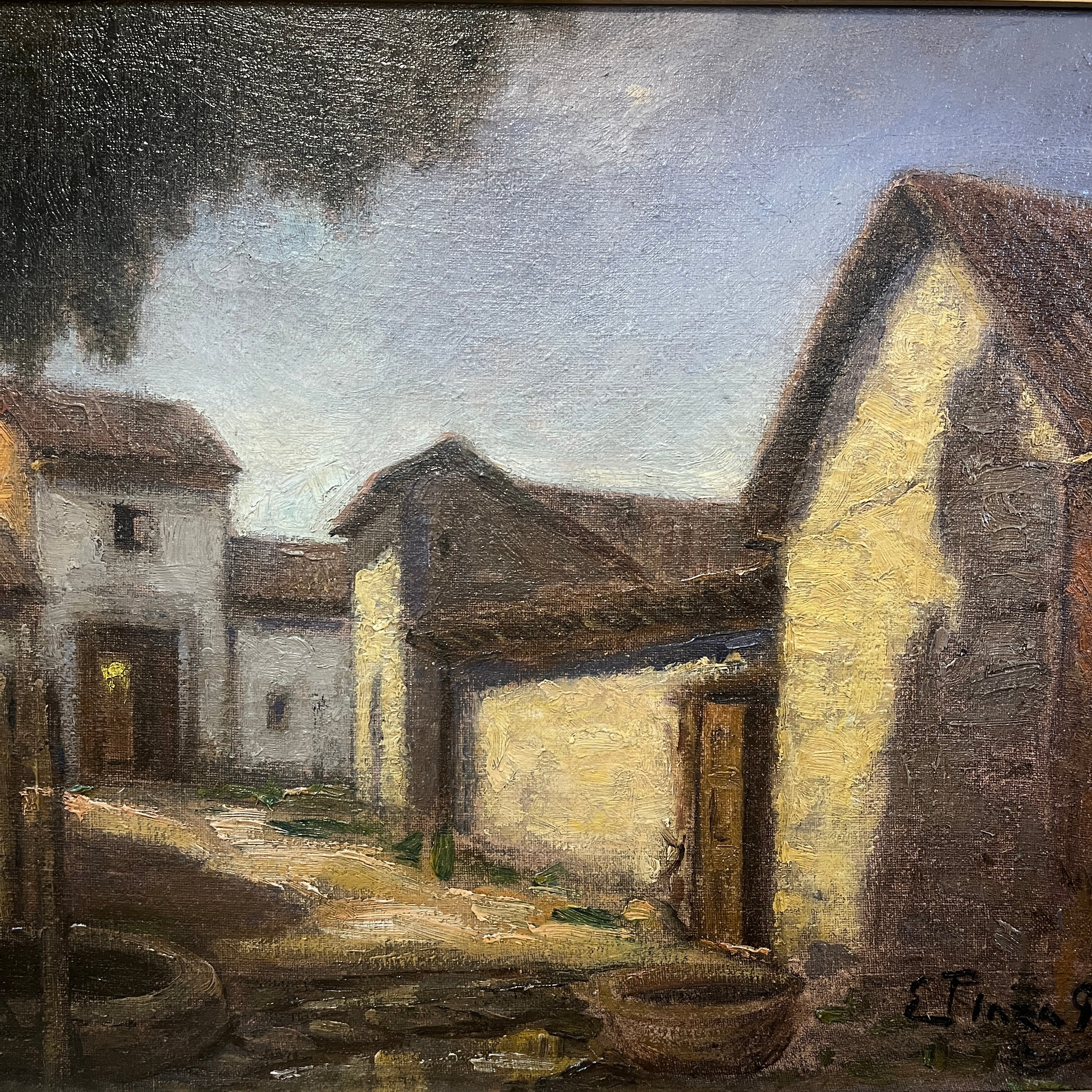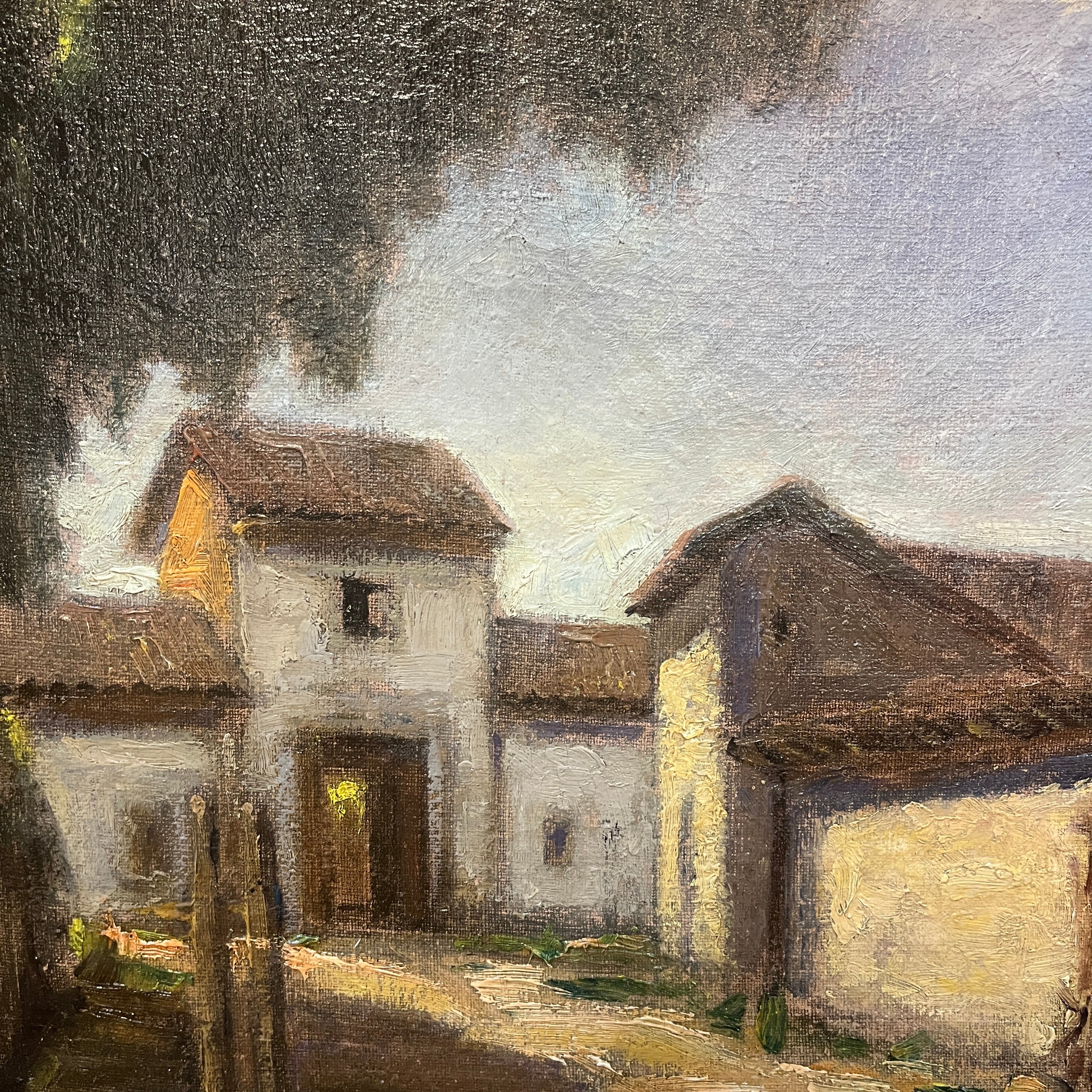 Hermoso óleo del destacado pintor chileno Ezequiel Plaza (1892-1947), parte de la generación del 13. Retrata una bella casona campestre, con sus puertas abiertas y en una esquina un pozo de agua. El artista logra transmitir cierta sensación de estar presenciado un lugar abandonado, a partir del uso de tonos terrosos y una particular preocupación por cautivarnos a partir de una escena cotidiana que todos podemos reconocer. Plaza se destacó por pintar retratos y también paisajes tanto de ciudad como rurales, realzando una estética realista.