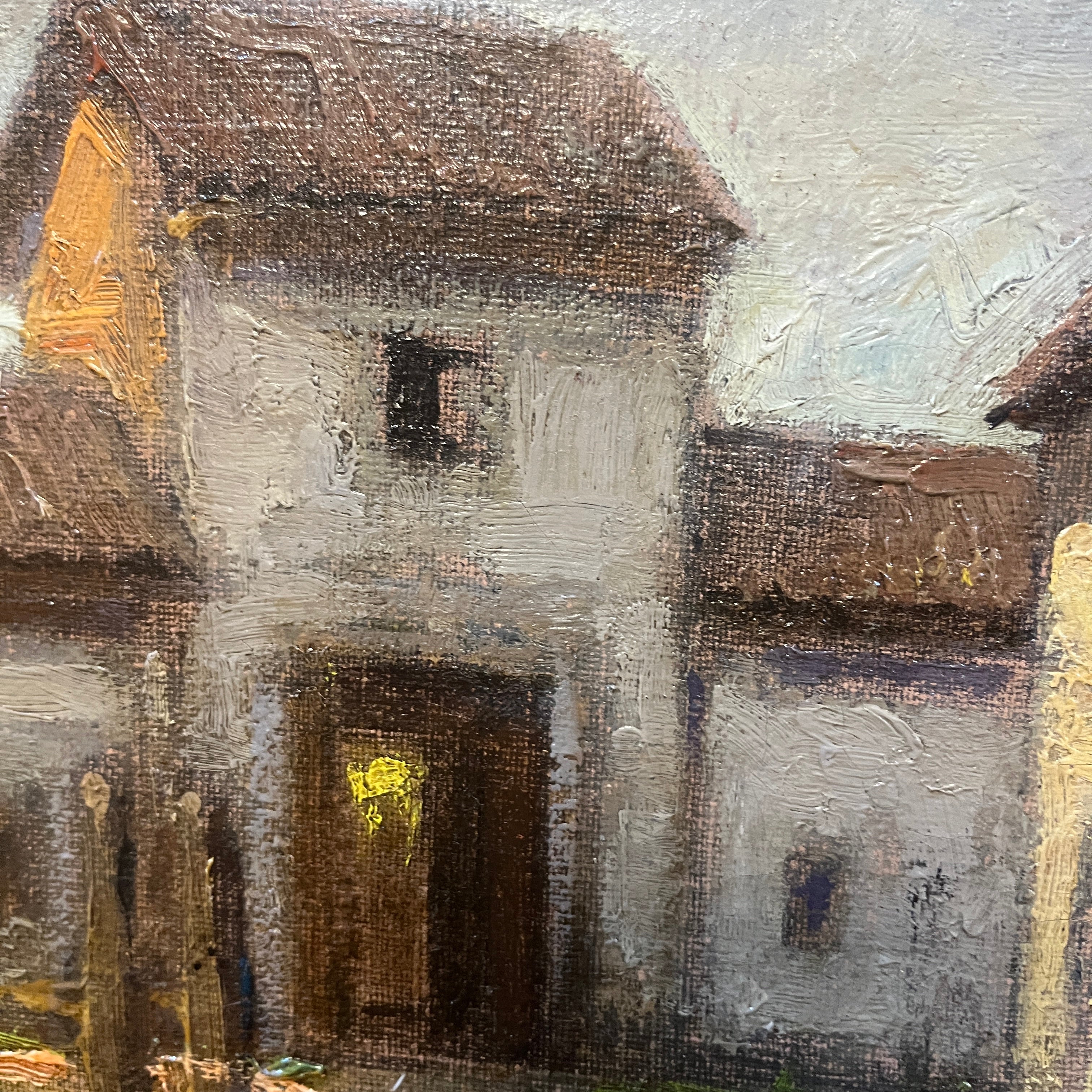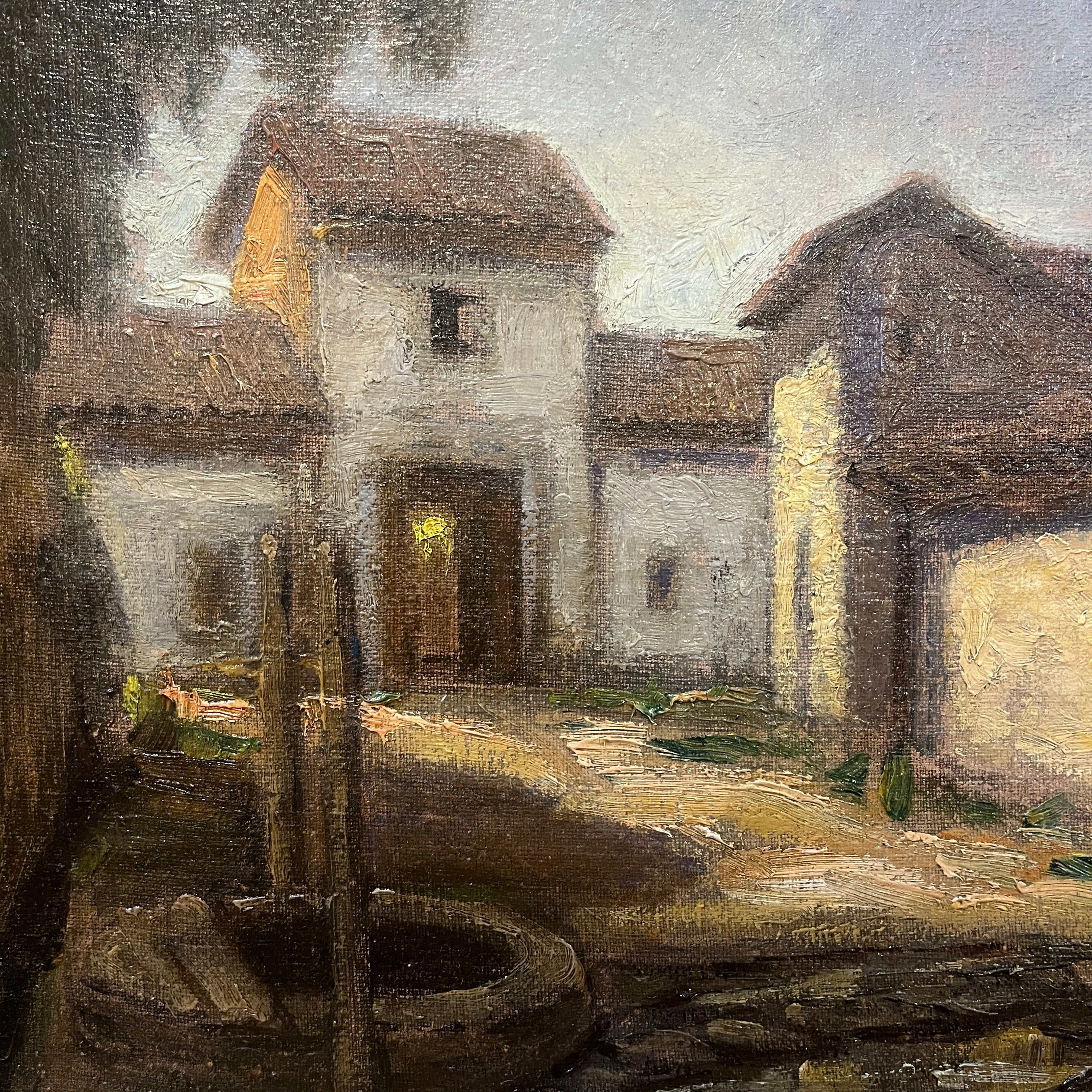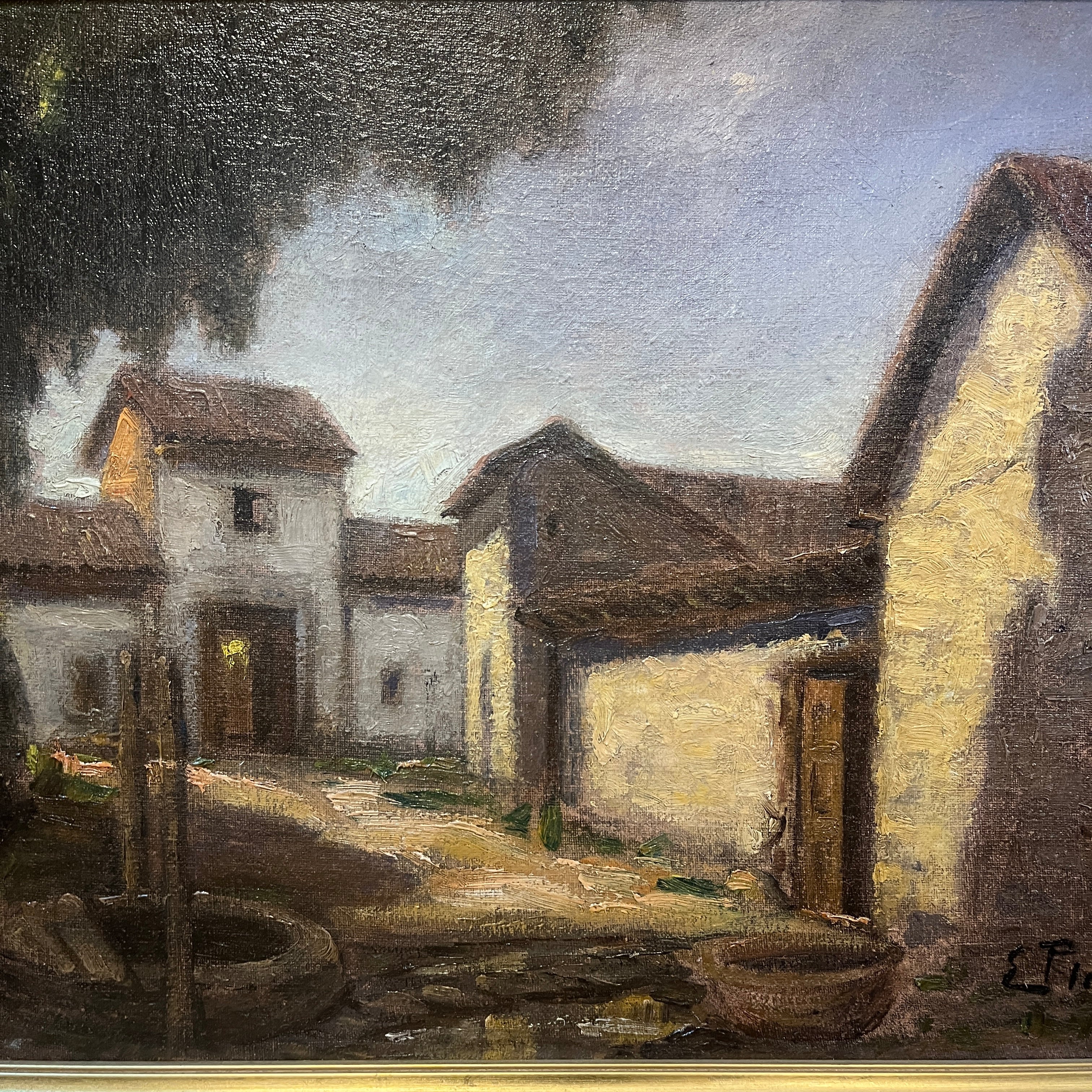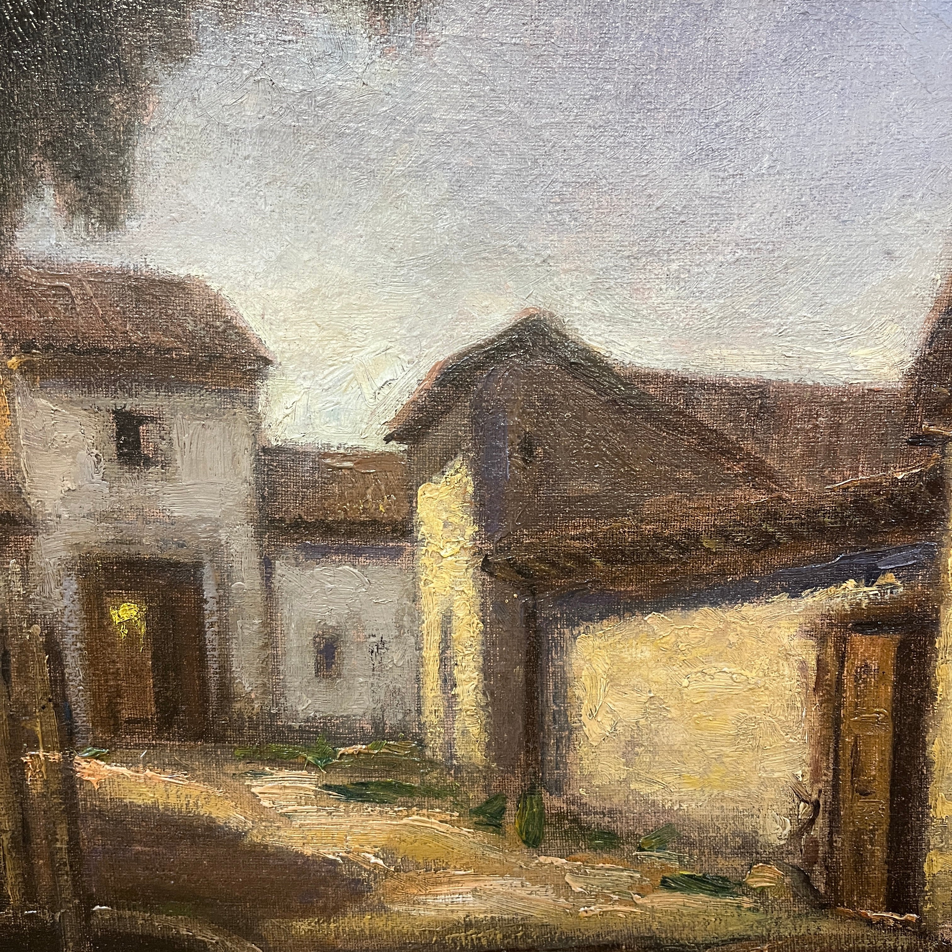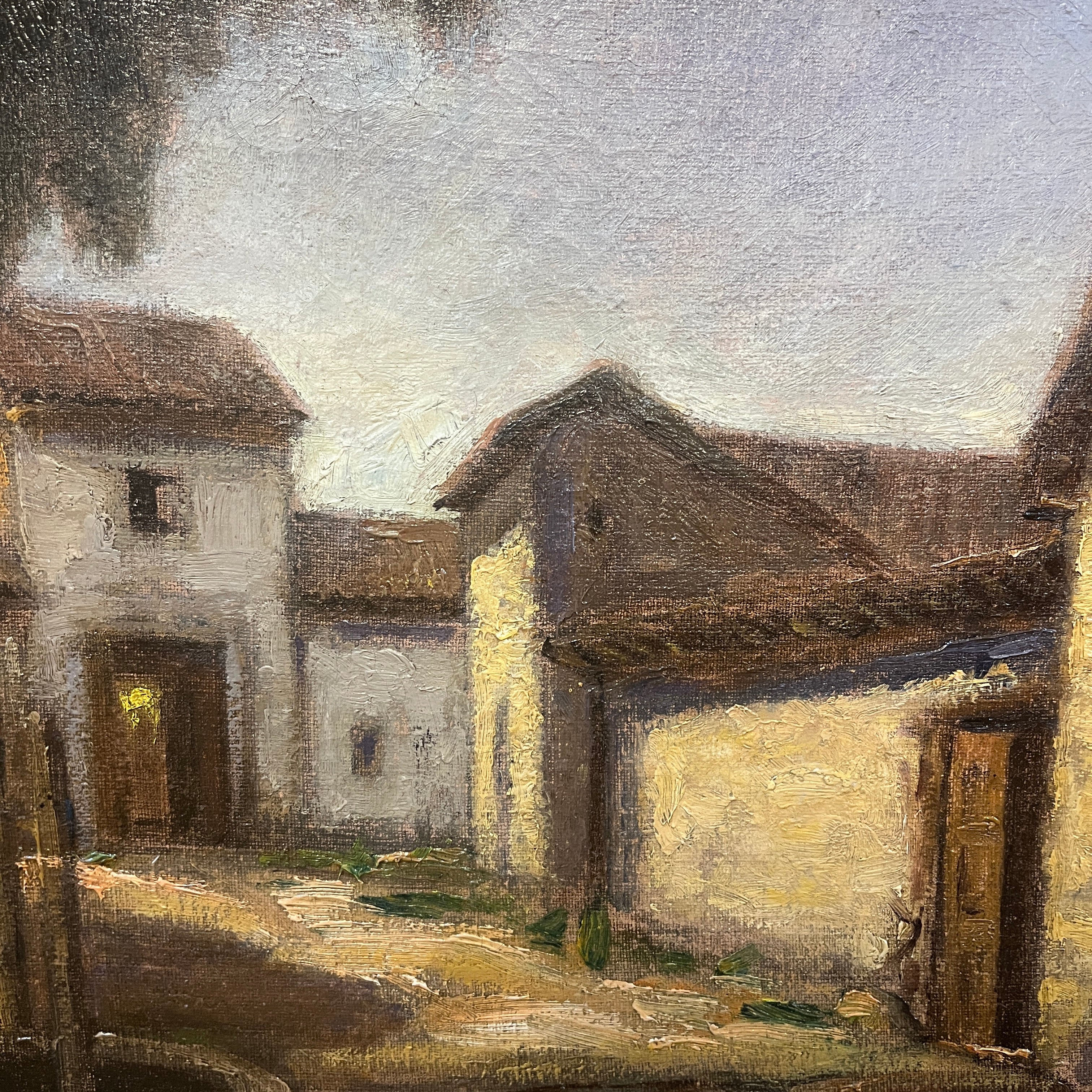 Hermoso óleo del destacado pintor chileno Ezequiel Plaza (1892-1947), parte de la generación del 13. Retrata una bella casona campestre, con sus puertas abiertas y en una esquina un pozo de agua. El artista logra transmitir cierta sensación de estar presenciado un lugar abandonado, a partir del uso de tonos terrosos y una particular preocupación por cautivarnos a partir de una escena cotidiana que todos podemos reconocer. Plaza se destacó por pintar retratos y también paisajes tanto de ciudad como rurales, realzando una estética realista.