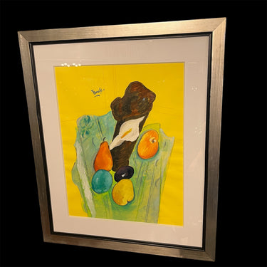 Óleo sobre papel del artista chileno Luis Tejada, representando un bodegón de frutas sobre un mantel en tonos verdes y azules, con un llamativo fondo amarillo. En el centro de la composición hay también una cala. La obra es una interpretación del artista de una temática tan tradicional en la historia del arte, como es el bodegón, dándole su característica impronta de color y geometría. Otro elemento interesante es la proyección de líneas desde el dibujo, sugiriendo una especie de boceto o estudio de perspectiva existente debajo de la pintura. La obra está enmarcada en madera, de diseño sobrio y terminación plateada.