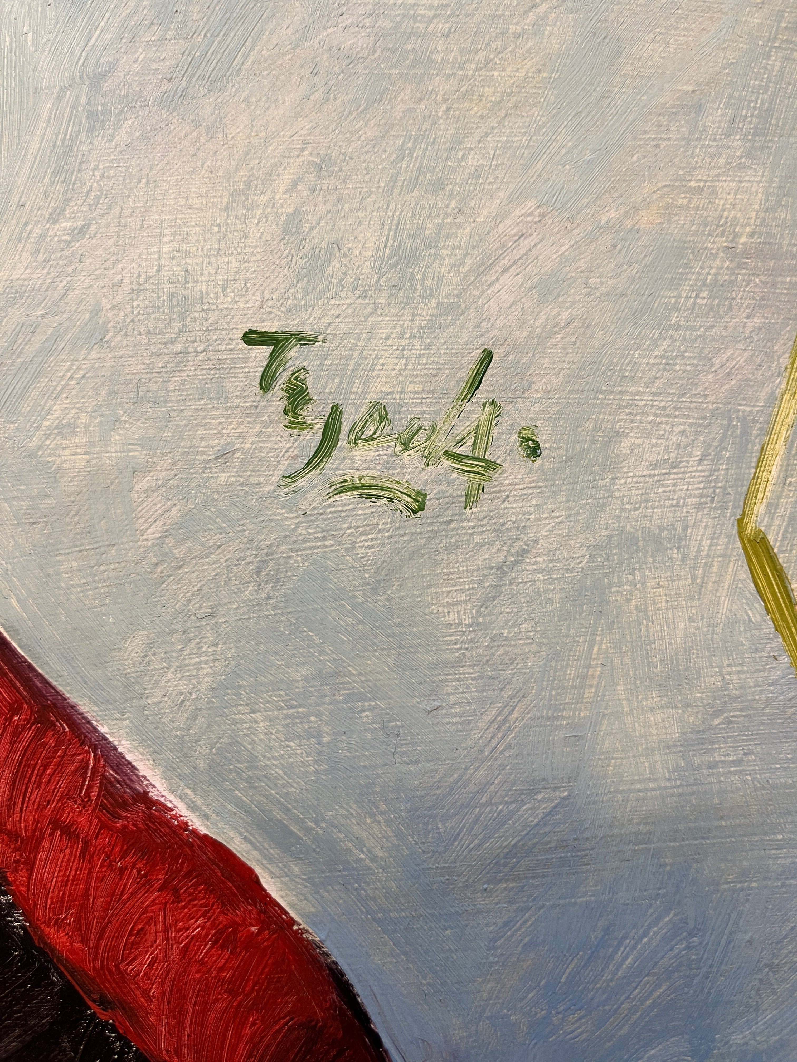 En esta obra, el pintor chileno Luis Tejada, presenta en primer plano la figura de un hombre sentado con la mano empuñada y alzada con un fondo abstracto de gran intensidad cromática dominada por tonos rojizos y amarillos.