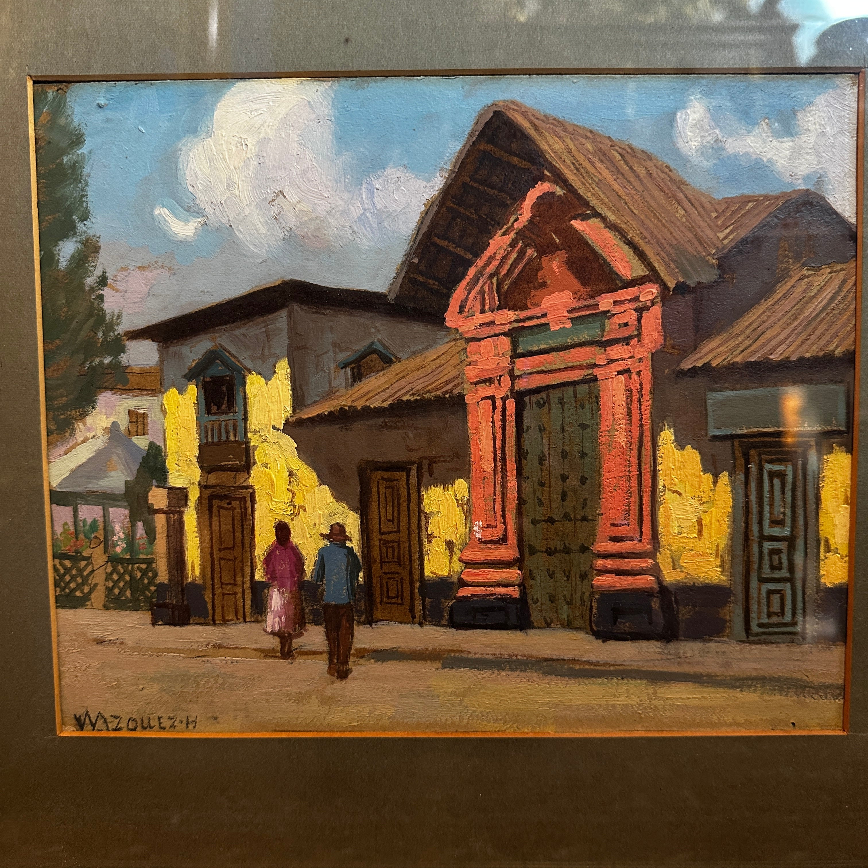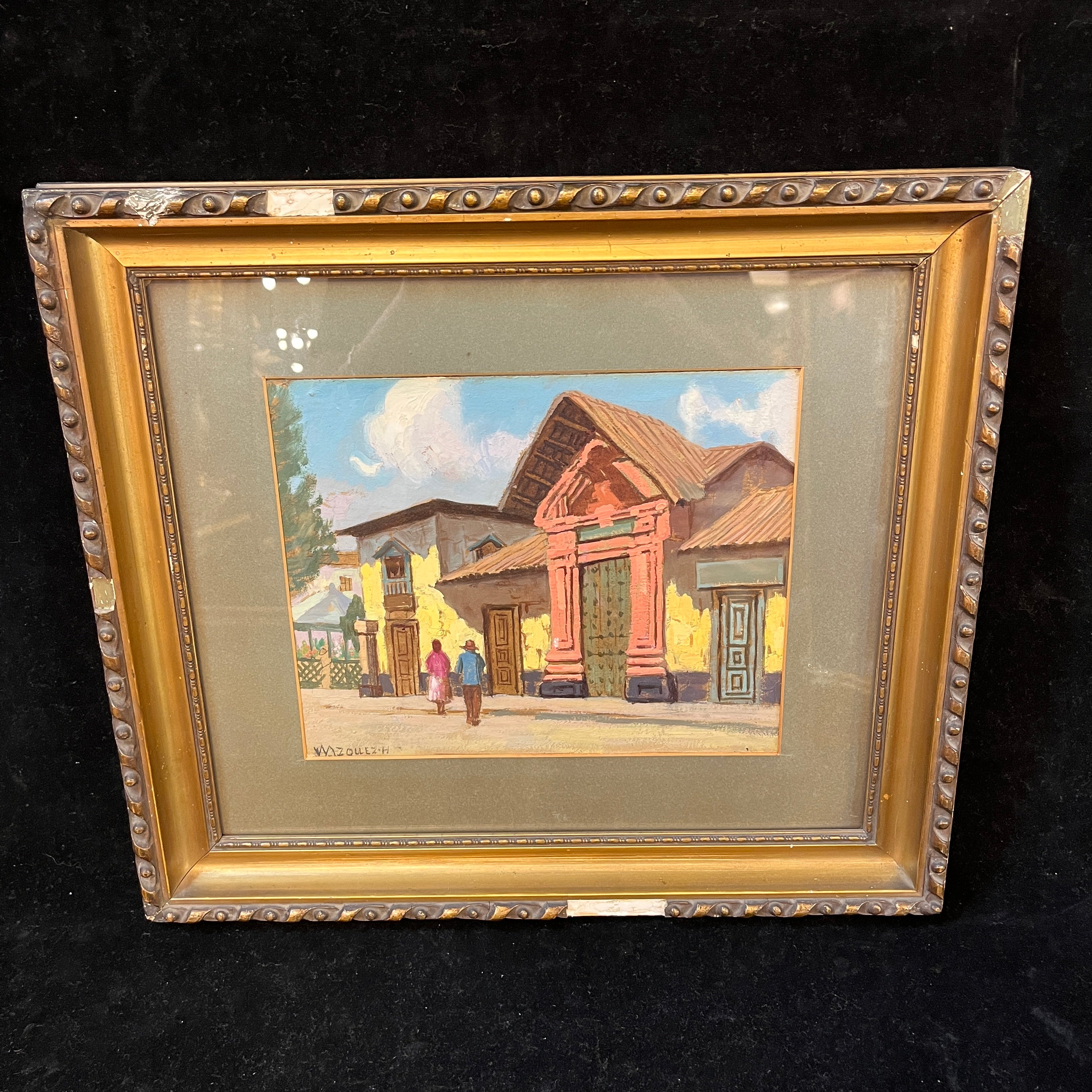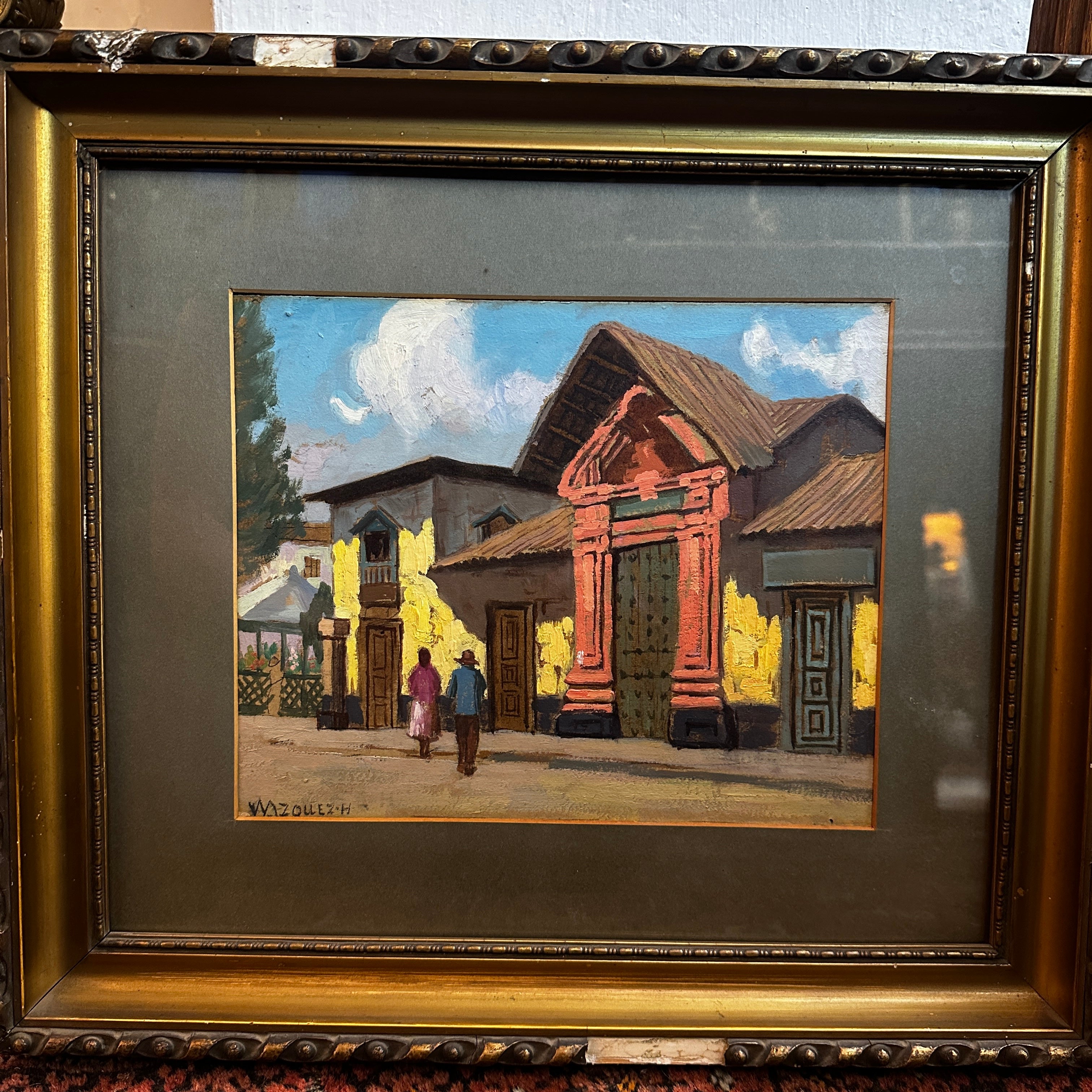 Óleo sobre cartón del artista de origen chileno Ulises Vázquez Hernández, miembro de la generación del trece. La obra representa una escena pueblerina en la que dos personas caminan frente a la fachada de un edificio de adobe, pintado de rojo y amarillo. Por el tamaño de la puerta en el frontis, podría tratarse de una escuela u otro edificio público. La obra está enmarcada con un paspartú gris y madera tallada en relieves y pintada en un tono cobrizo.
