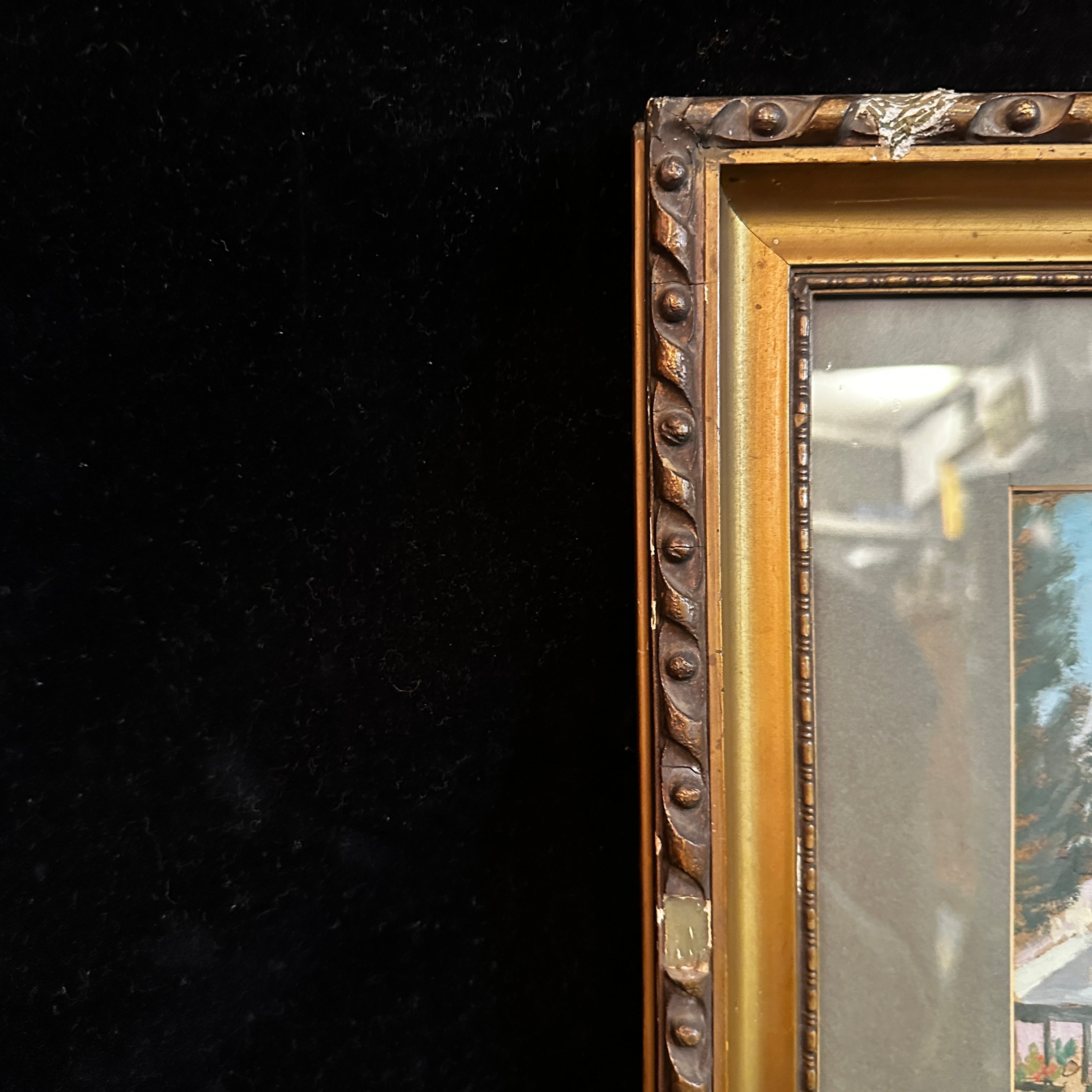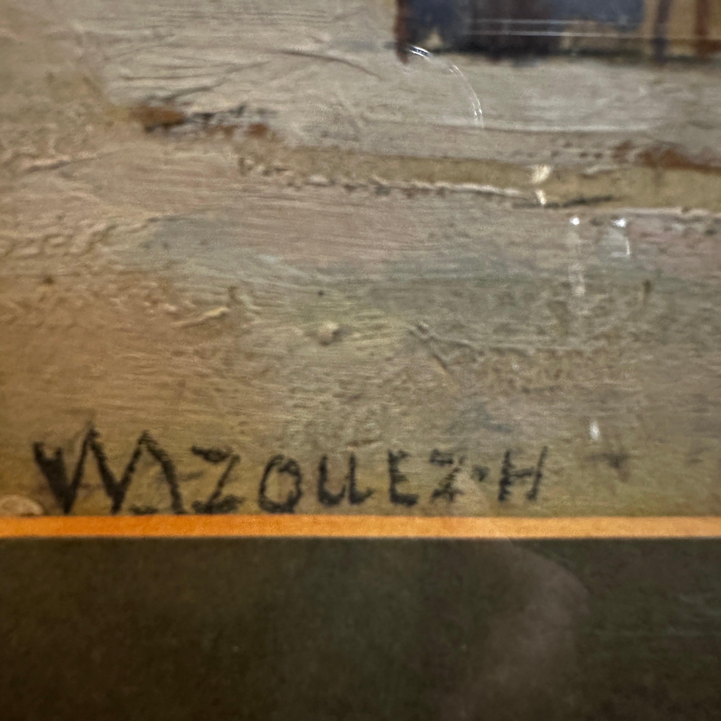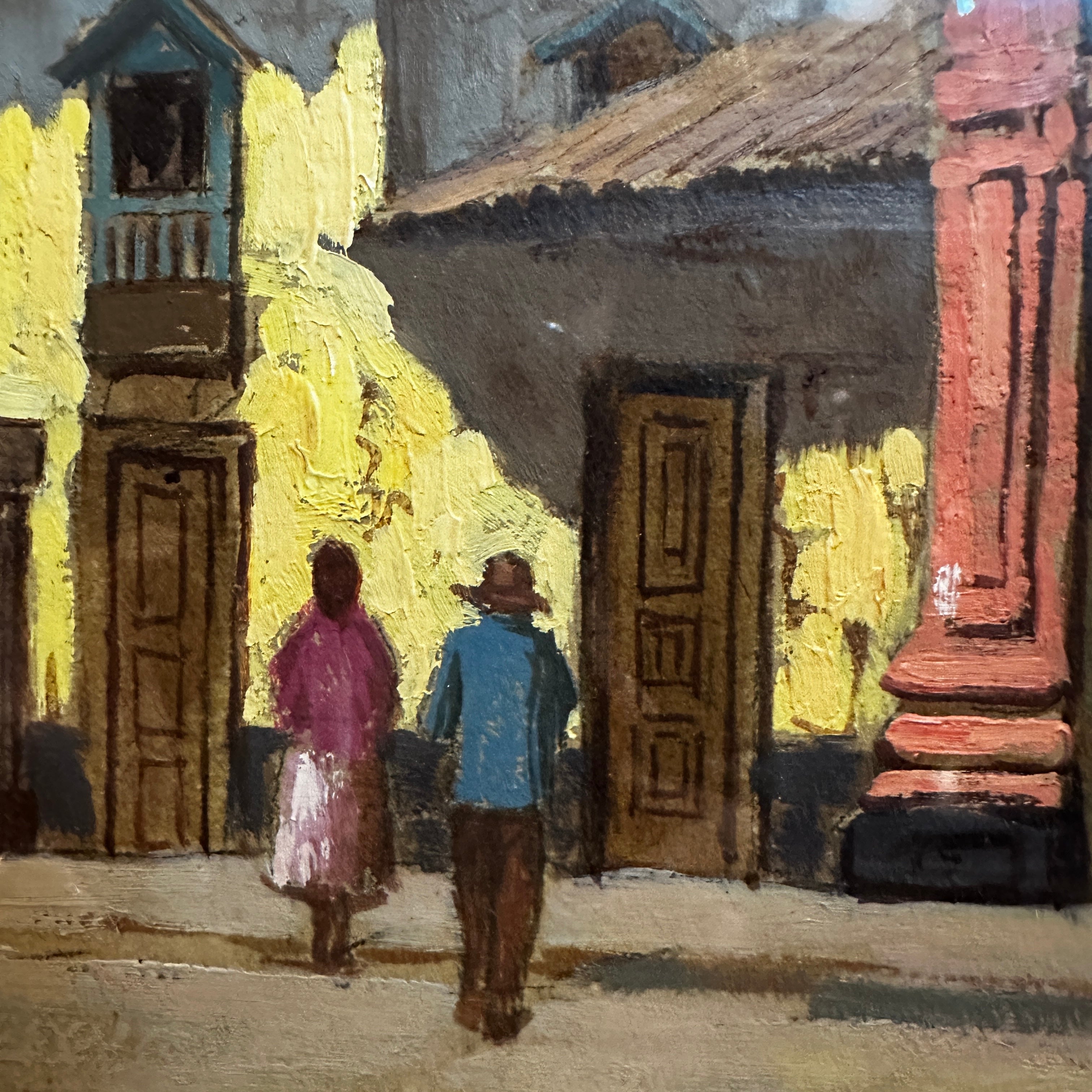 Óleo sobre cartón del artista de origen chileno Ulises Vázquez Hernández, miembro de la generación del trece. La obra representa una escena pueblerina en la que dos personas caminan frente a la fachada de un edificio de adobe, pintado de rojo y amarillo. Por el tamaño de la puerta en el frontis, podría tratarse de una escuela u otro edificio público. La obra está enmarcada con un paspartú gris y madera tallada en relieves y pintada en un tono cobrizo.